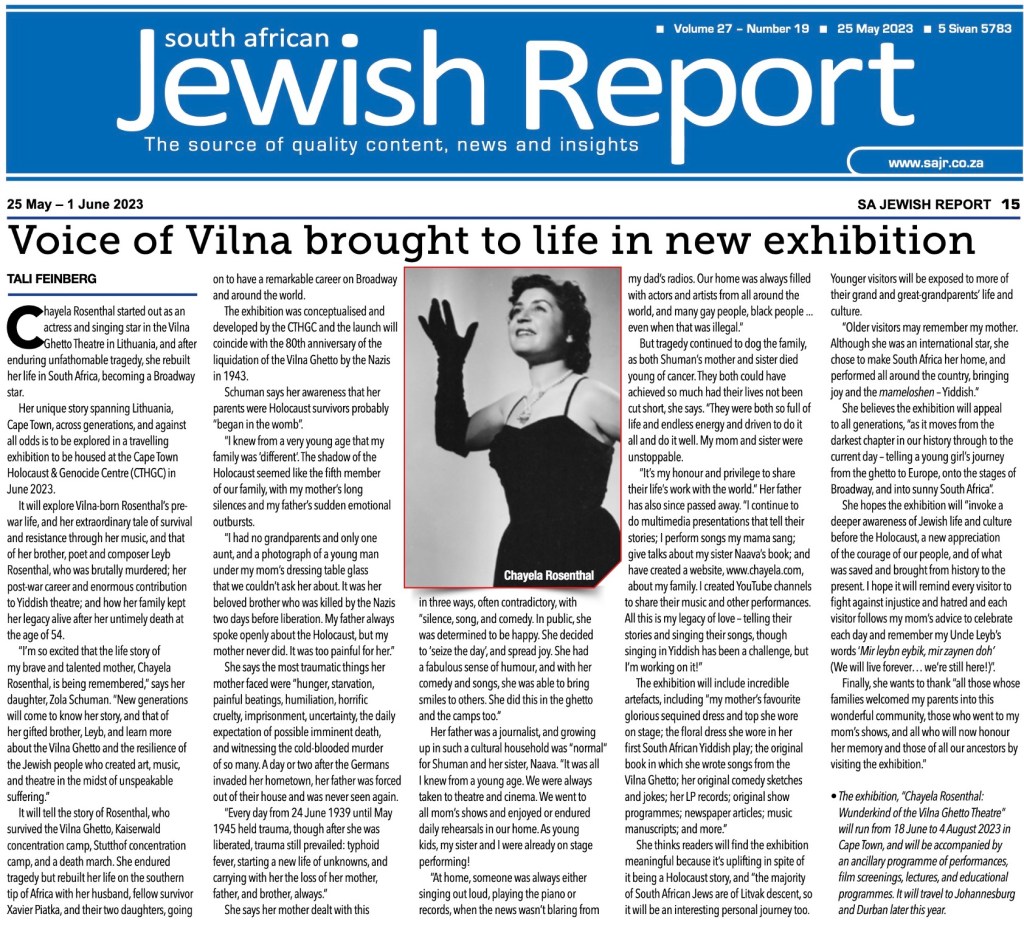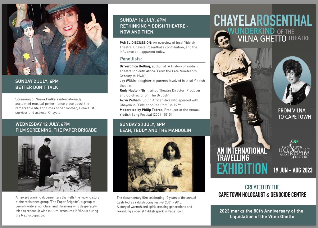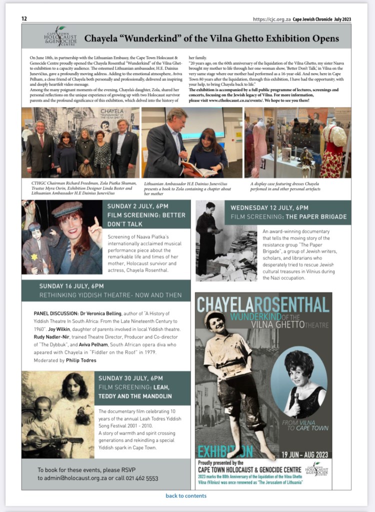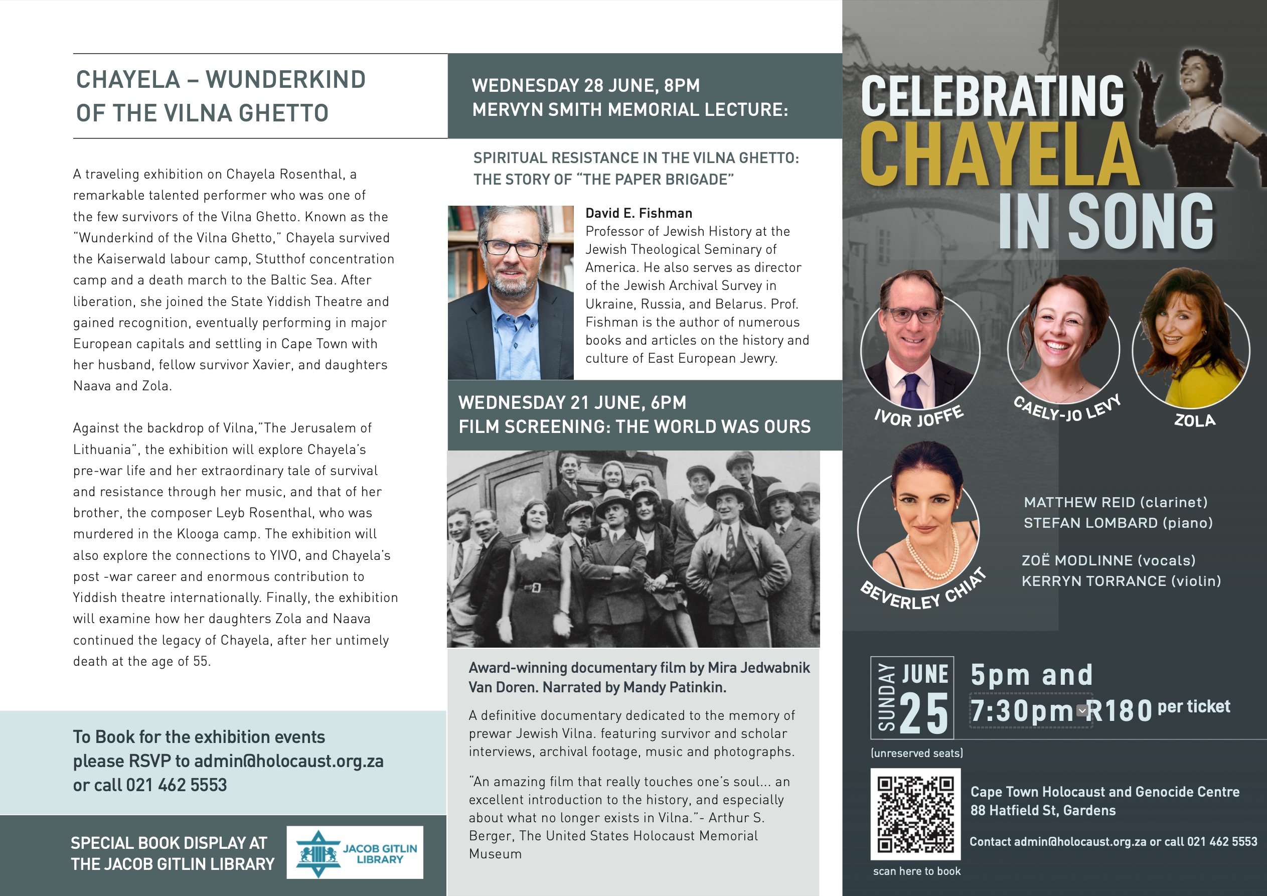 In June, 2023, the international travelling exhibition “Chayela Rosenthal – Wunderkind of the Vilna Ghetto” opened at the Cape Town Holocaust & Genocide Centre in South Africa. The launch of the exhibition coincided with the 80th anniversary of the liquidation of the Vilna Ghetto by the Nazis in 1943.