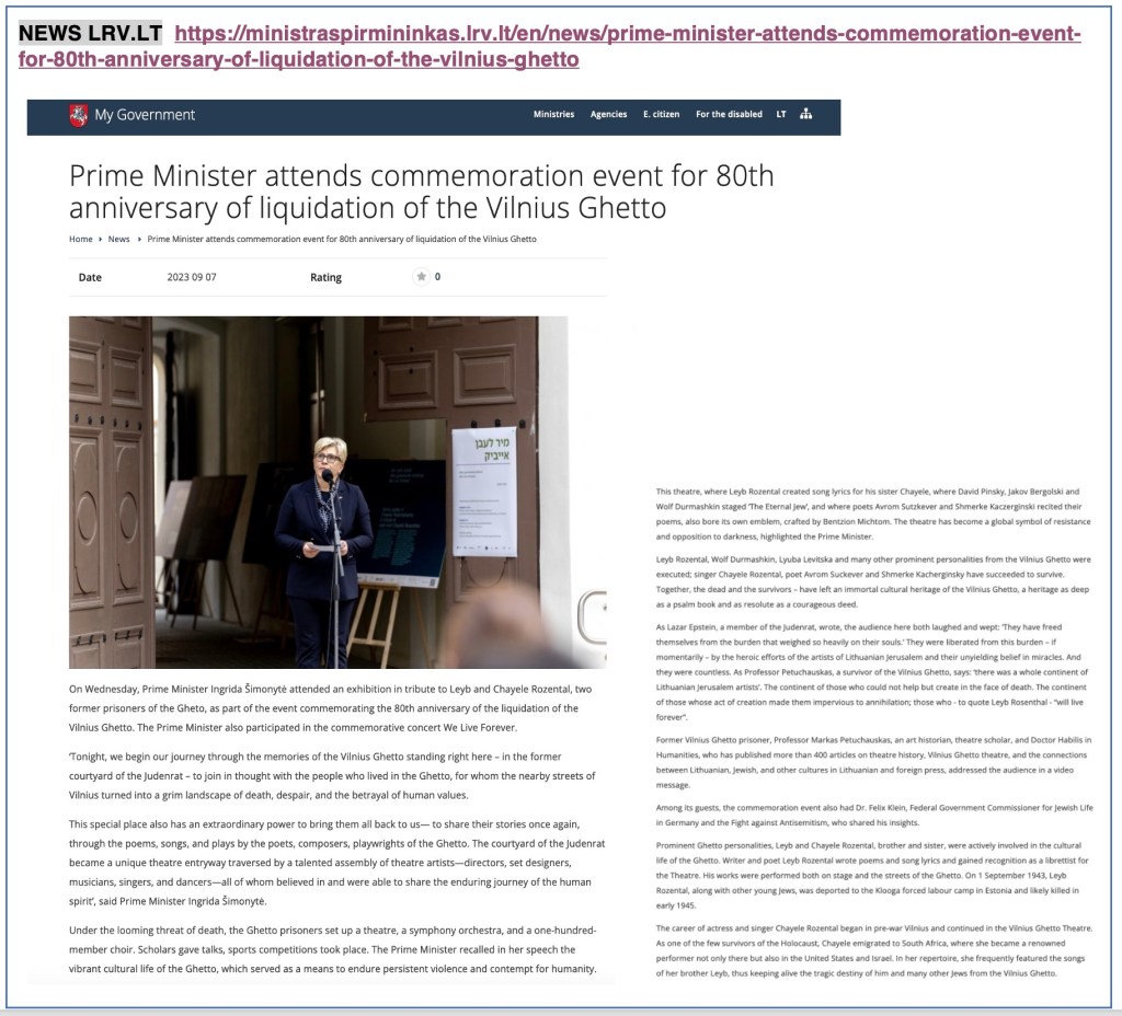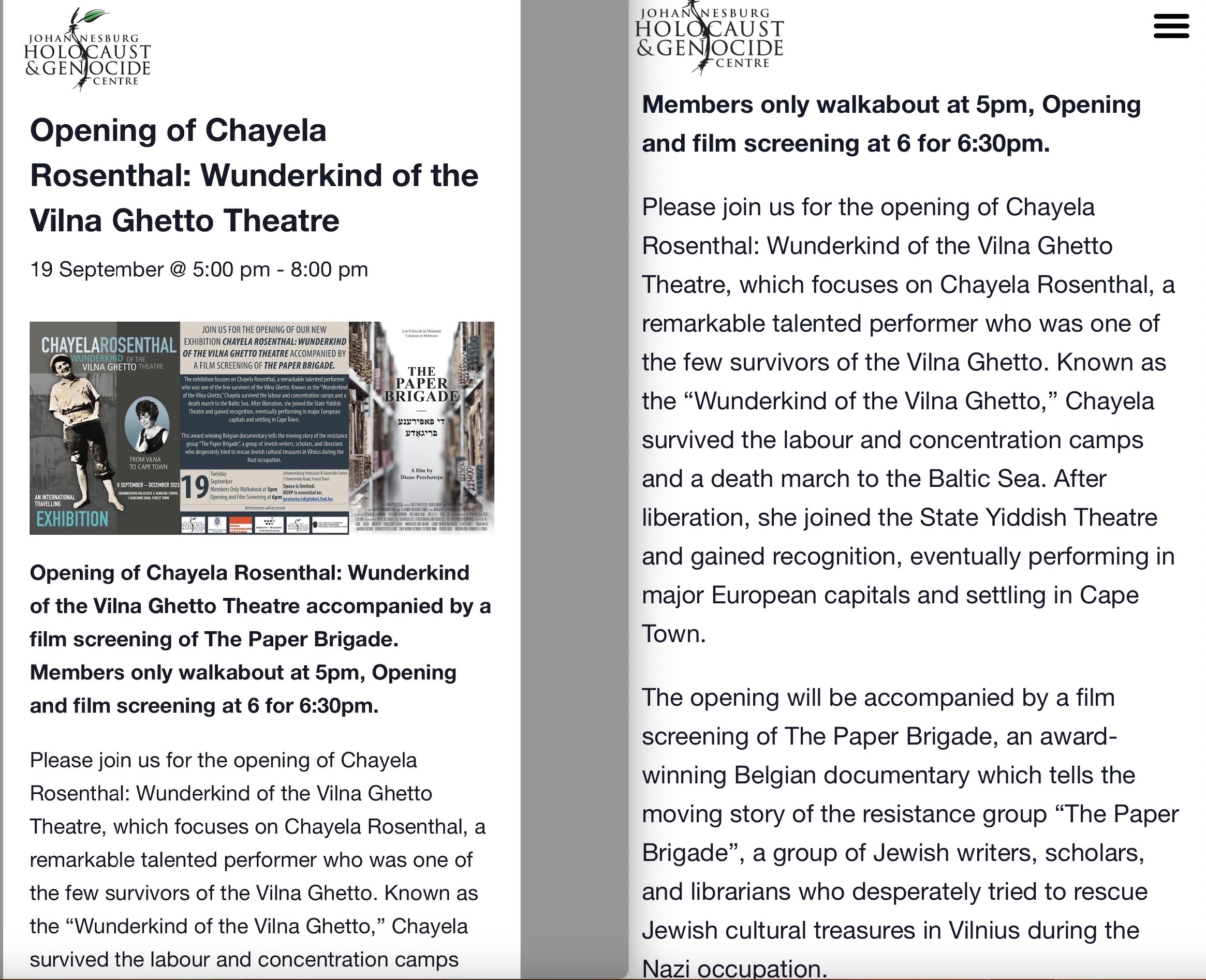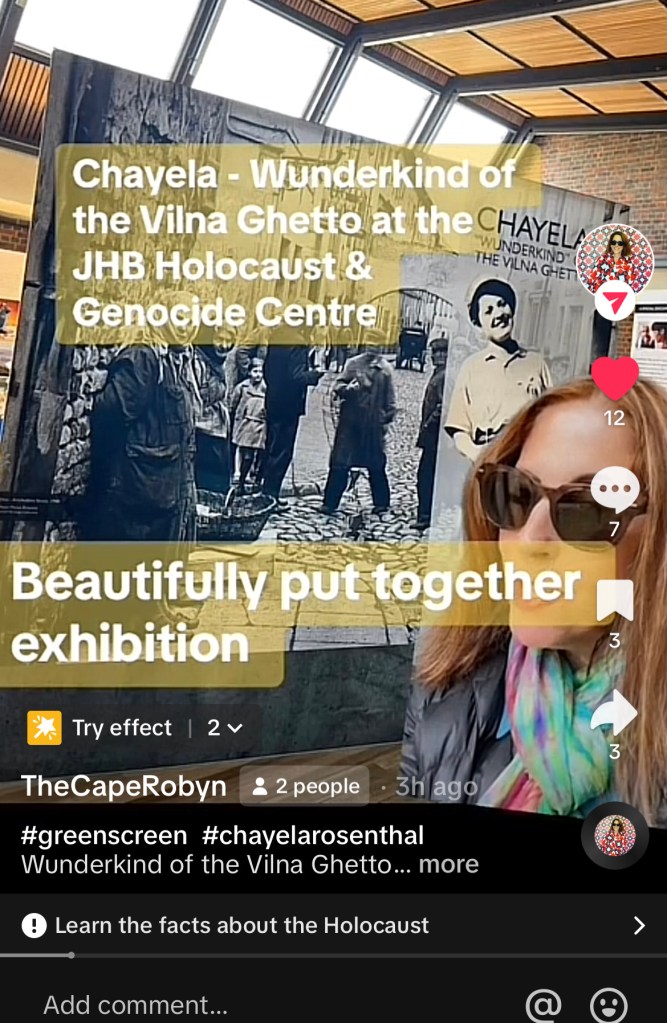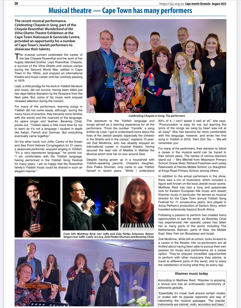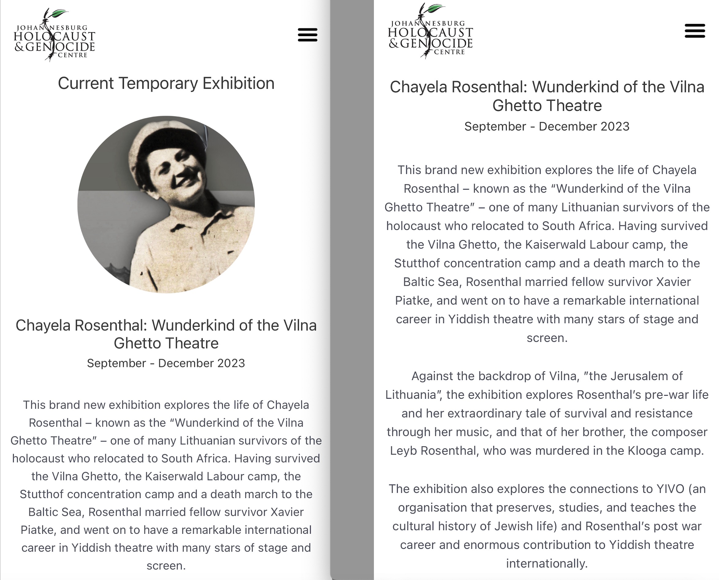 In June, 2023, the international travelling exhibition “Chayela Rosenthal – Wunderkind of the Vilna Ghetto” opened at the Cape Town Holocaust & Genocide Centre in South Africa. The launch of the exhibition coincided with the 80th anniversary of the liquidation of the Vilna Ghetto by the Nazis in 1943.