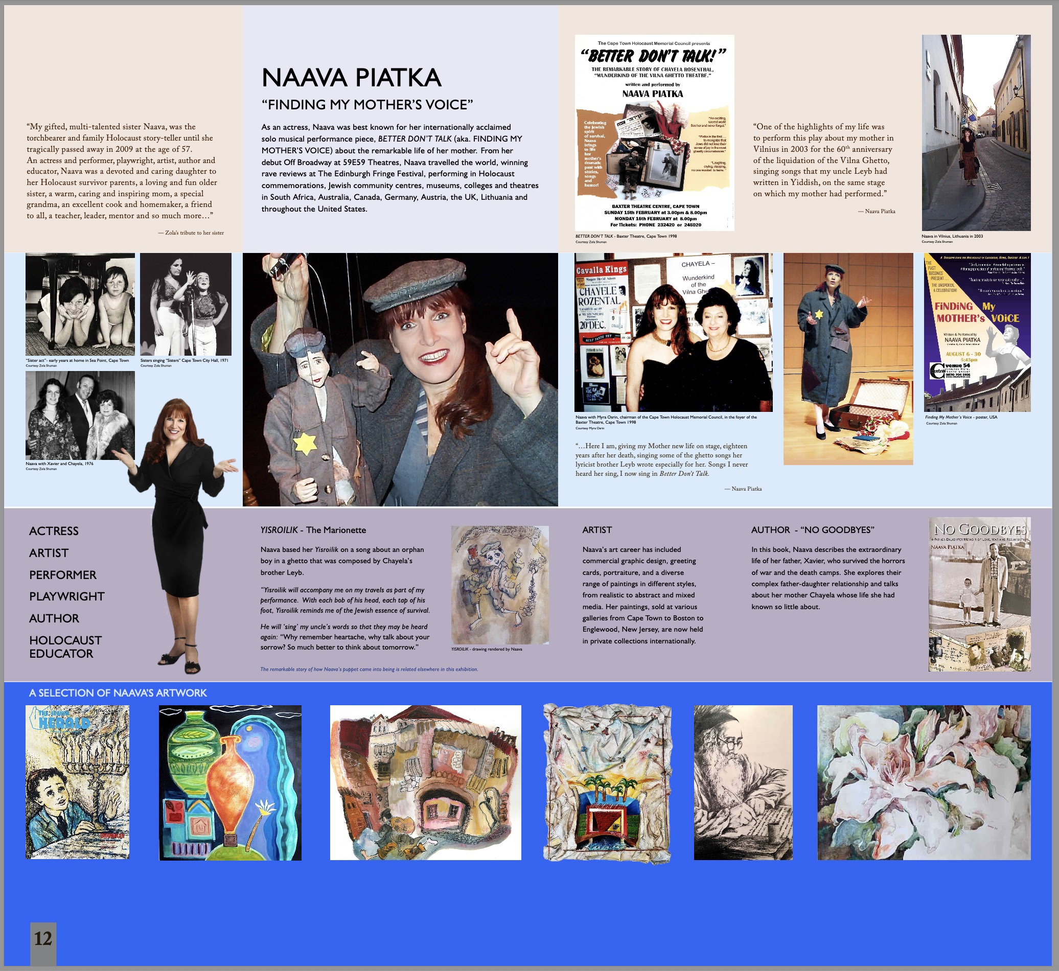 Amongst the Holocaust survivors, was Vilna born Yiddish Actress and singing star of the Vilna Ghetto Theatre, Chayela Rosenthal. After having survived the Vilna Ghetto, Kaiserwald Labour camp, Stutthof concentration camp and a death march to the Baltic Sea, Chayela married fellow survivor Xavier Piatka, and went on to have a remarkable international career in Yiddish theatre on Broadway and all around the world, with many stars of stage and screen.