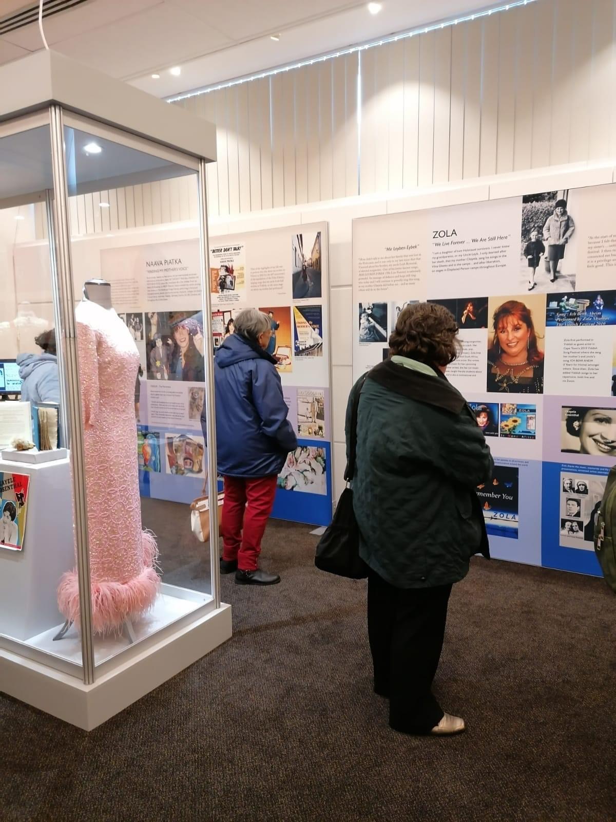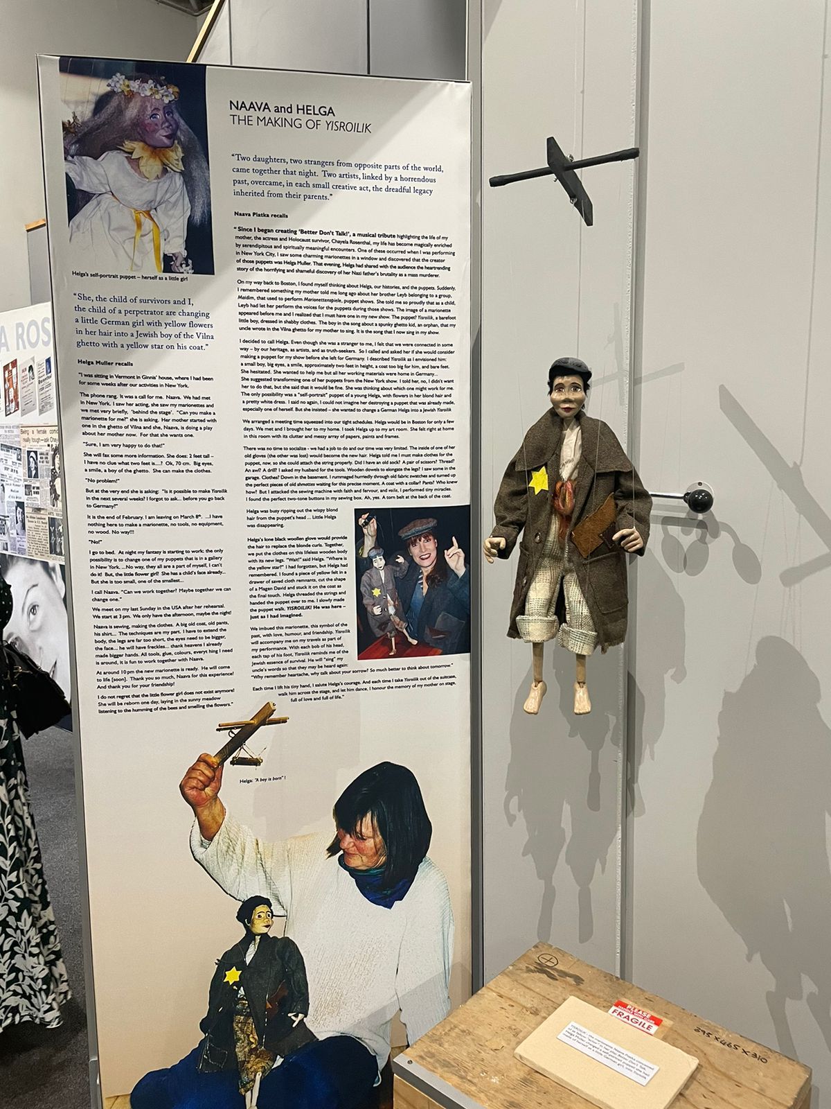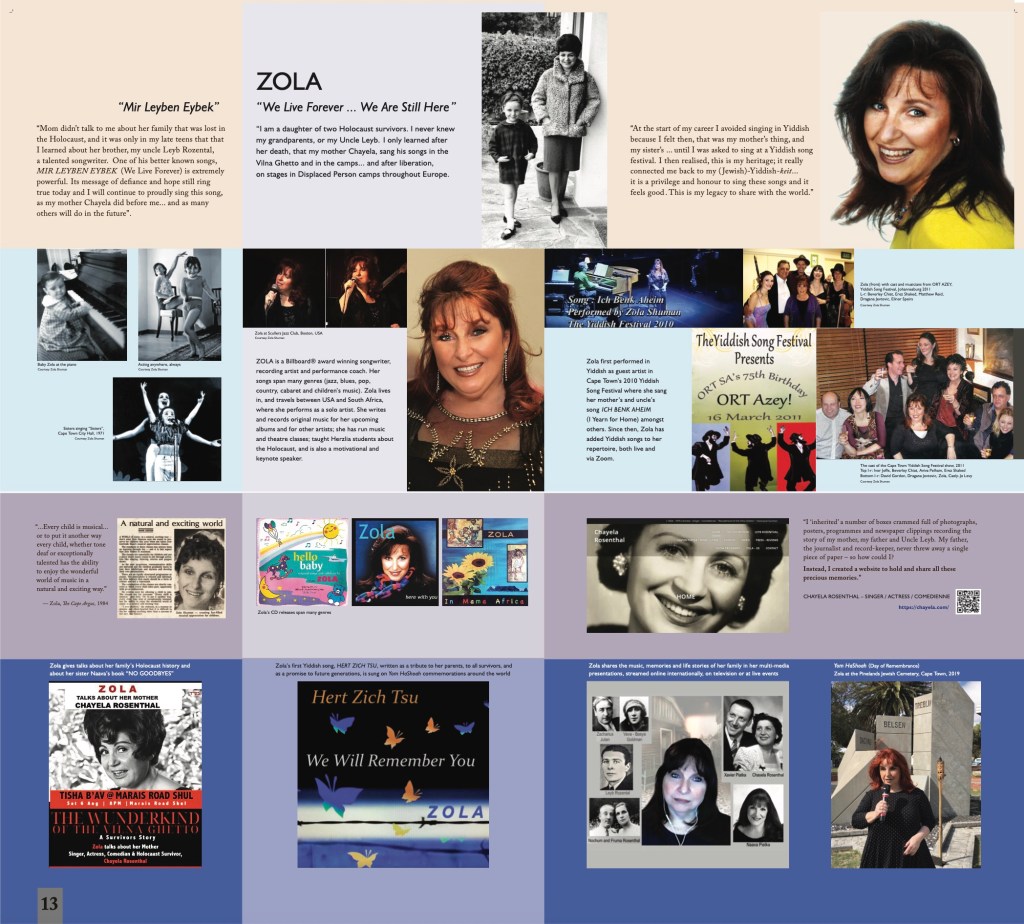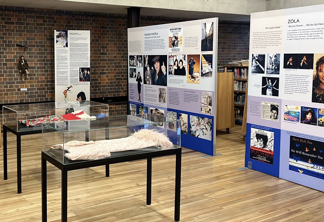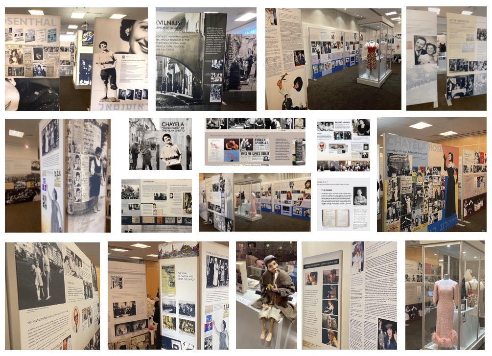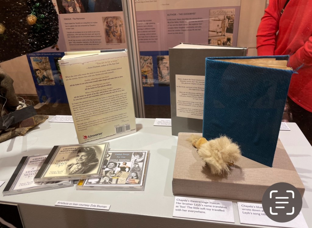 The top and dresses Chayela wore on stage, The Blue Book where she wrote down all the songs her brother and others wrote in the Vilna Ghetto, her fluffy little mascot lion she called Leyb, the puppet YISROILIK, NO GOODBYES- the book about her life, IN SACRED MEMORY – the book featuring Chayela and Xavier’s ( and other South African survivors’) testimonies, Chayela songs recorded on CD and one of her LP album covers.
