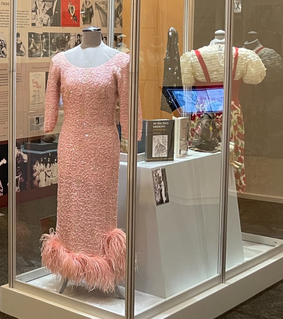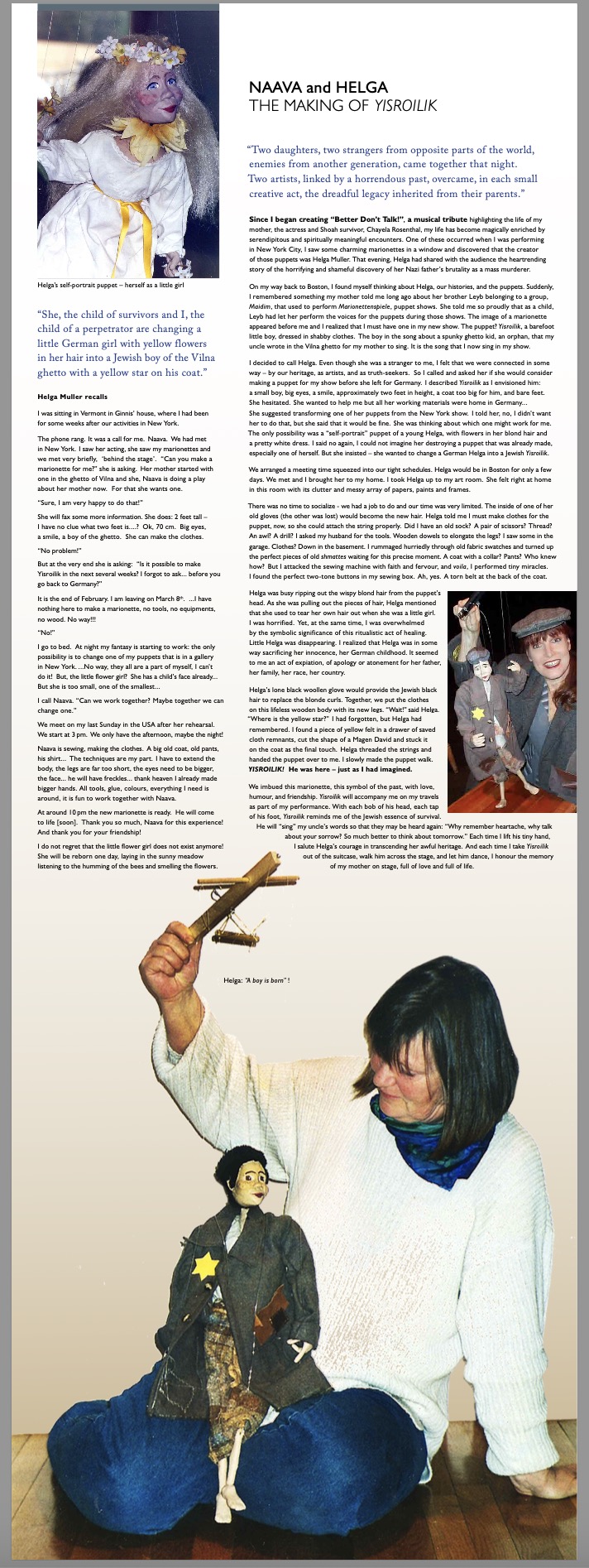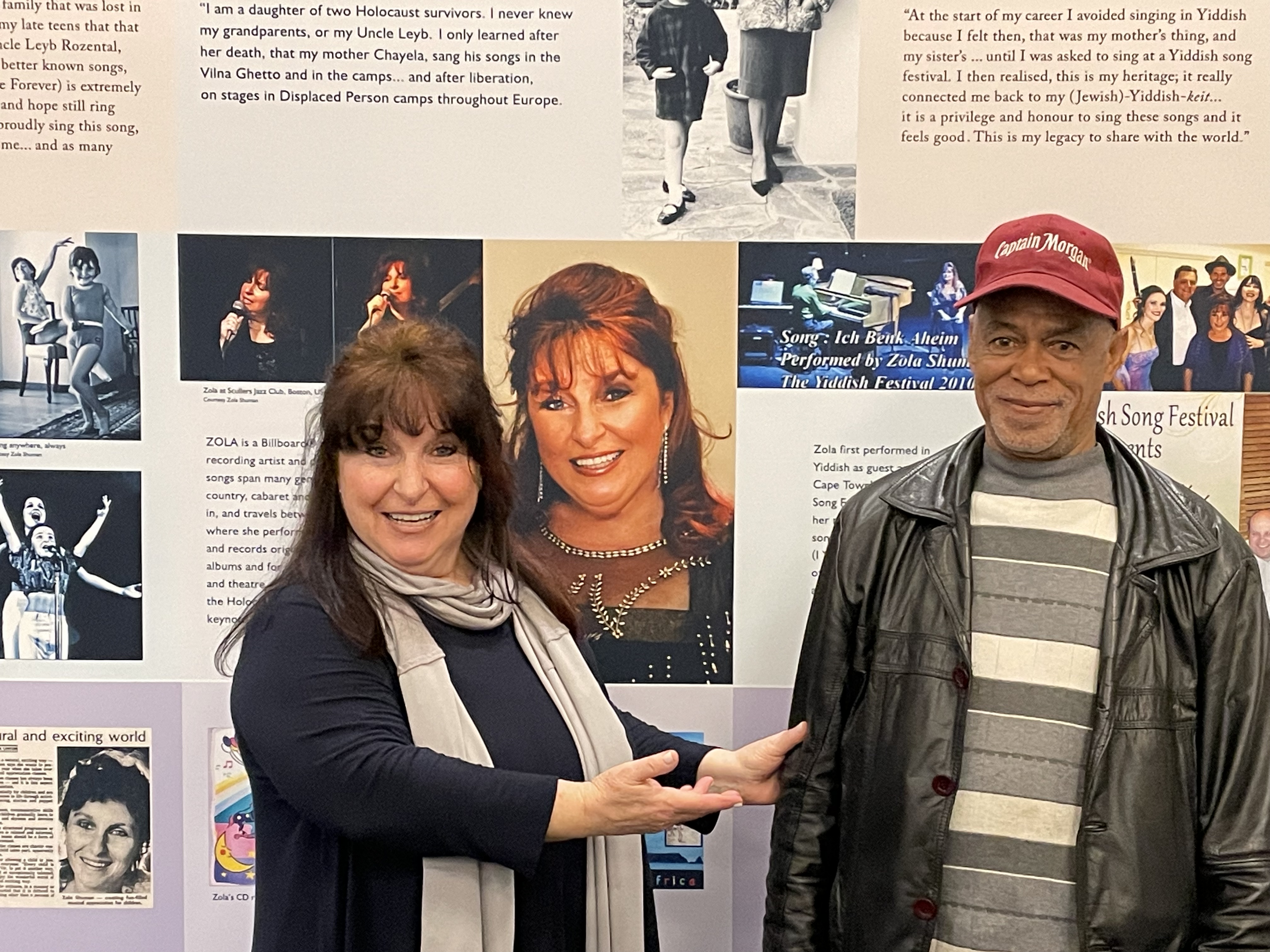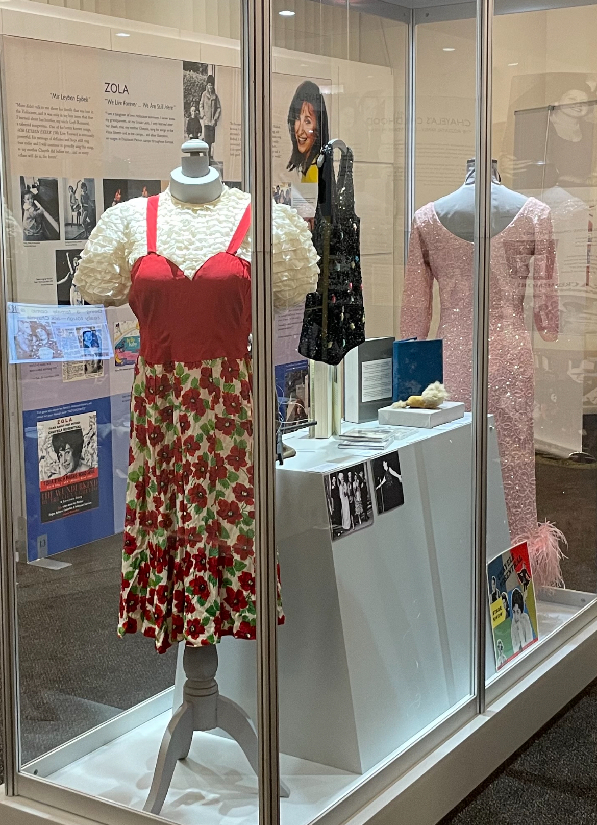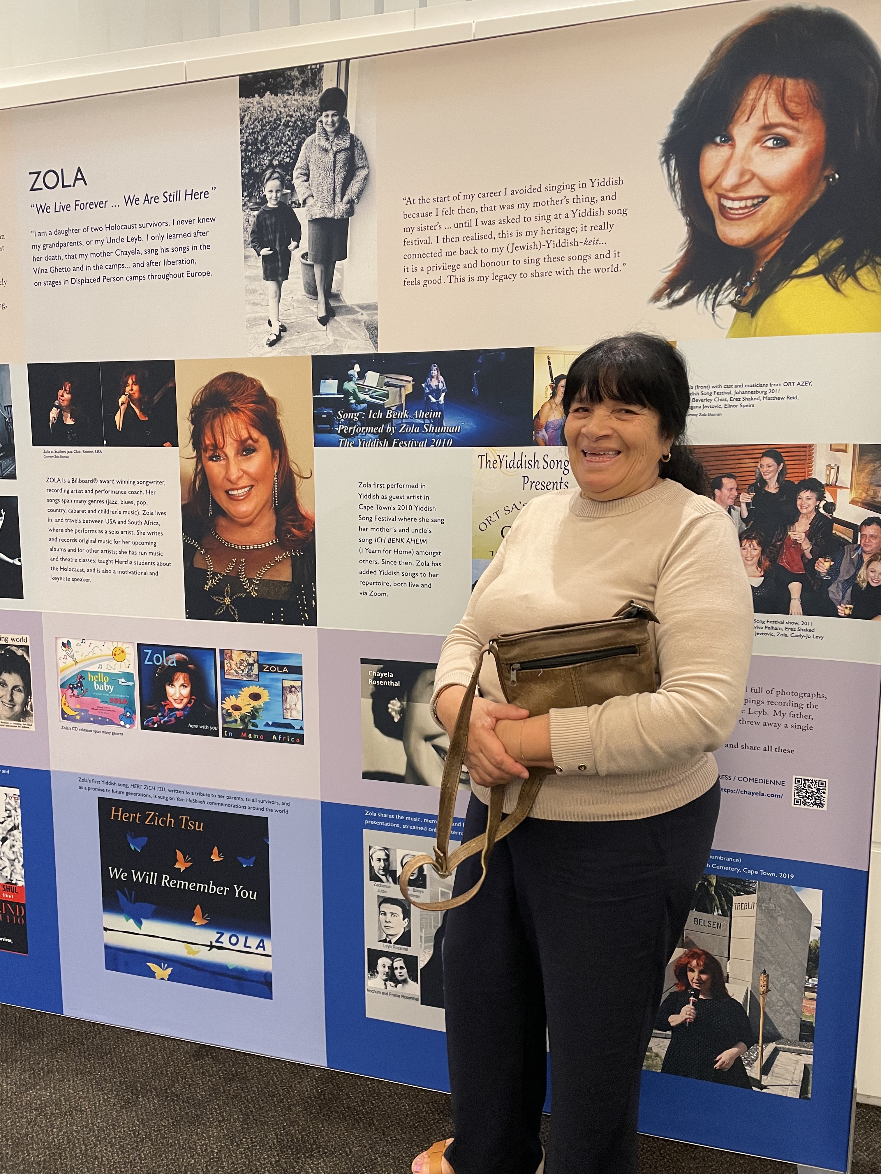 The top and dresses Chayela wore on stage, The Blue Book where she wrote down all the songs her brother and others wrote in the Vilna Ghetto, her fluffy little mascot lion she called Leyb, the puppet YISROILIK, NO GOODBYES- the book about her life, IN SACRED MEMORY – the book featuring Chayela and Xavier’s ( and other South African survivors’) testimonies, Chayela songs recorded on CD and one of her LP album covers.