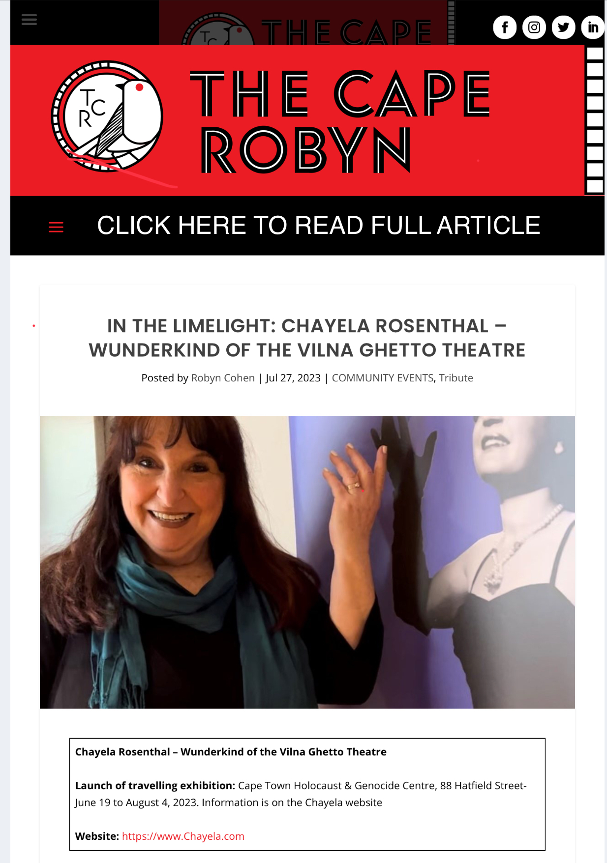 Click this link to read the full article: https://thecaperobyn.co.za/in-the-limelight-chayela-rosenthal-wunderkind-of-the-vilna-ghetto-theatre/
