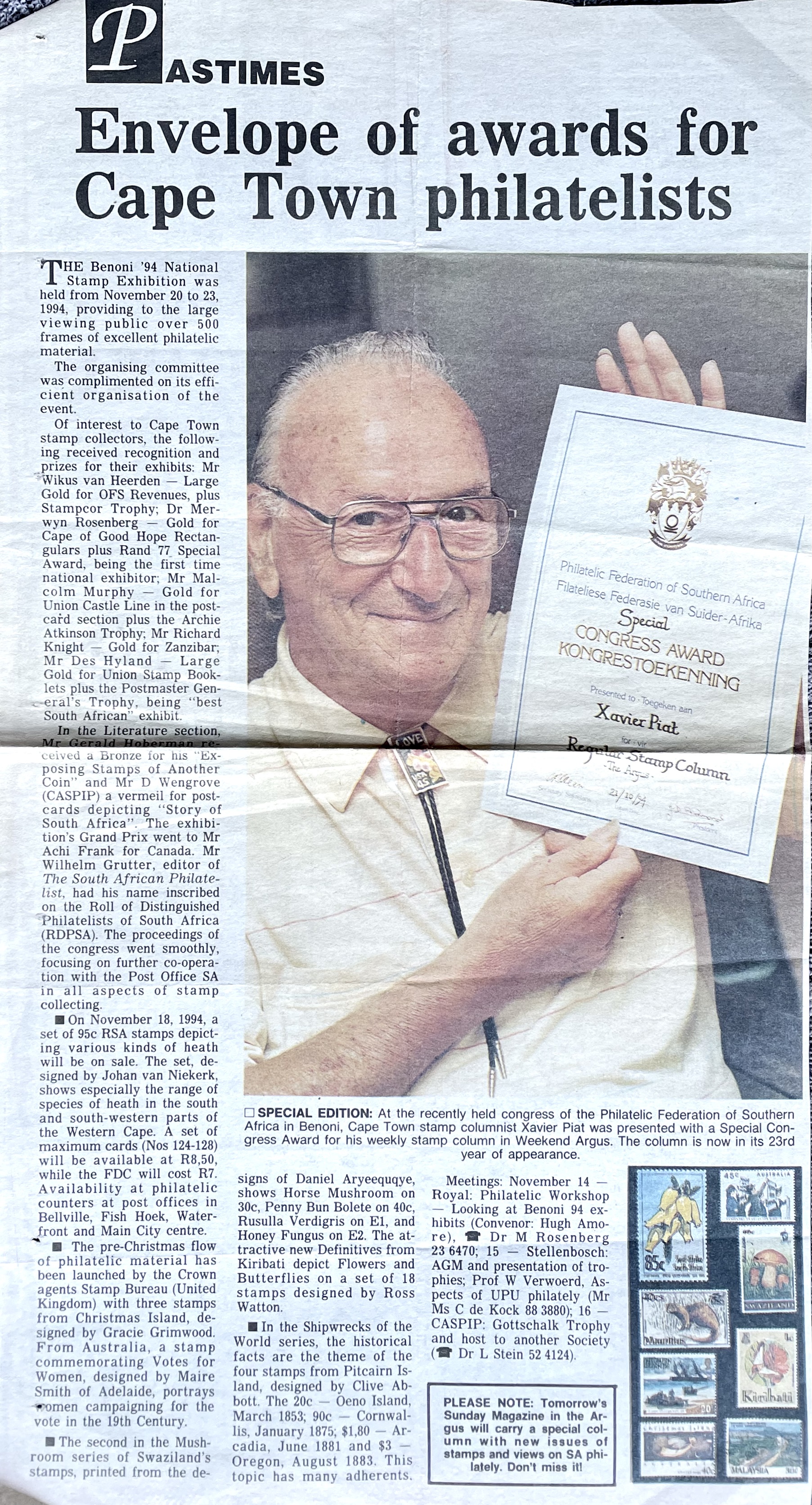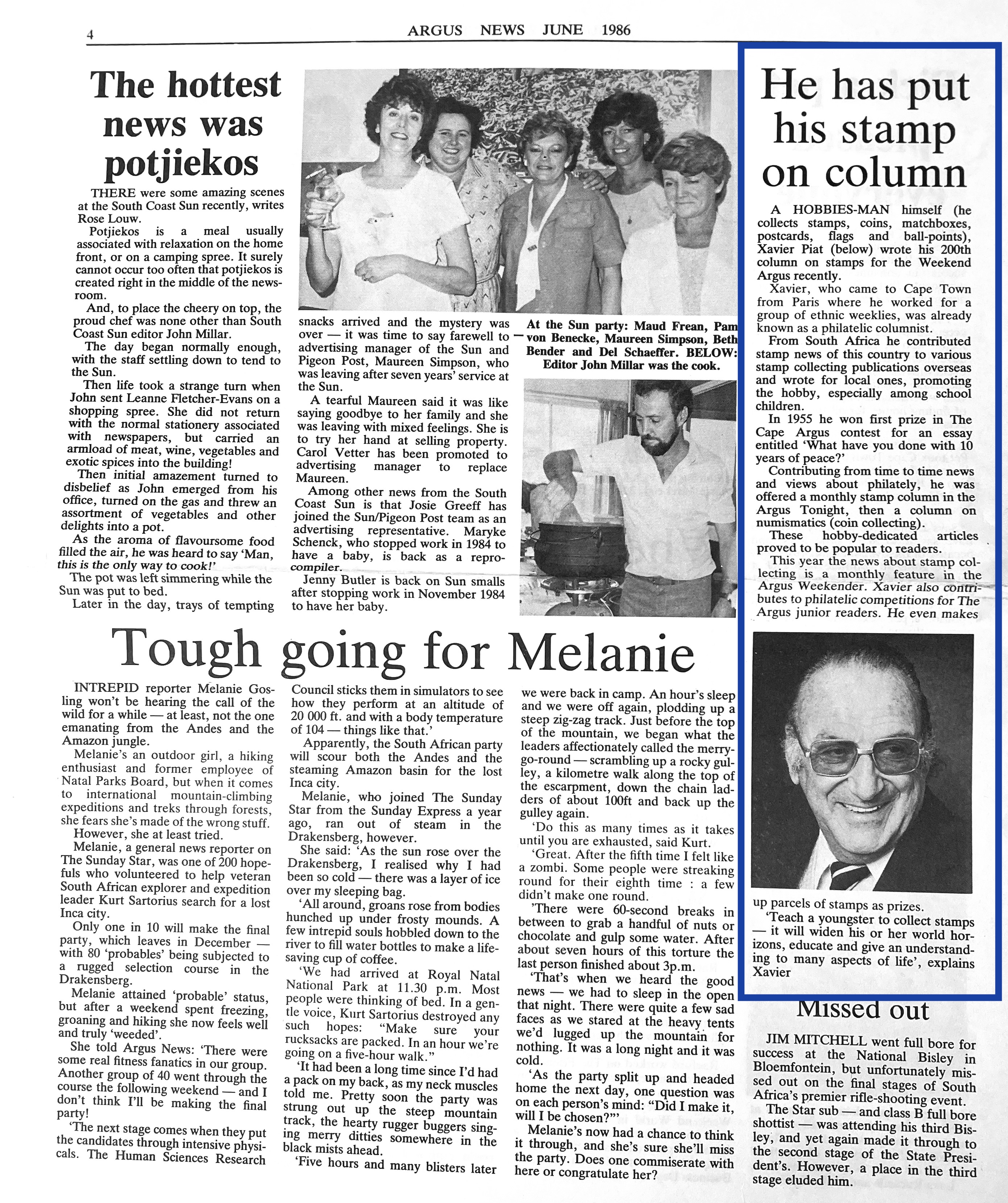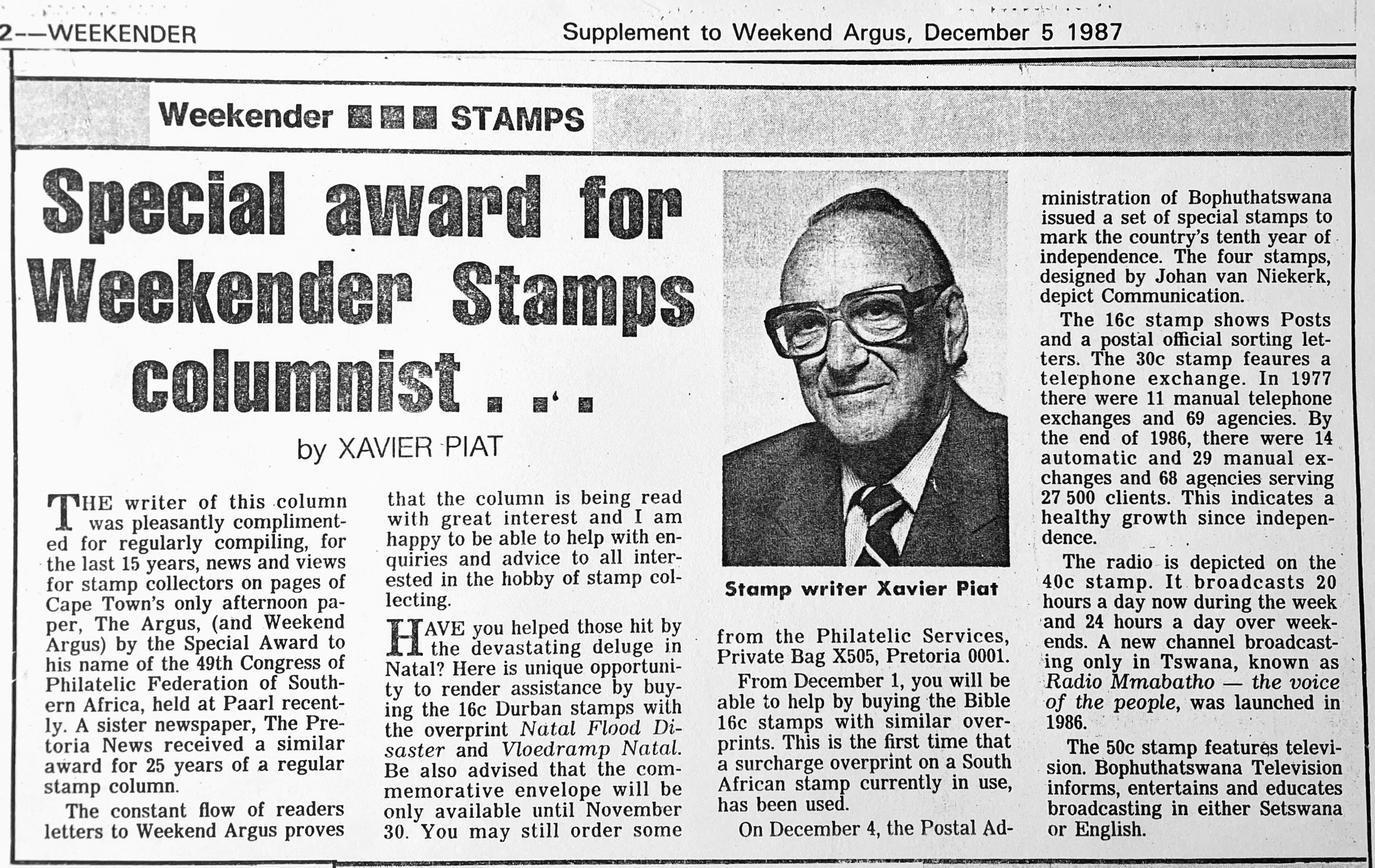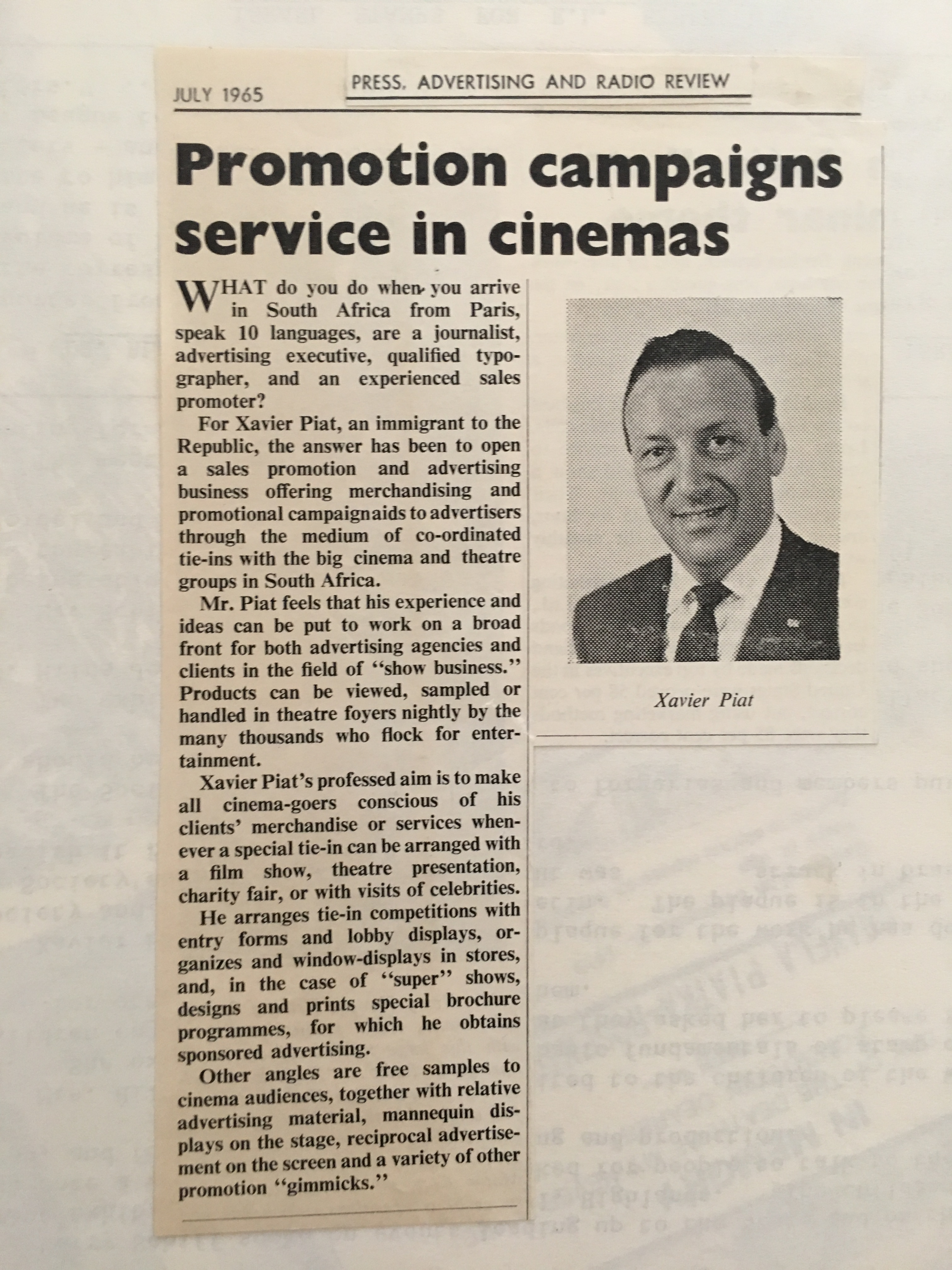 Xavier also went to night school at the Cape Technion to learn the Afrikaans language, after which he approached the editor of the Afrikaans newspaper, “Die Burger” to consider further employment as a journalist. Xavier excelled at print layout and soon became editor of “Die Jongspan” the children’s supplement to Die Burger. Longing to return to real journalism in English too, he presented his World Union and French Union Journalist cards to the editor of the “The Cape Times” newspaper, pleading with him to get him work as a journalist. By July he had his first major article about Bastille Day, appearing on the front page of “The Cape Times” newspaper. He also soon became the leading columnist on Philately in “The Cape Argus” newspaper. After a few years Xavier started his own one-man Advertising agency, Piat Promotions, while still writing articles on various topics for newspapers and doing entertainment industry ( stage and film) reviews. Xavier’s successful publicity work in promoting Danny Kaye’s visit to Cape Town, and his expertise in the marketing and entertainment management field, led to many contracts with African Consolidated Theatre Group and with other entertainment industry clients and, through John Clark, sales promotion and marketing contracts with cinemas and film groups too. During the time of Apartheid, Xavier also helped to bring the performers of Colour into the starlight with “The Eon Group“, “African Follies” and more.