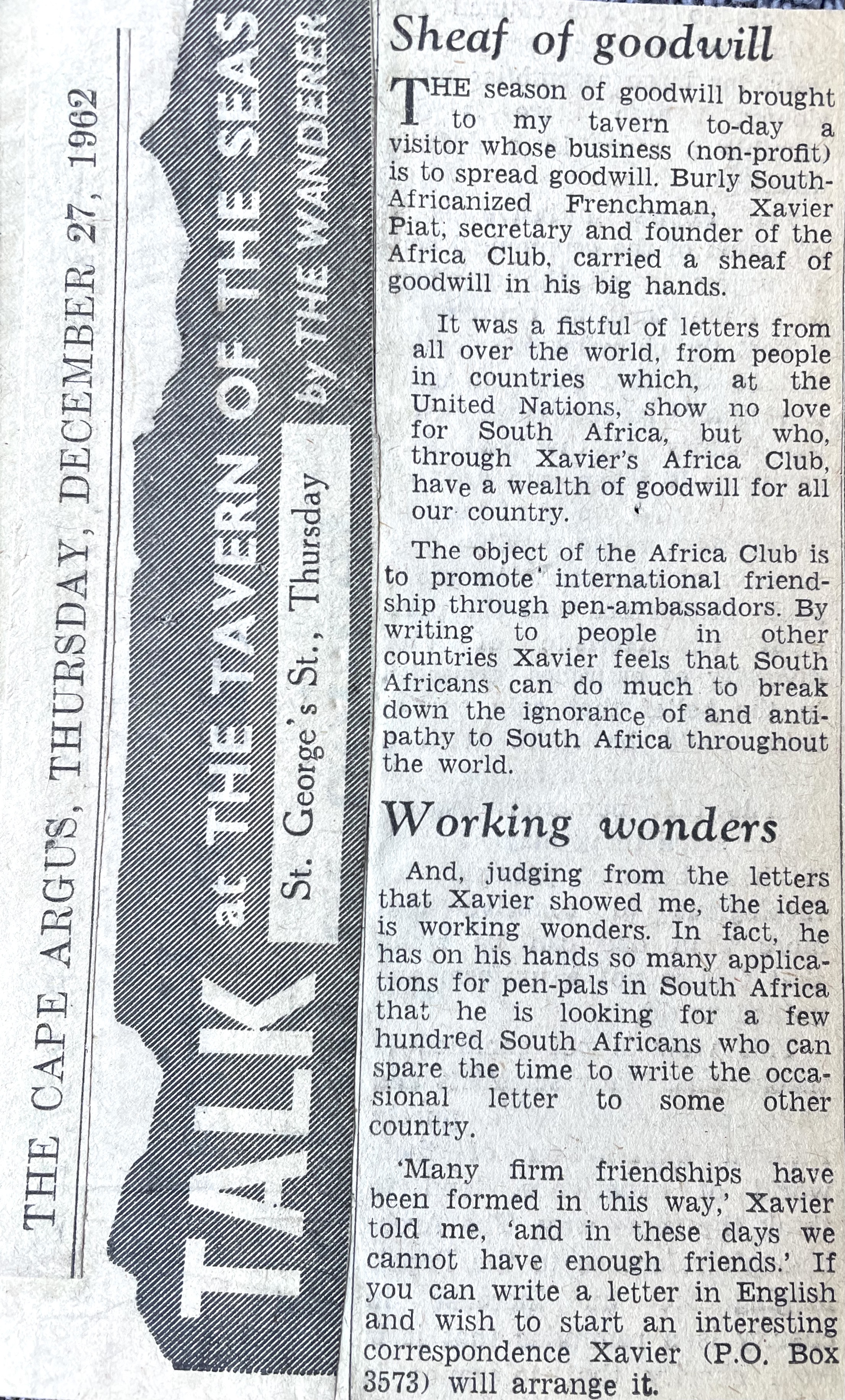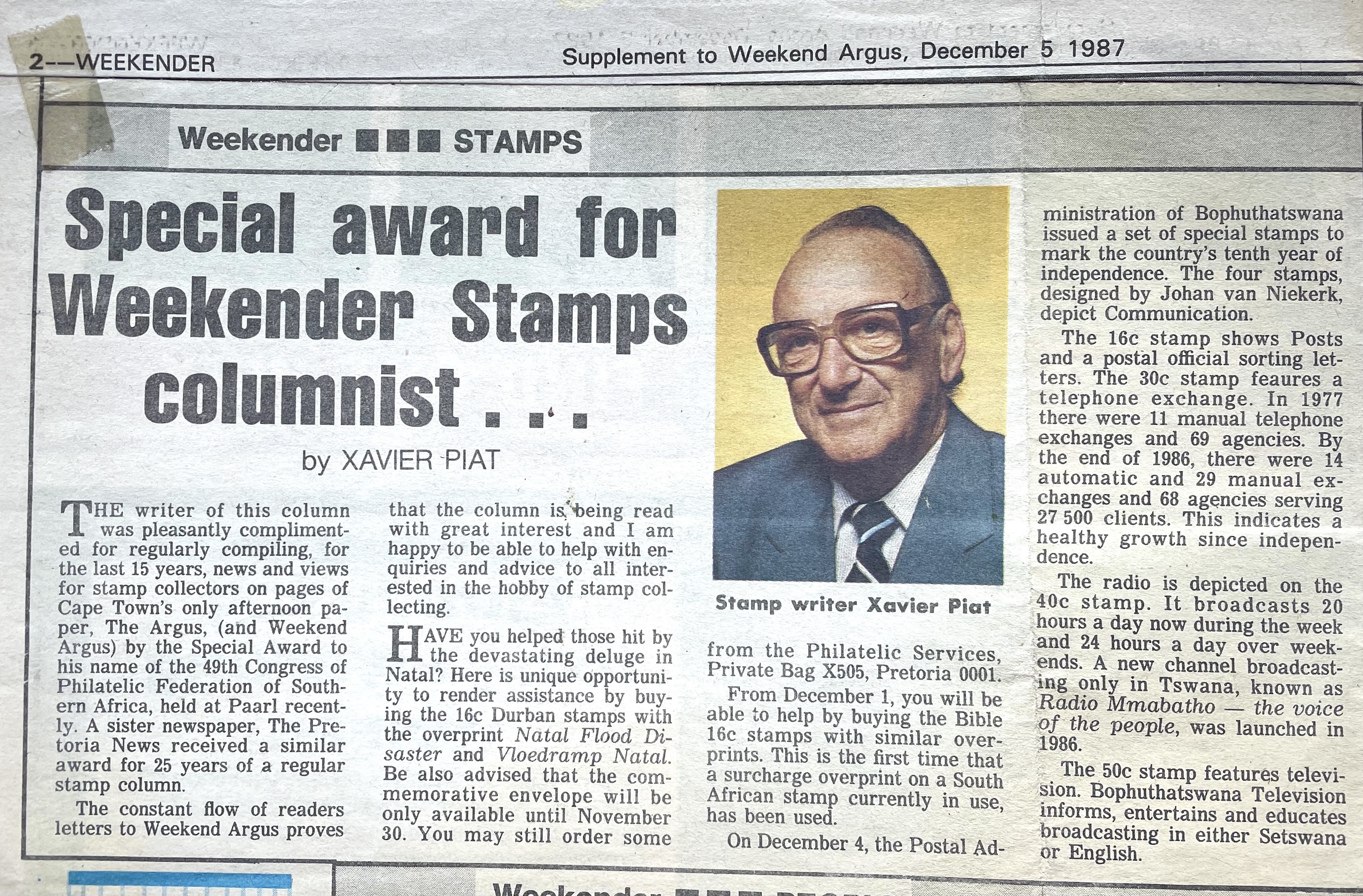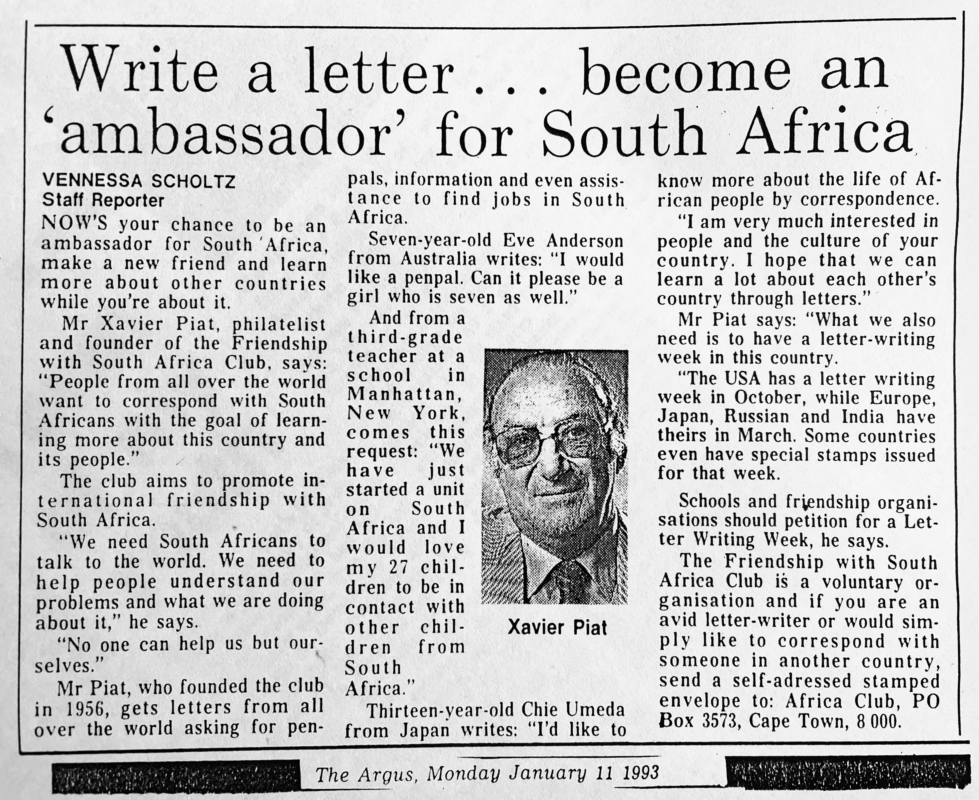 Xavier also went to night school at the Cape Technion to learn the Afrikaans language, after which he approached the editor of the Afrikaans newspaper, “Die Burger” to consider further employment as a journalist. Xavier excelled at print layout and soon became editor of “Die Jongspan” the children’s supplement to Die Burger. Longing to return to real journalism in English too, he presented his World Union and French Union Journalist cards to the editor of the “The Cape Times” newspaper, pleading with him to get him work as a journalist. By July he had his first major article about Bastille Day, appearing on the front page of “The Cape Times” newspaper. He also soon became the leading columnist on Philately in “The Cape Argus” newspaper. After a few years Xavier started his own one-man Advertising agency, Piat Promotions, while still writing articles on various topics for newspapers and doing entertainment industry ( stage and film) reviews. Xavier’s successful publicity work in promoting Danny Kaye’s visit to Cape Town, and his expertise in the marketing and entertainment management field, led to many contracts with African Consolidated Theatre Group and with other entertainment industry clients and, through John Clark, sales promotion and marketing contracts with cinemas and film groups too. During the time of Apartheid, Xavier also helped to bring the performers of Colour into the starlight with “The Eon Group“, “African Follies” and more.