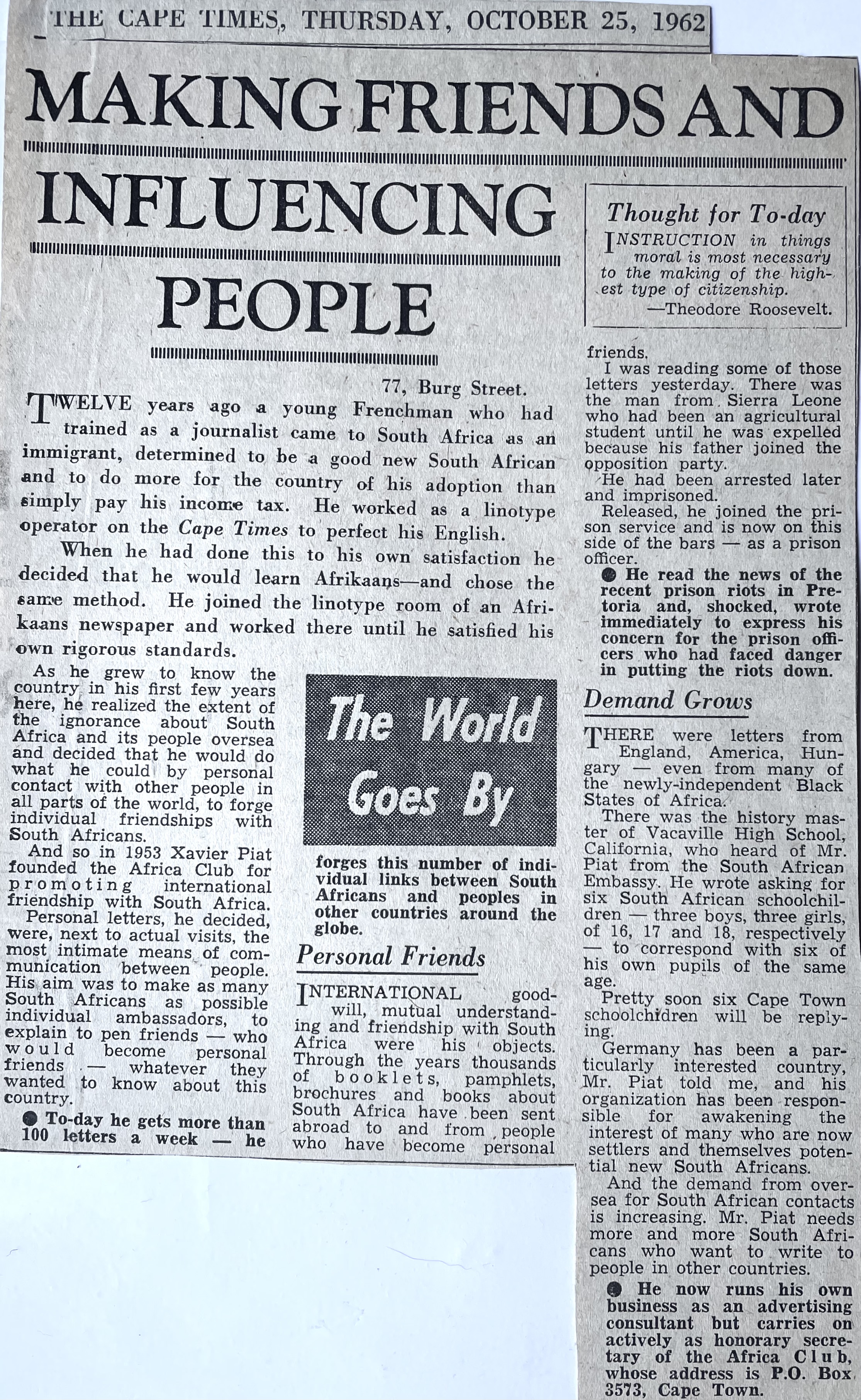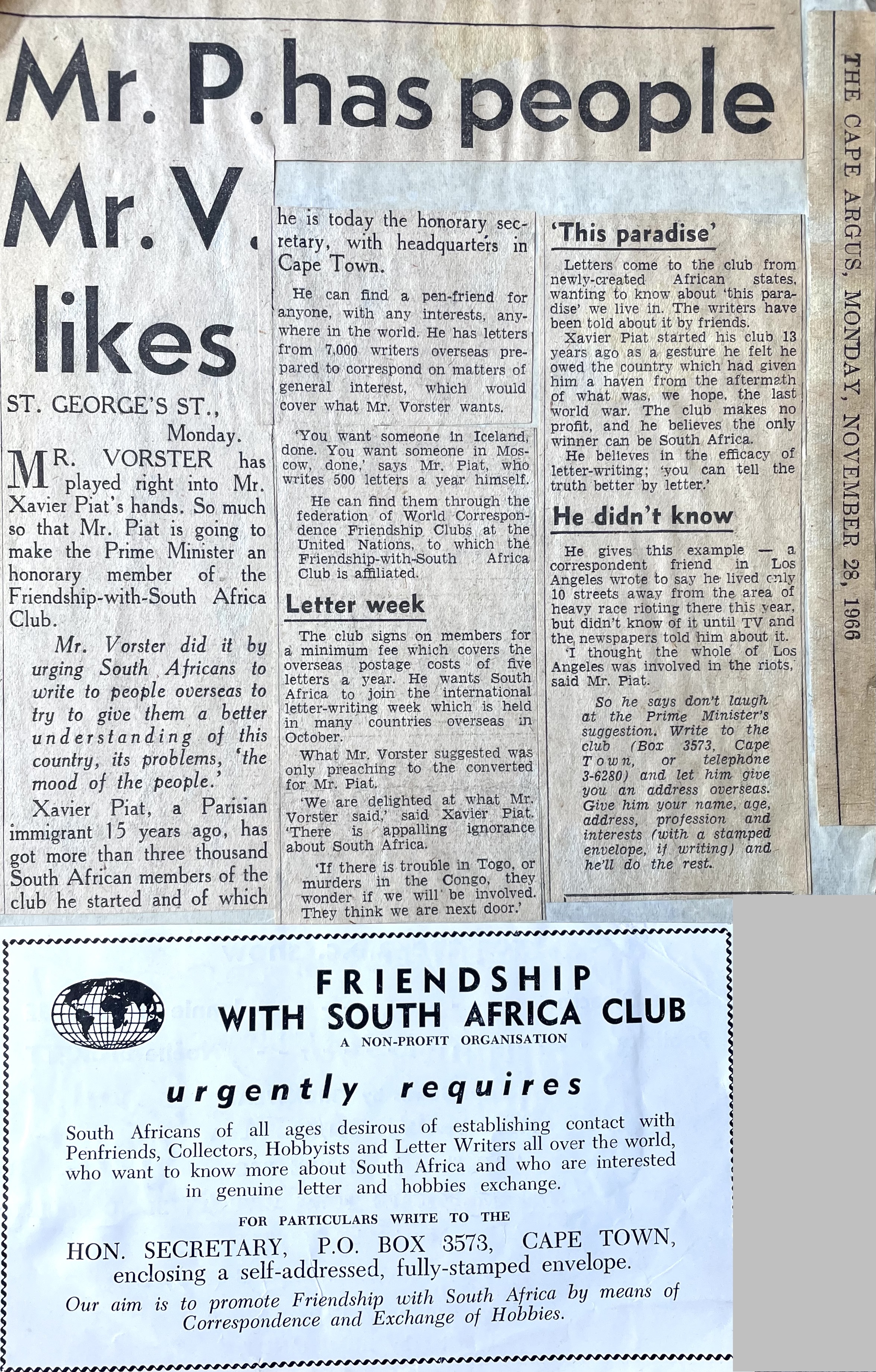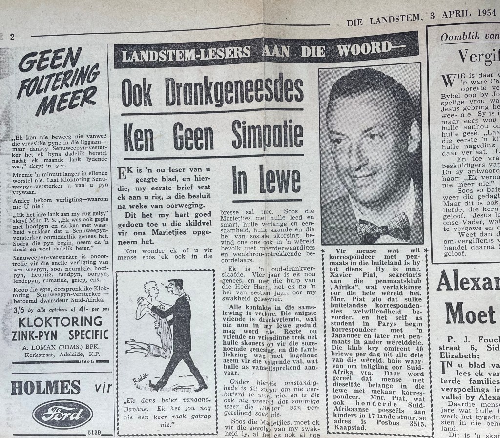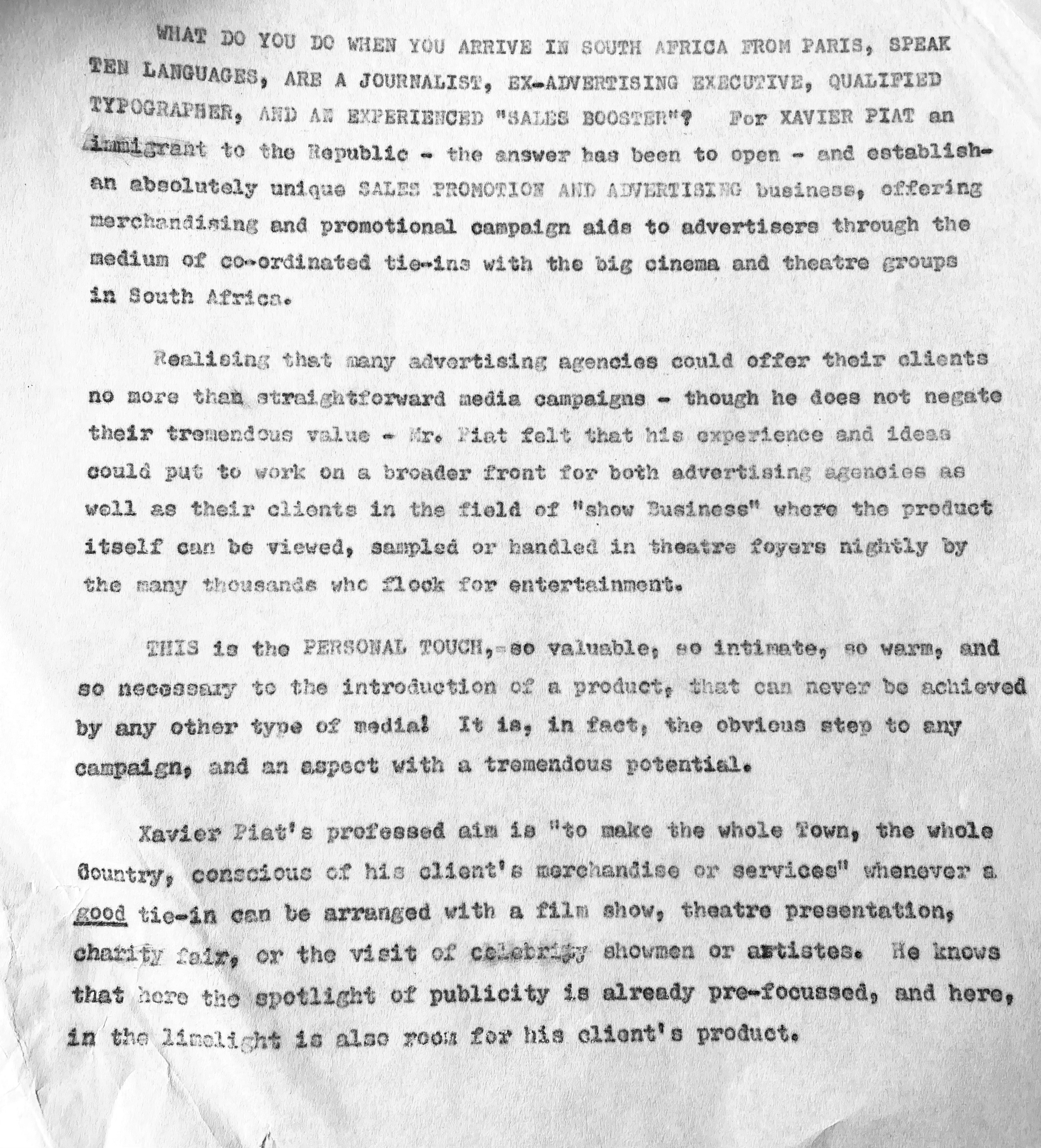 Xavier also went to night school at the Cape Technion to learn the Afrikaans language, after which he approached the editor of the Afrikaans newspaper, “Die Burger” to consider further employment as a journalist. Xavier excelled at print layout and soon became editor of “Die Jongspan” the children’s supplement to Die Burger. Longing to return to real journalism in English too, he presented his World Union and French Union Journalist cards to the editor of the “The Cape Times” newspaper, pleading with him to get him work as a journalist. By July he had his first major article about Bastille Day, appearing on the front page of “The Cape Times” newspaper. He also soon became the leading columnist on Philately in “The Cape Argus” newspaper. After a few years Xavier started his own one-man Advertising agency, Piat Promotions, while still writing articles on various topics for newspapers and doing entertainment industry ( stage and film) reviews. Xavier’s successful publicity work in promoting Danny Kaye’s visit to Cape Town, and his expertise in the marketing and entertainment management field, led to many contracts with African Consolidated Theatre Group and with other entertainment industry clients and, through John Clark, sales promotion and marketing contracts with cinemas and film groups too. During the time of Apartheid, Xavier also helped to bring the performers of Colour into the starlight with “The Eon Group“, “African Follies” and more.