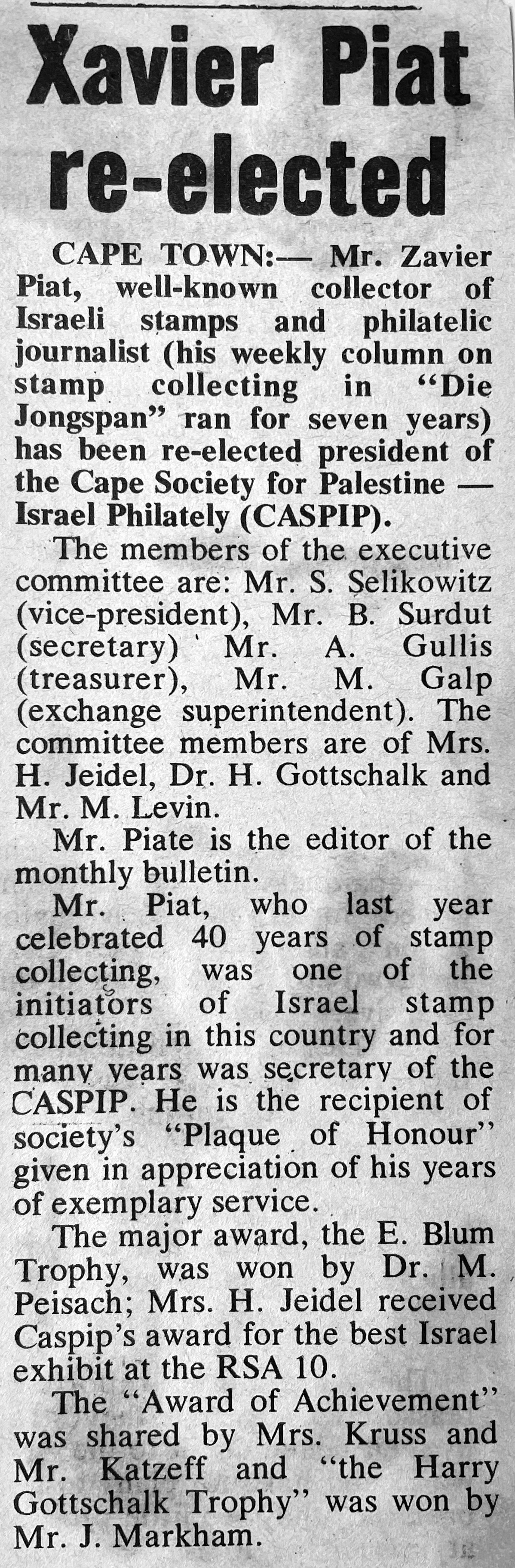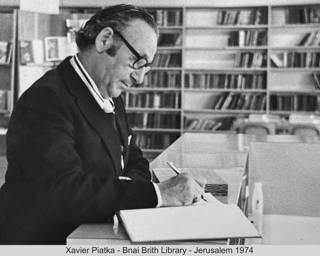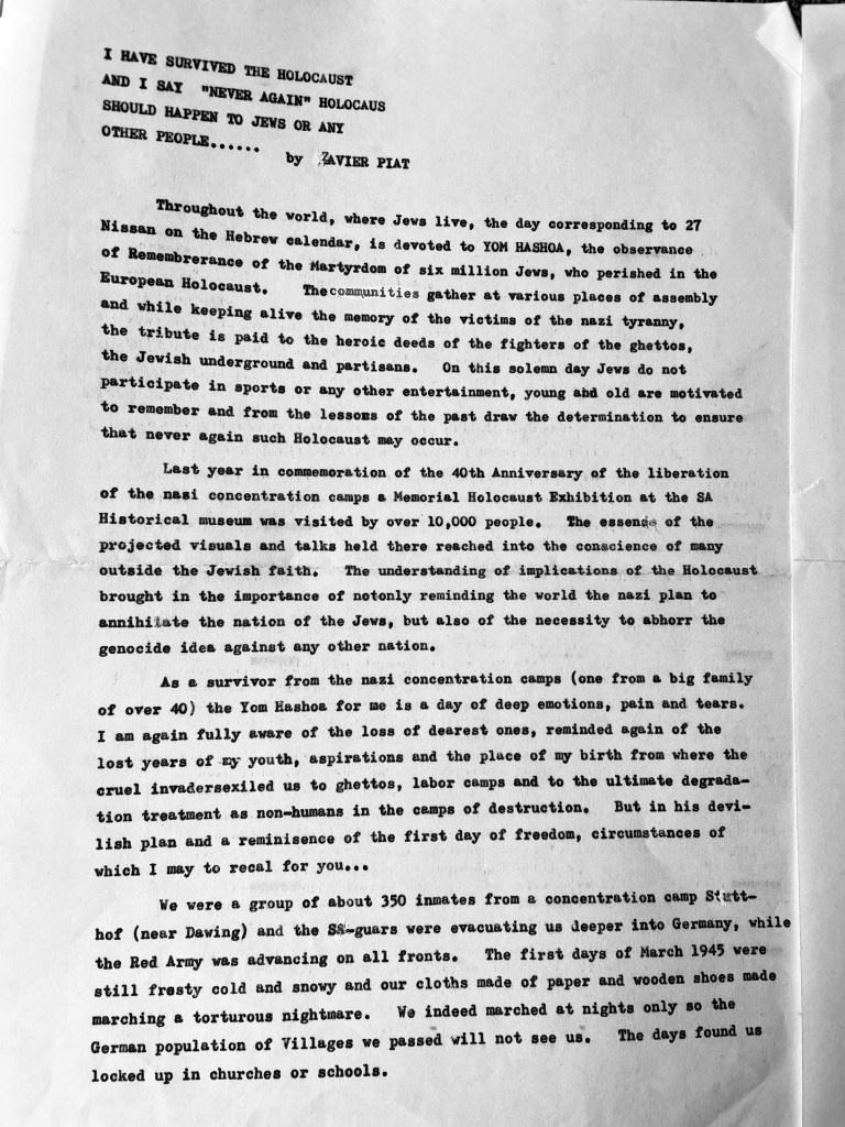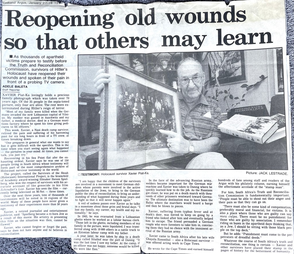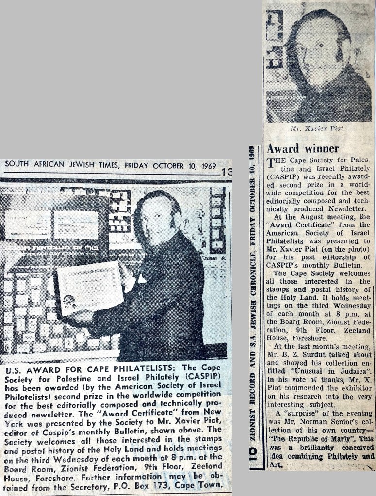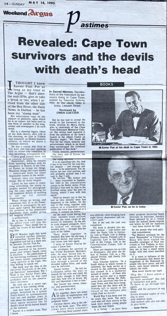 In keeping his promise to be of service to his friends and community he quickly became known and respected for his journalism through weekly publications of his philatelic “Stamp Column” and other regular articles published in the South African local newspapers, as well as his theatre and film reviews. Through his work with “Piat Promotions“, his Advertising Agency, he regularly promoted many local Jewish owned businesses in many publications. He was also managing editor of the “South African Jewish Times” newspaper. He became a beloved private coach to prospective stamp collectors of all ages. He was involved in founding the award winning and internationally recognised “Cape Society for Palestine and Israel Philately” (CASPIP) organisation and was the editor of its monthly newspaper. For many years, Xavier wrote the popular weekly columns about stamps in the daily newspapers. He also founded the Africa Friendship Club, a pen-pal organization that united people from all over the world who would share stories about their countries and exchange stamps. Xavier spent many years as an active member and secretary of Cape Town’s Bnai Brith Bar Kochba lodge and as editor of its quarterly news bulletin, travelling to world congresses and later becoming National Vice President of the organization. As one of the founders, and a life-long devoted member of the She’erith Hapletah – a group where Holocaust survivors regularly came together to share their stories, get support and more, formed in 1952, – Xavier and his wife hosted many of these gatherings and educational events in their home. His suggestion to erect a Holocaust memorial monument in the Cape Town Jewish cemetery, and his fundraising efforts resulted in the installation of such in 1990. Realizing the importance of recording history so no one forgets the holocaust, Xavier conceived the idea to record the holocaust testimonials of the local survivors and his perseverance on this project, with the help of Myra Osrin, resulted in the printing and release of the book “IN SACRED MEMORY”, edited by Gwynne Schrire. in 1995. Xavier was an integral contributing part of creating, and was an honorable member of, the internationally highly respected Cape Town Holocaust and Genocide Centre opened just a few years before he passed away in 1998. For many years, around The Day of Remembrance (Yom Ha Shoah), Xavier wrote and published articles about the Holocaust in the local newspapers, to keep the memories alive and the lessons of evil remembered.