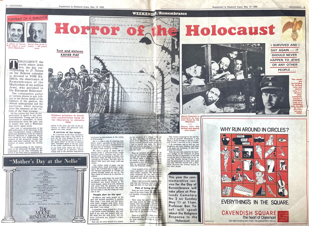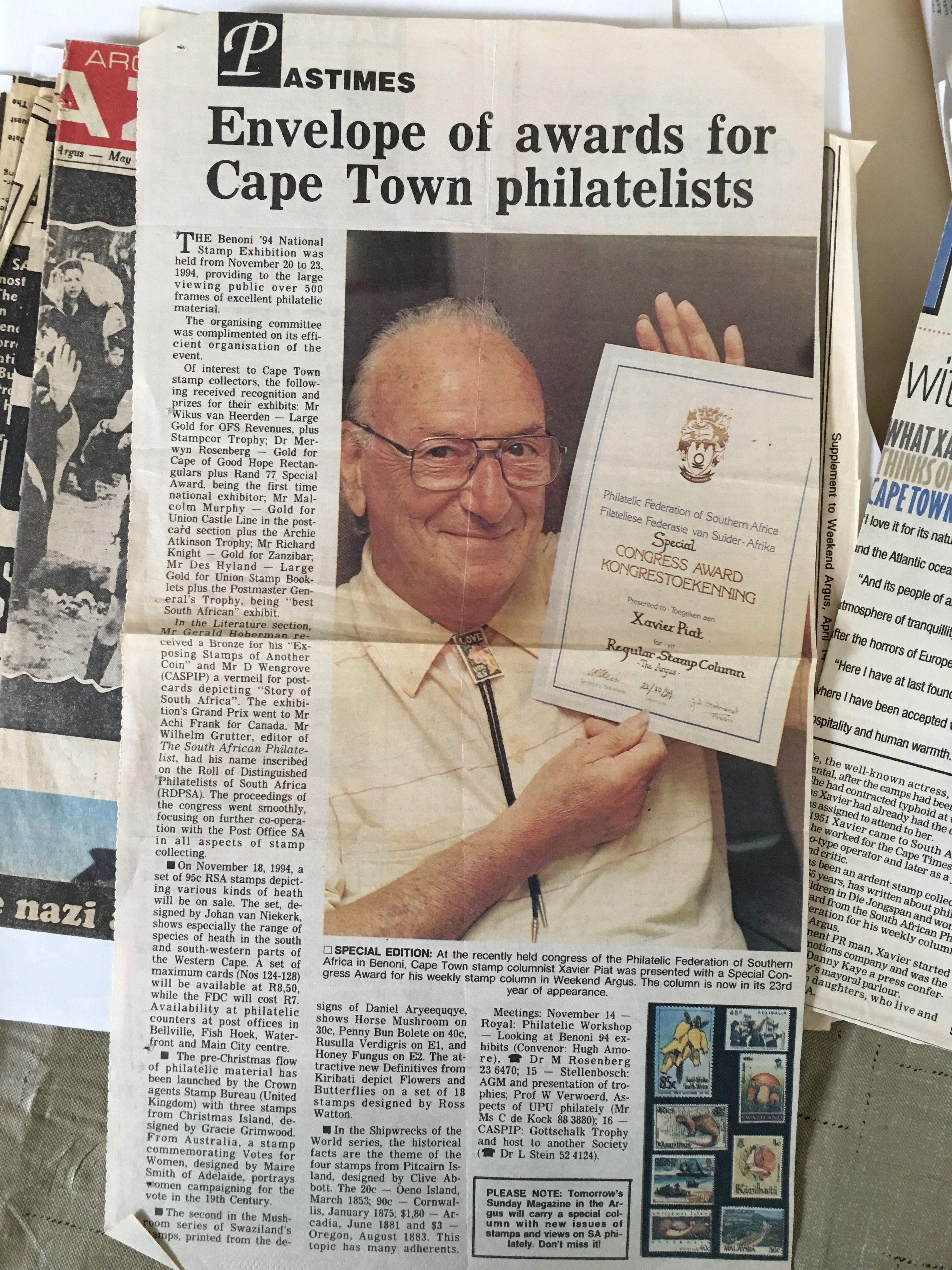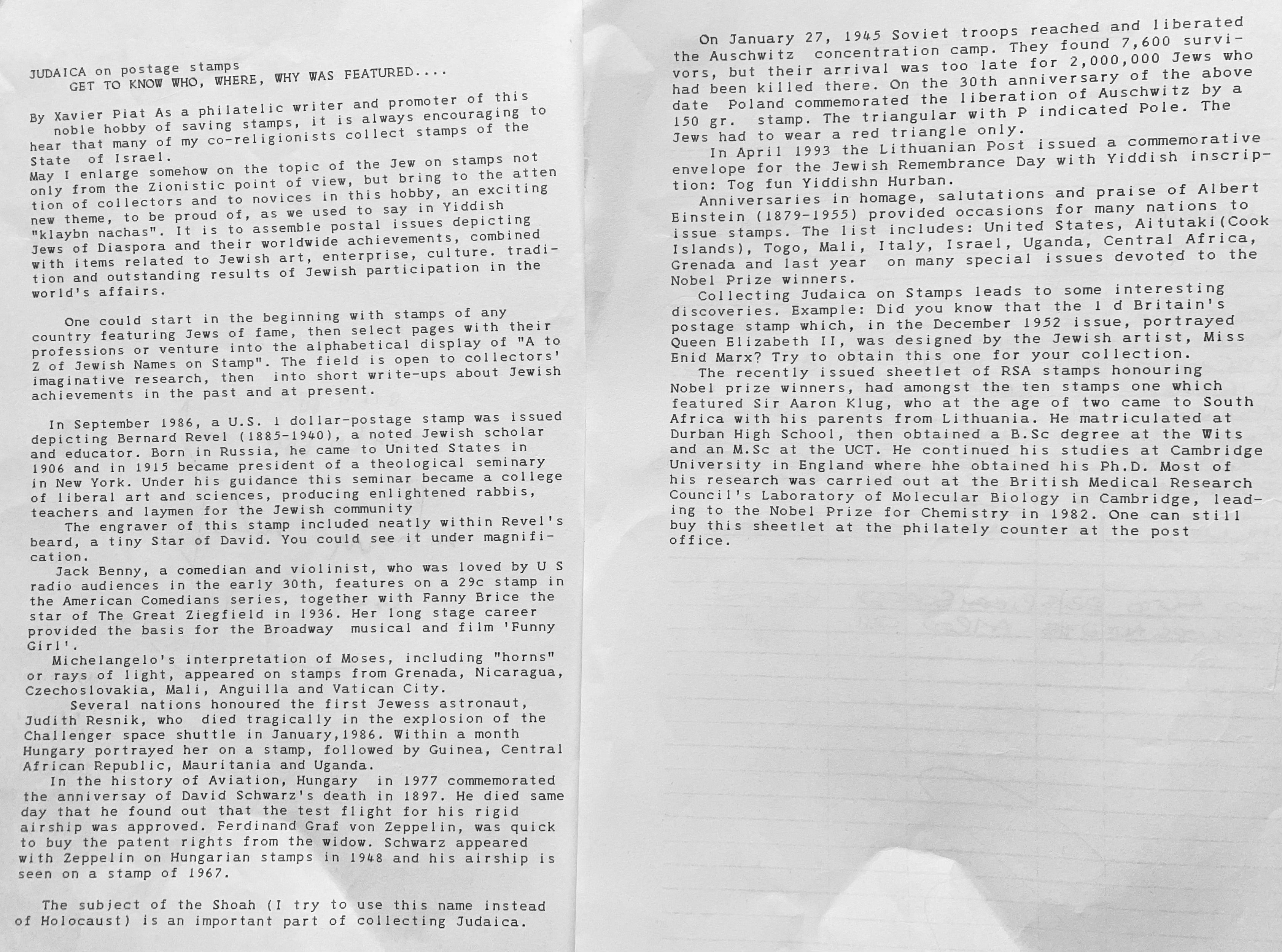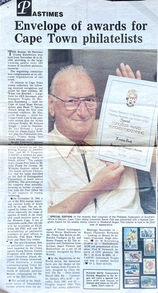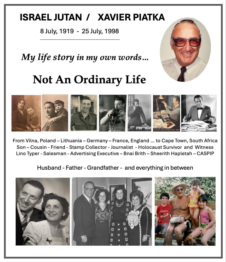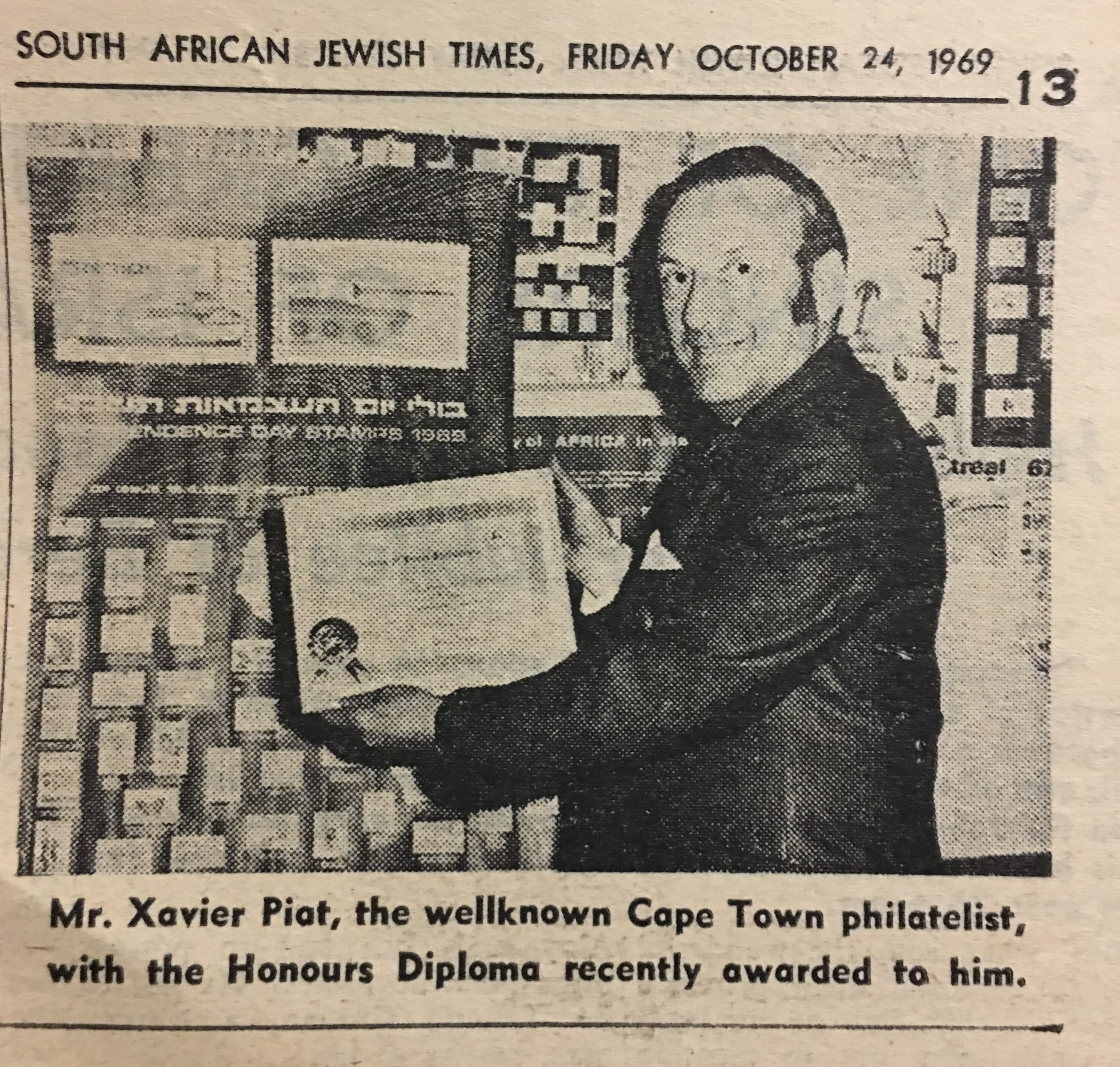 In keeping his promise to be of service to his friends and community he quickly became known and respected for his journalism through weekly publications of his philatelic “Stamp Column” and other regular articles published in the South African local newspapers, as well as his theatre and film reviews. Through his work with “Piat Promotions“, his Advertising Agency, he regularly promoted many local Jewish owned businesses in many publications. He was also managing editor of the “South African Jewish Times” newspaper. He became a beloved private coach to prospective stamp collectors of all ages. He was involved in founding the award winning and internationally recognised “Cape Society for Palestine and Israel Philately” (CASPIP) organisation and was the editor of its monthly newspaper. For many years, Xavier wrote the popular weekly columns about stamps in the daily newspapers. He also founded the Africa Friendship Club, a pen-pal organization that united people from all over the world who would share stories about their countries and exchange stamps. Xavier spent many years as an active member and secretary of Cape Town’s Bnai Brith Bar Kochba lodge and as editor of its quarterly news bulletin, travelling to world congresses and later becoming National Vice President of the organization. As one of the founders, and a life-long devoted member of the She’erith Hapletah – a group where Holocaust survivors regularly came together to share their stories, get support and more, formed in 1952, – Xavier and his wife hosted many of these gatherings and educational events in their home. His suggestion to erect a Holocaust memorial monument in the Cape Town Jewish cemetery, and his fundraising efforts resulted in the installation of such in 1990. Realizing the importance of recording history so no one forgets the holocaust, Xavier conceived the idea to record the holocaust testimonials of the local survivors and his perseverance on this project, with the help of Myra Osrin, resulted in the printing and release of the book “IN SACRED MEMORY”, edited by Gwynne Schrire. in 1995. Xavier was an integral contributing part of creating, and was an honorable member of, the internationally highly respected Cape Town Holocaust and Genocide Centre opened just a few years before he passed away in 1998. For many years, around The Day of Remembrance (Yom Ha Shoah), Xavier wrote and published articles about the Holocaust in the local newspapers, to keep the memories alive and the lessons of evil remembered.