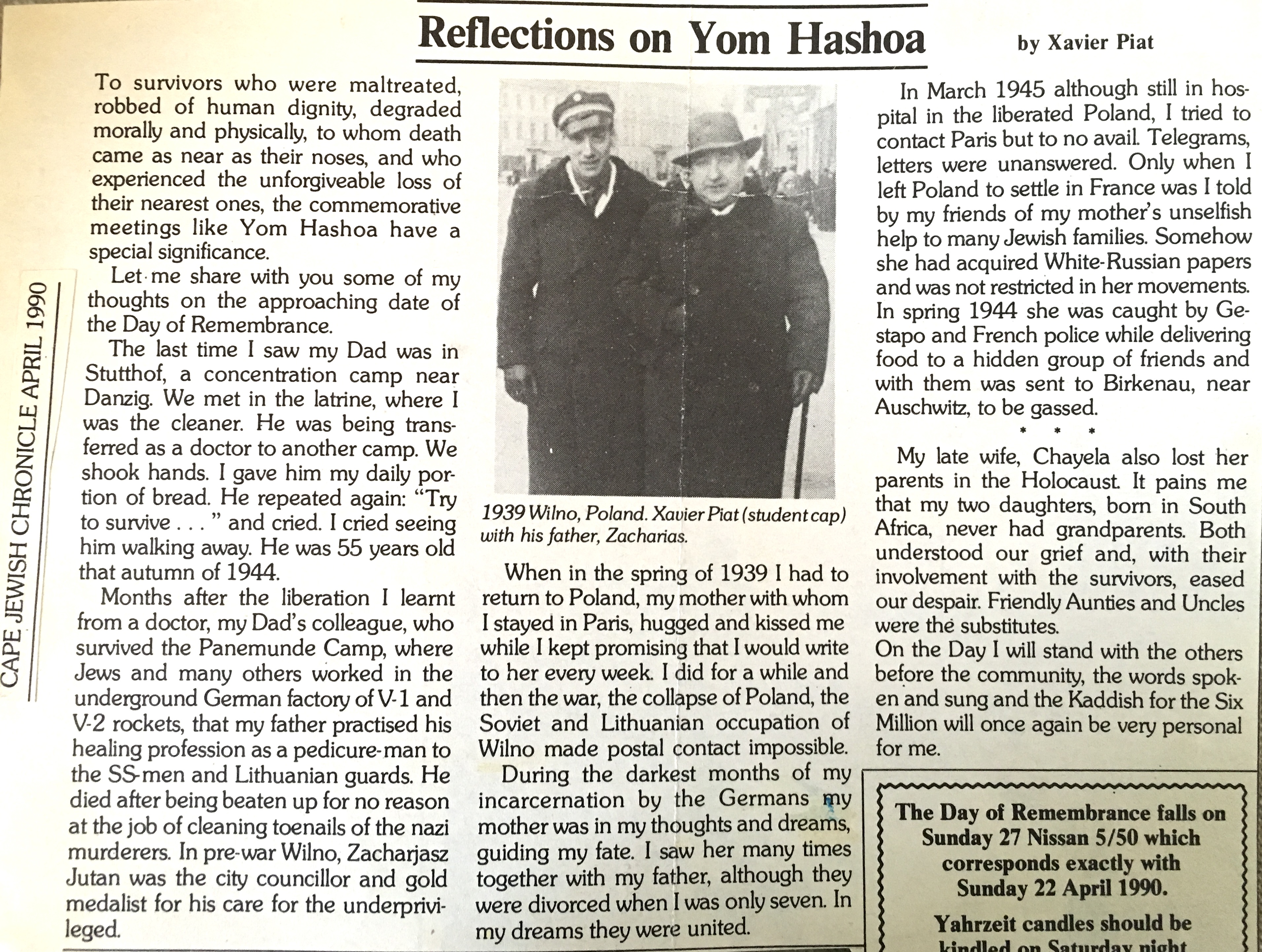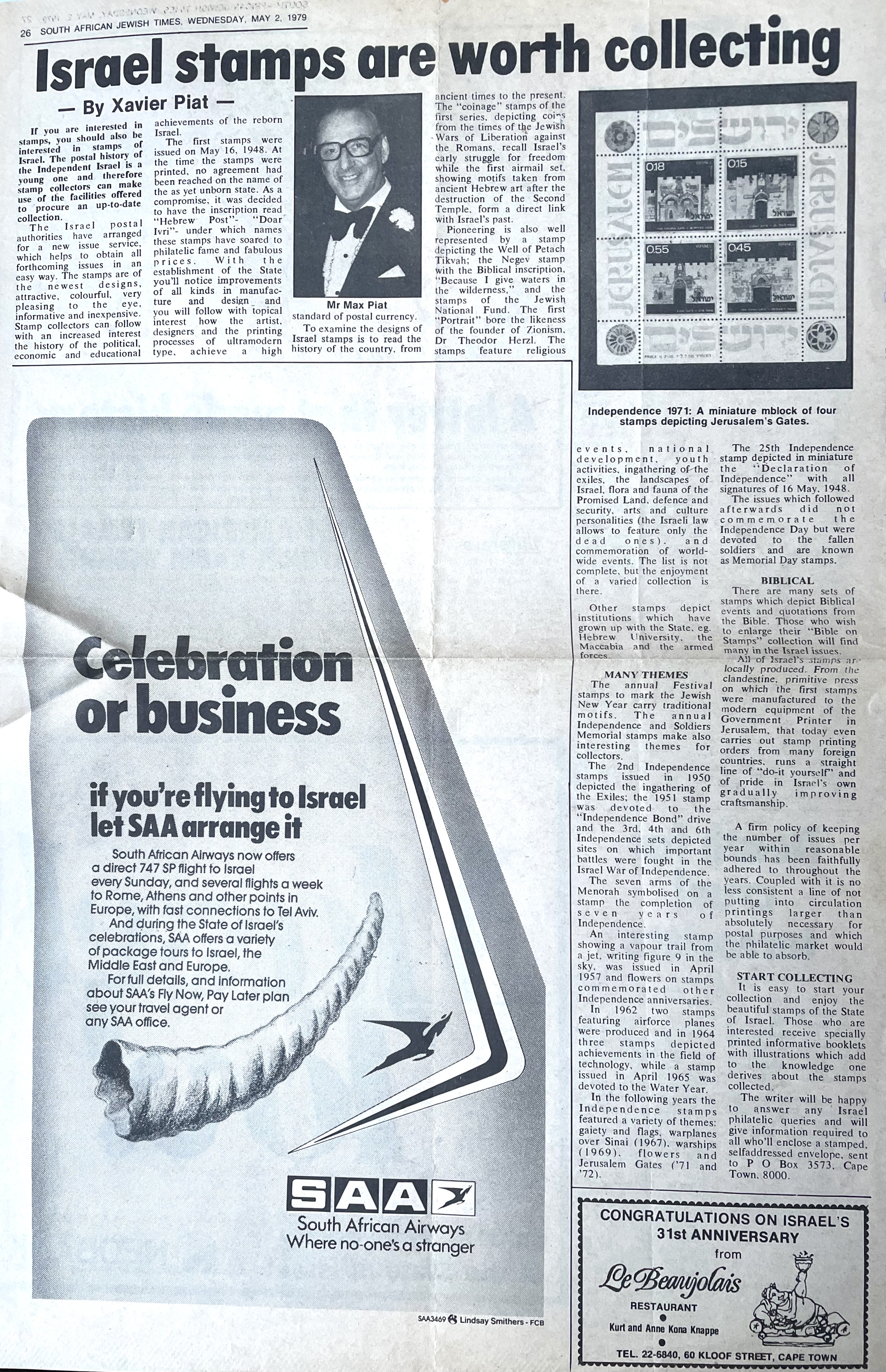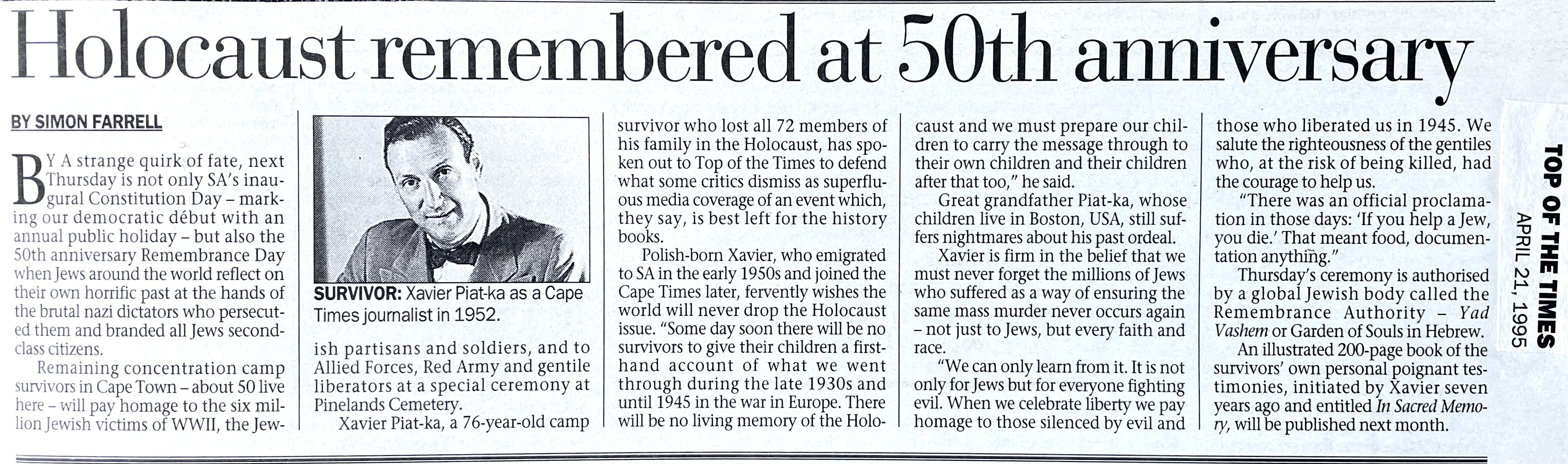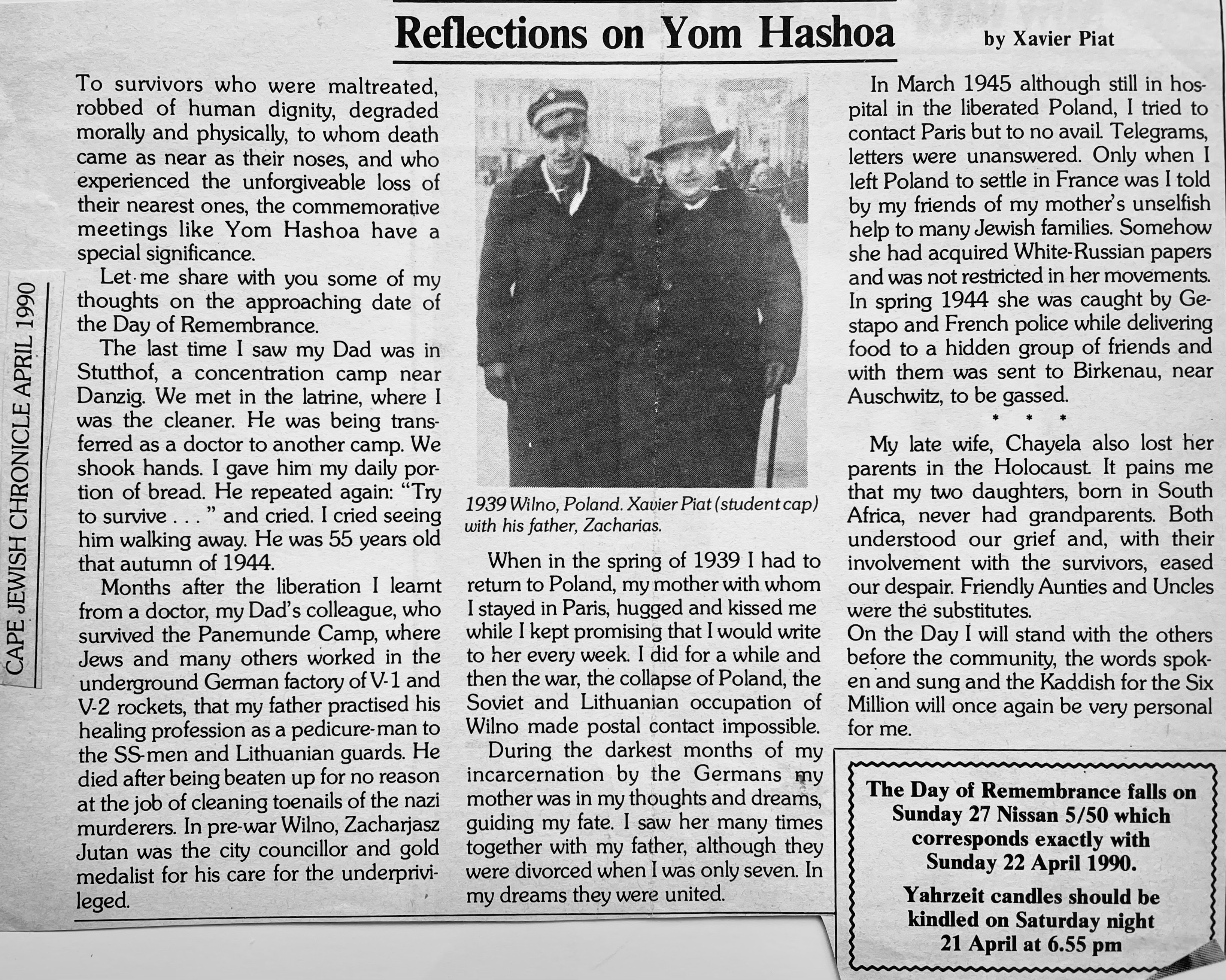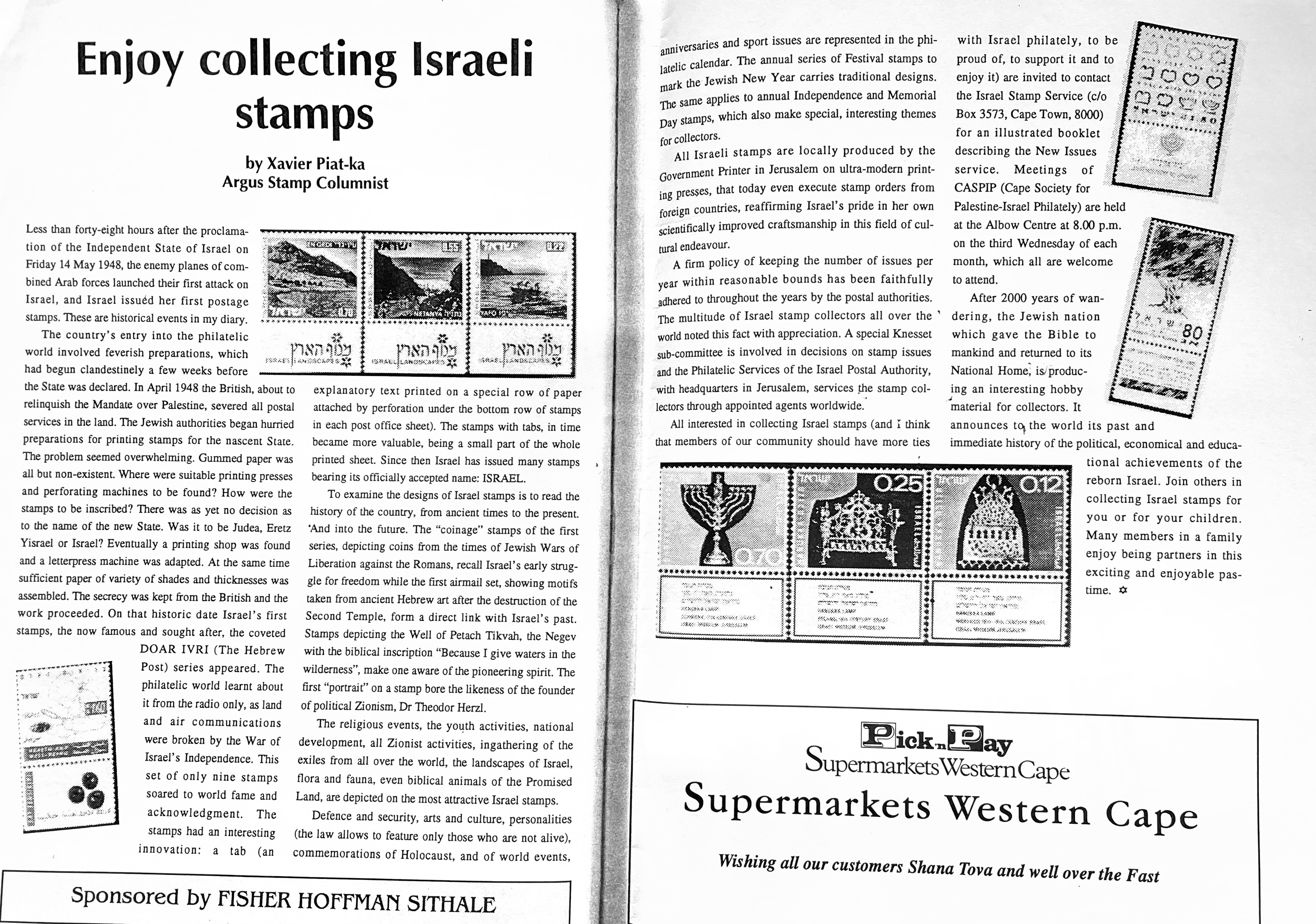 In keeping his promise to be of service to his friends and community he quickly became known and respected for his journalism through weekly publications of his philatelic “Stamp Column” and other regular articles published in the South African local newspapers, as well as his theatre and film reviews. Through his work with “Piat Promotions“, his Advertising Agency, he regularly promoted many local Jewish owned businesses in many publications. He was also managing editor of the “South African Jewish Times” newspaper. He became a beloved private coach to prospective stamp collectors of all ages. He was involved in founding the award winning and internationally recognised “Cape Society for Palestine and Israel Philately” (CASPIP) organisation and was the editor of its monthly newspaper. For many years, Xavier wrote the popular weekly columns about stamps in the daily newspapers. He also founded the Africa Friendship Club, a pen-pal organization that united people from all over the world who would share stories about their countries and exchange stamps. Xavier spent many years as an active member and secretary of Cape Town’s Bnai Brith Bar Kochba lodge and as editor of its quarterly news bulletin, travelling to world congresses and later becoming National Vice President of the organization. As one of the founders, and a life-long devoted member of the She’erith Hapletah – a group where Holocaust survivors regularly came together to share their stories, get support and more, formed in 1952, – Xavier and his wife hosted many of these gatherings and educational events in their home. His suggestion to erect a Holocaust memorial monument in the Cape Town Jewish cemetery, and his fundraising efforts resulted in the installation of such in 1990. Realizing the importance of recording history so no one forgets the holocaust, Xavier conceived the idea to record the holocaust testimonials of the local survivors and his perseverance on this project, with the help of Myra Osrin, resulted in the printing and release of the book “IN SACRED MEMORY”, edited by Gwynne Schrire. in 1995. Xavier was an integral contributing part of creating, and was an honorable member of, the internationally highly respected Cape Town Holocaust and Genocide Centre opened just a few years before he passed away in 1998. For many years, around The Day of Remembrance (Yom Ha Shoah), Xavier wrote and published articles about the Holocaust in the local newspapers, to keep the memories alive and the lessons of evil remembered.