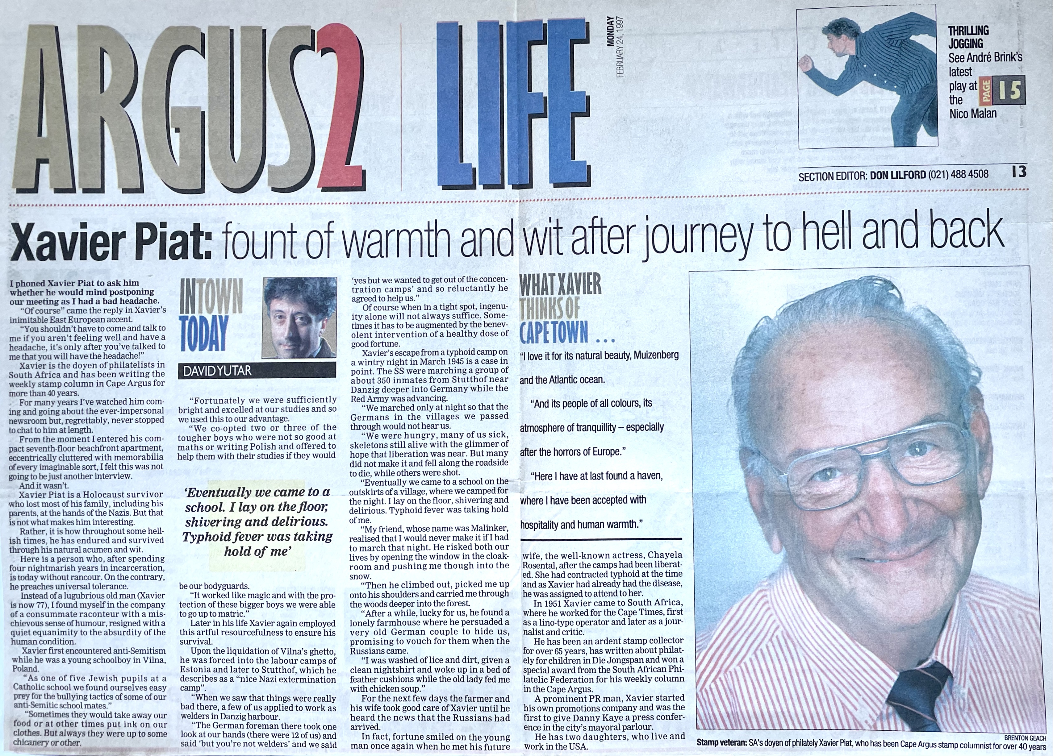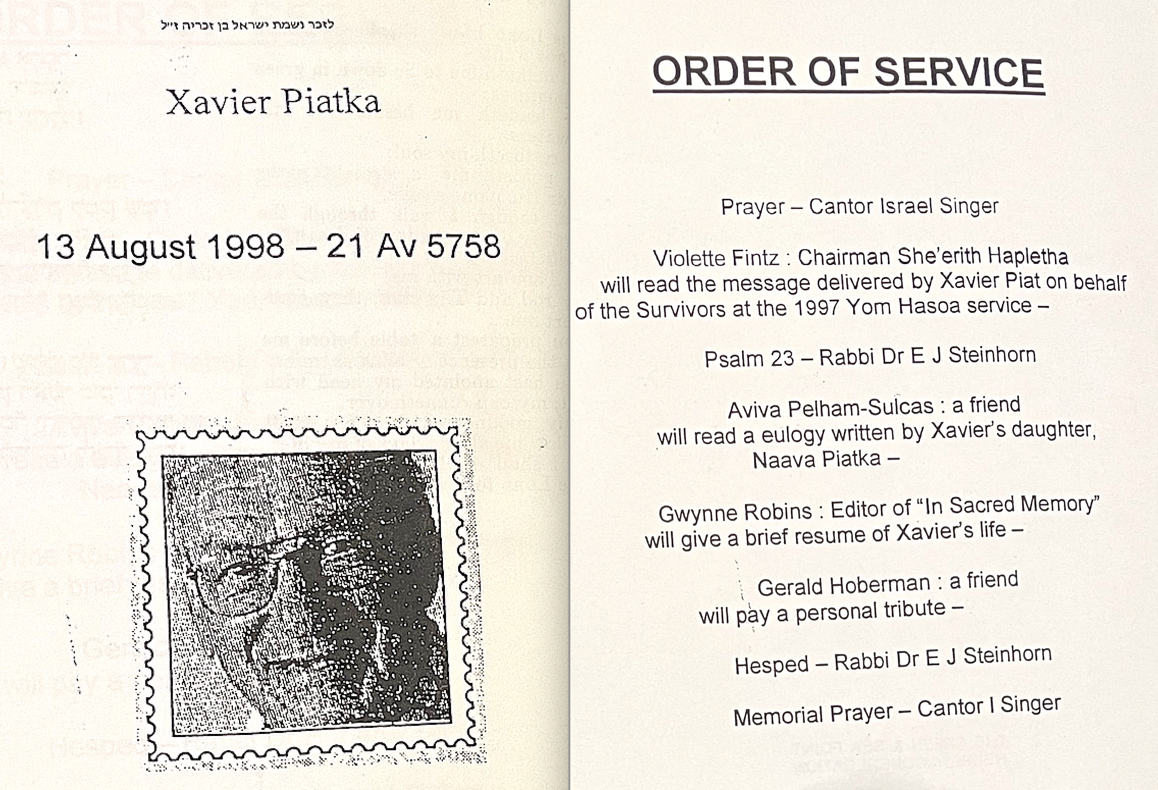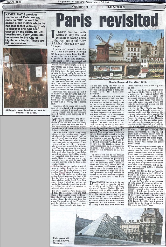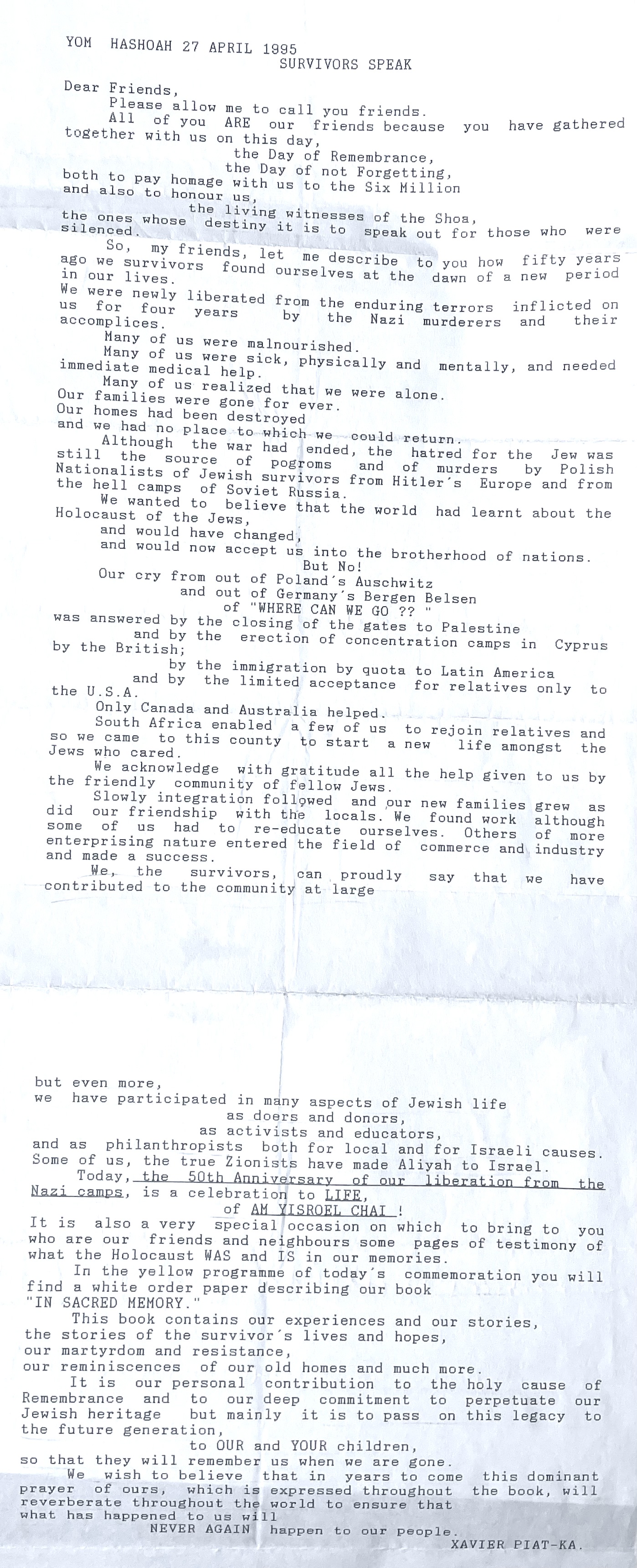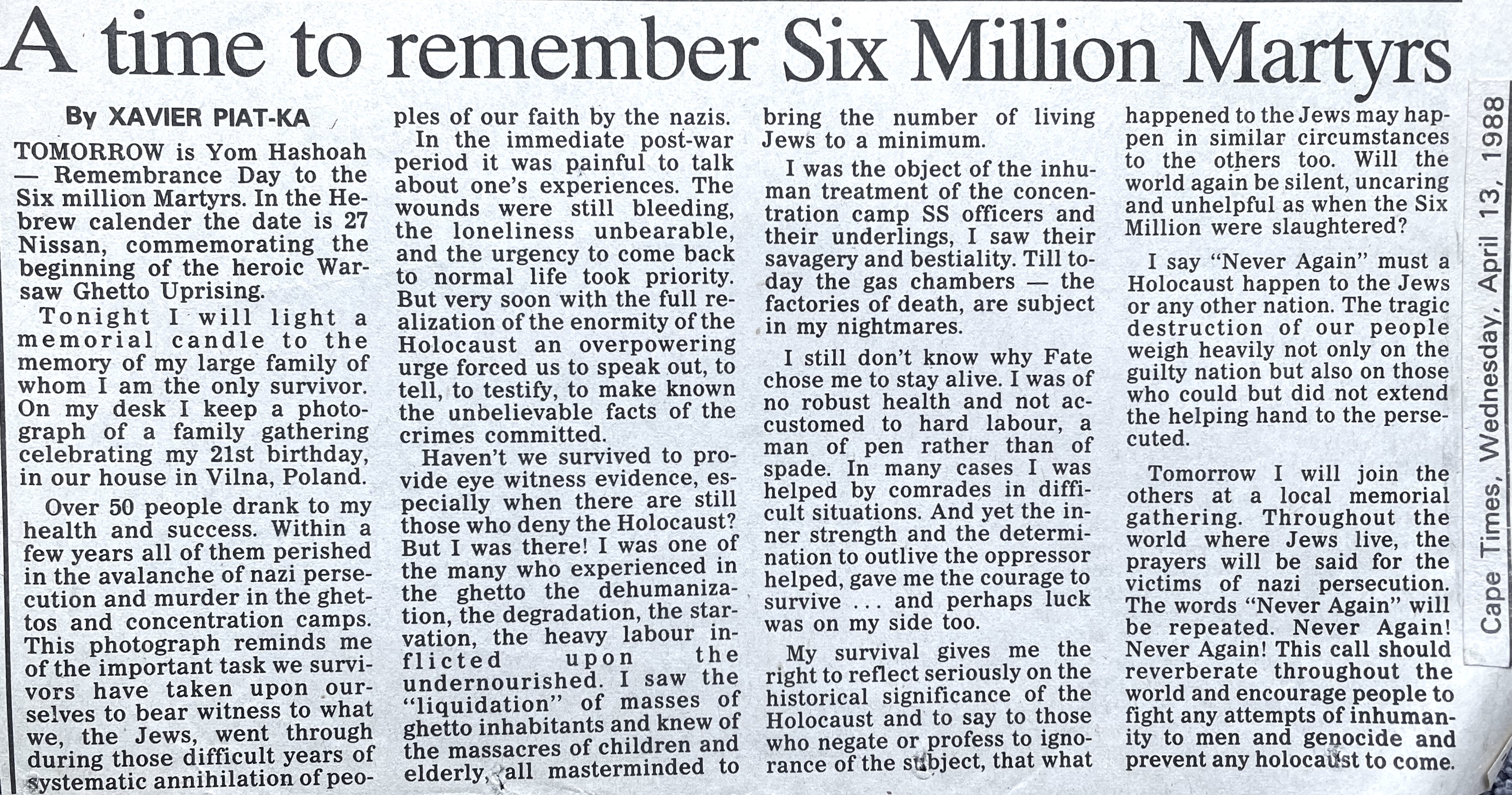 In keeping his promise to be of service to his friends and community he quickly became known and respected for his journalism through weekly publications of his philatelic “Stamp Column” and other regular articles published in the South African local newspapers, as well as his theatre and film reviews. Through his work with “Piat Promotions“, his Advertising Agency, he regularly promoted many local Jewish owned businesses in many publications. He was also managing editor of the “South African Jewish Times” newspaper. He became a beloved private coach to prospective stamp collectors of all ages. He was involved in founding the award winning and internationally recognised “Cape Society for Palestine and Israel Philately” (CASPIP) organisation and was the editor of its monthly newspaper. For many years, Xavier wrote the popular weekly columns about stamps in the daily newspapers. He also founded the Africa Friendship Club, a pen-pal organization that united people from all over the world who would share stories about their countries and exchange stamps. Xavier spent many years as an active member and secretary of Cape Town’s Bnai Brith Bar Kochba lodge and as editor of its quarterly news bulletin, travelling to world congresses and later becoming National Vice President of the organization. As one of the founders, and a life-long devoted member of the She’erith Hapletah – a group where Holocaust survivors regularly came together to share their stories, get support and more, formed in 1952, – Xavier and his wife hosted many of these gatherings and educational events in their home. His suggestion to erect a Holocaust memorial monument in the Cape Town Jewish cemetery, and his fundraising efforts resulted in the installation of such in 1990. Realizing the importance of recording history so no one forgets the holocaust, Xavier conceived the idea to record the holocaust testimonials of the local survivors and his perseverance on this project, with the help of Myra Osrin, resulted in the printing and release of the book “IN SACRED MEMORY”, edited by Gwynne Schrire. in 1995. Xavier was an integral contributing part of creating, and was an honorable member of, the internationally highly respected Cape Town Holocaust and Genocide Centre opened just a few years before he passed away in 1998. For many years, around The Day of Remembrance (Yom Ha Shoah), Xavier wrote and published articles about the Holocaust in the local newspapers, to keep the memories alive and the lessons of evil remembered.