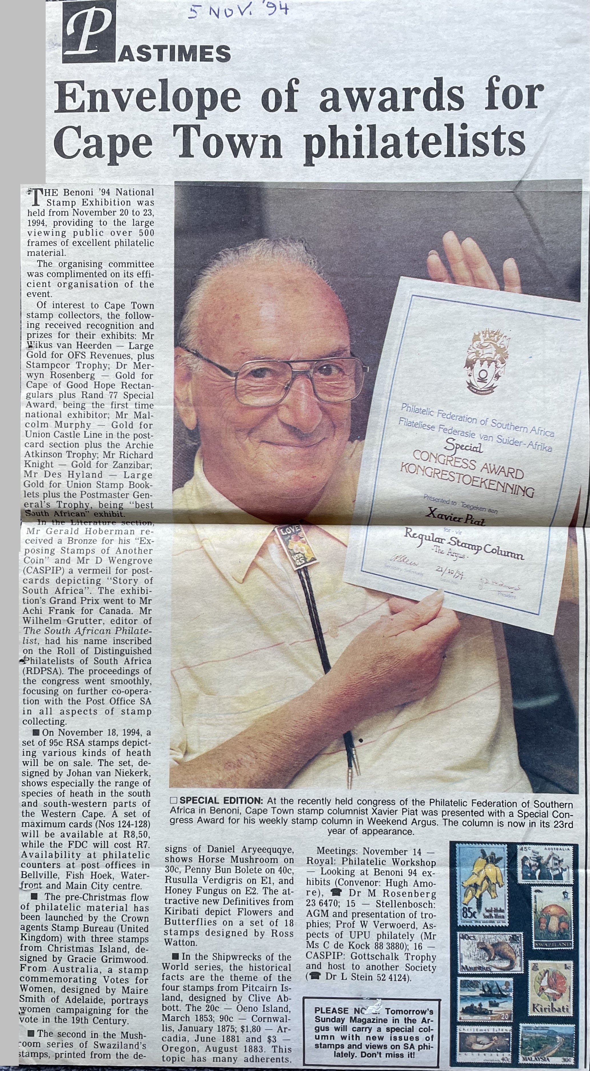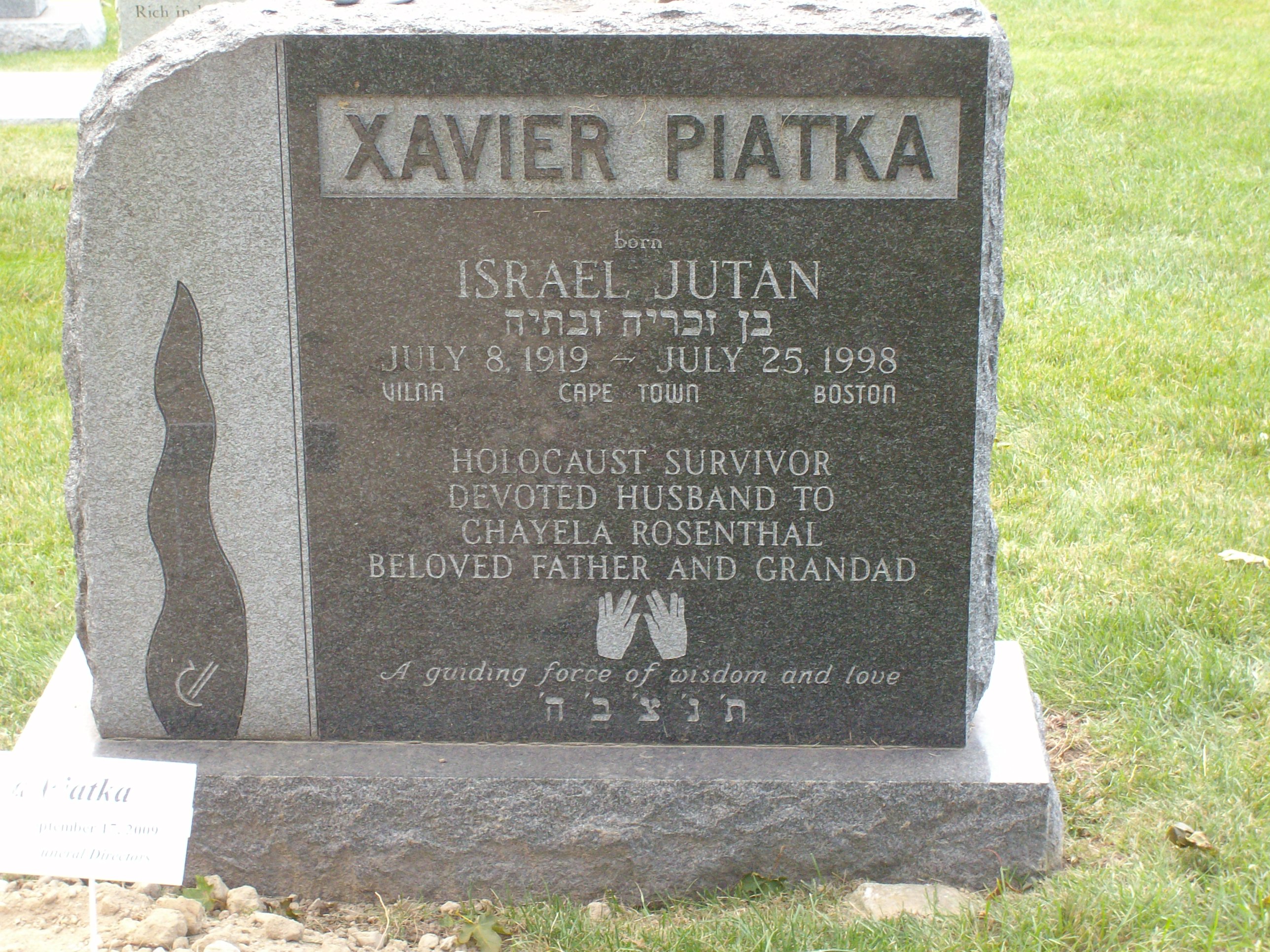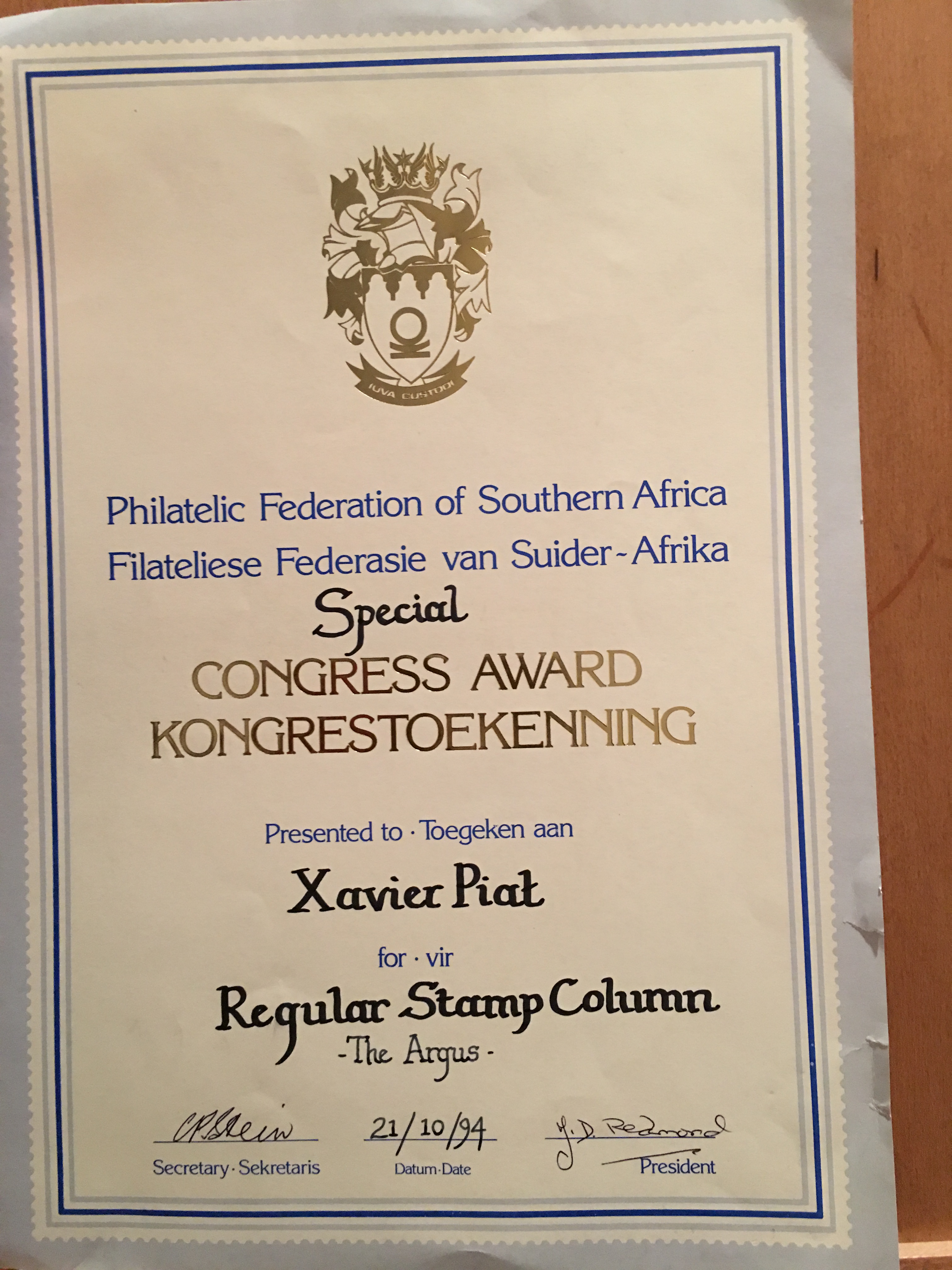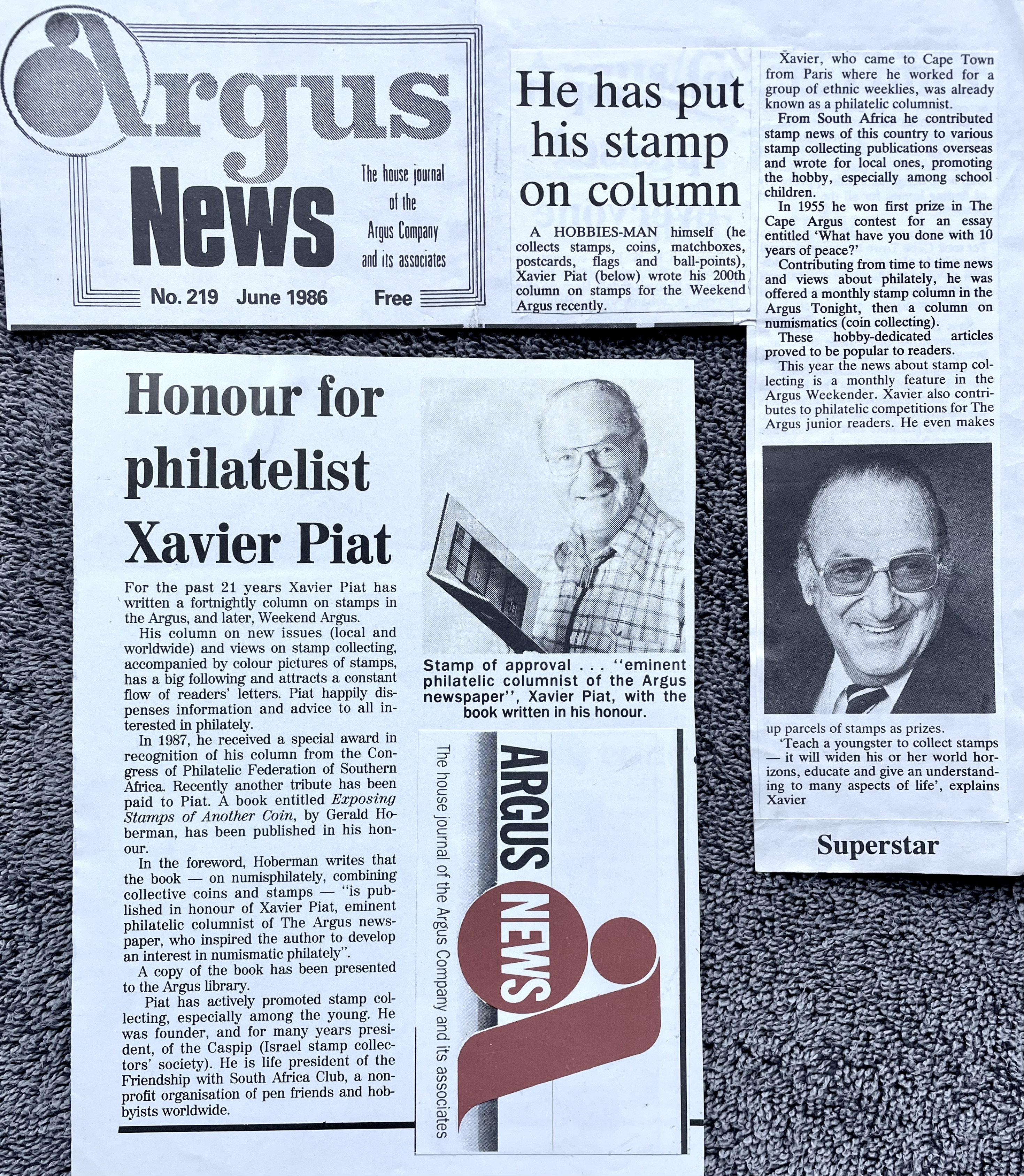 In keeping his promise to be of service to his friends and community he quickly became known and respected for his journalism through weekly publications of his philatelic “Stamp Column” and other regular articles published in the South African local newspapers, as well as his theatre and film reviews. Through his work with “Piat Promotions“, his Advertising Agency, he regularly promoted many local Jewish owned businesses in many publications. He was also managing editor of the “South African Jewish Times” newspaper. He became a beloved private coach to prospective stamp collectors of all ages. He was involved in founding the award winning and internationally recognised “Cape Society for Palestine and Israel Philately” (CASPIP) organisation and was the editor of its monthly newspaper. For many years, Xavier wrote the popular weekly columns about stamps in the daily newspapers. He also founded the Africa Friendship Club, a pen-pal organization that united people from all over the world who would share stories about their countries and exchange stamps. Xavier spent many years as an active member and secretary of Cape Town’s Bnai Brith Bar Kochba lodge and as editor of its quarterly news bulletin, travelling to world congresses and later becoming National Vice President of the organization. As one of the founders, and a life-long devoted member of the She’erith Hapletah – a group where Holocaust survivors regularly came together to share their stories, get support and more, formed in 1952, – Xavier and his wife hosted many of these gatherings and educational events in their home. His suggestion to erect a Holocaust memorial monument in the Cape Town Jewish cemetery, and his fundraising efforts resulted in the installation of such in 1990. Realizing the importance of recording history so no one forgets the holocaust, Xavier conceived the idea to record the holocaust testimonials of the local survivors and his perseverance on this project, with the help of Myra Osrin, resulted in the printing and release of the book “IN SACRED MEMORY”, edited by Gwynne Schrire. in 1995. Xavier was an integral contributing part of creating, and was an honorable member of, the internationally highly respected Cape Town Holocaust and Genocide Centre opened just a few years before he passed away in 1998. For many years, around The Day of Remembrance (Yom Ha Shoah), Xavier wrote and published articles about the Holocaust in the local newspapers, to keep the memories alive and the lessons of evil remembered.