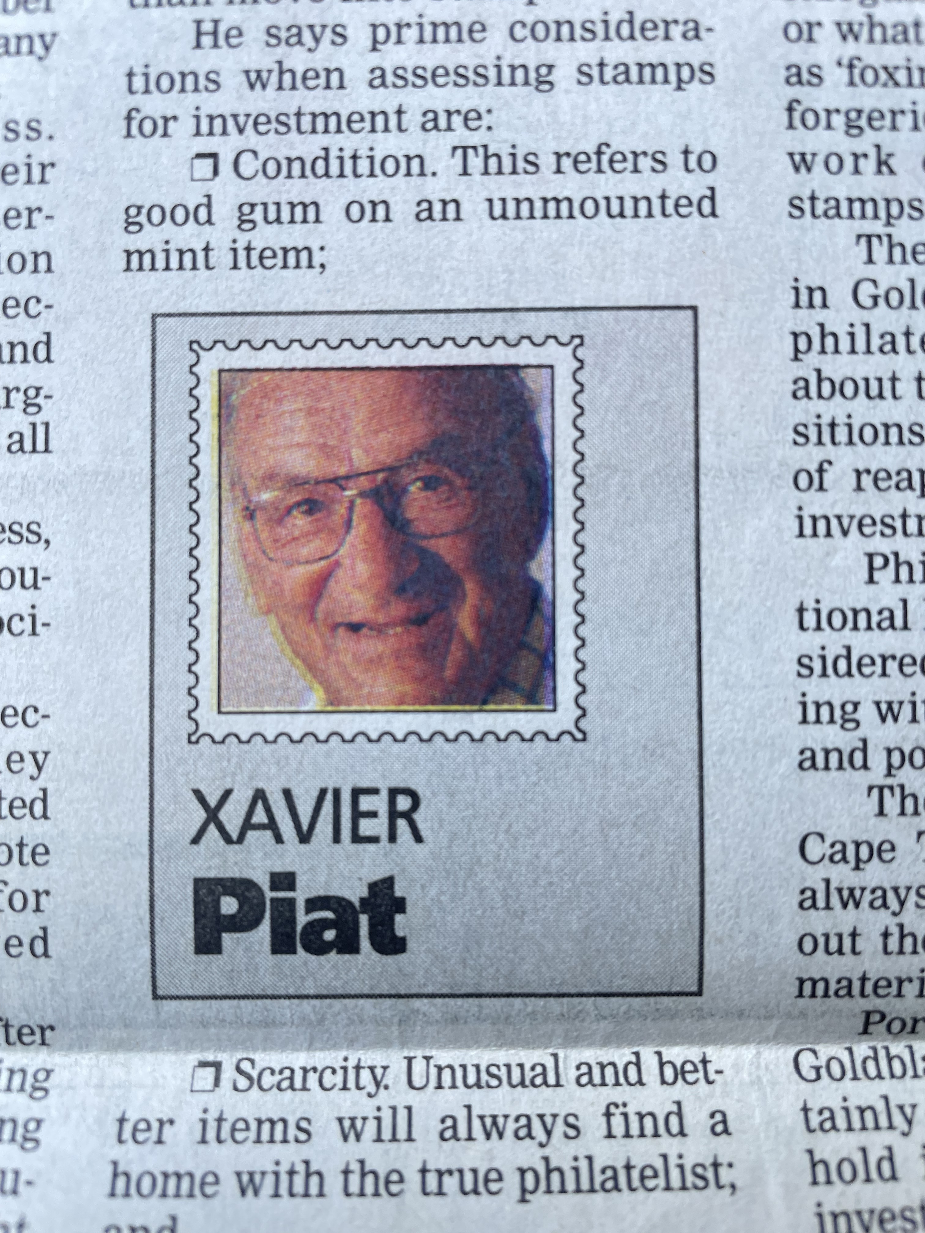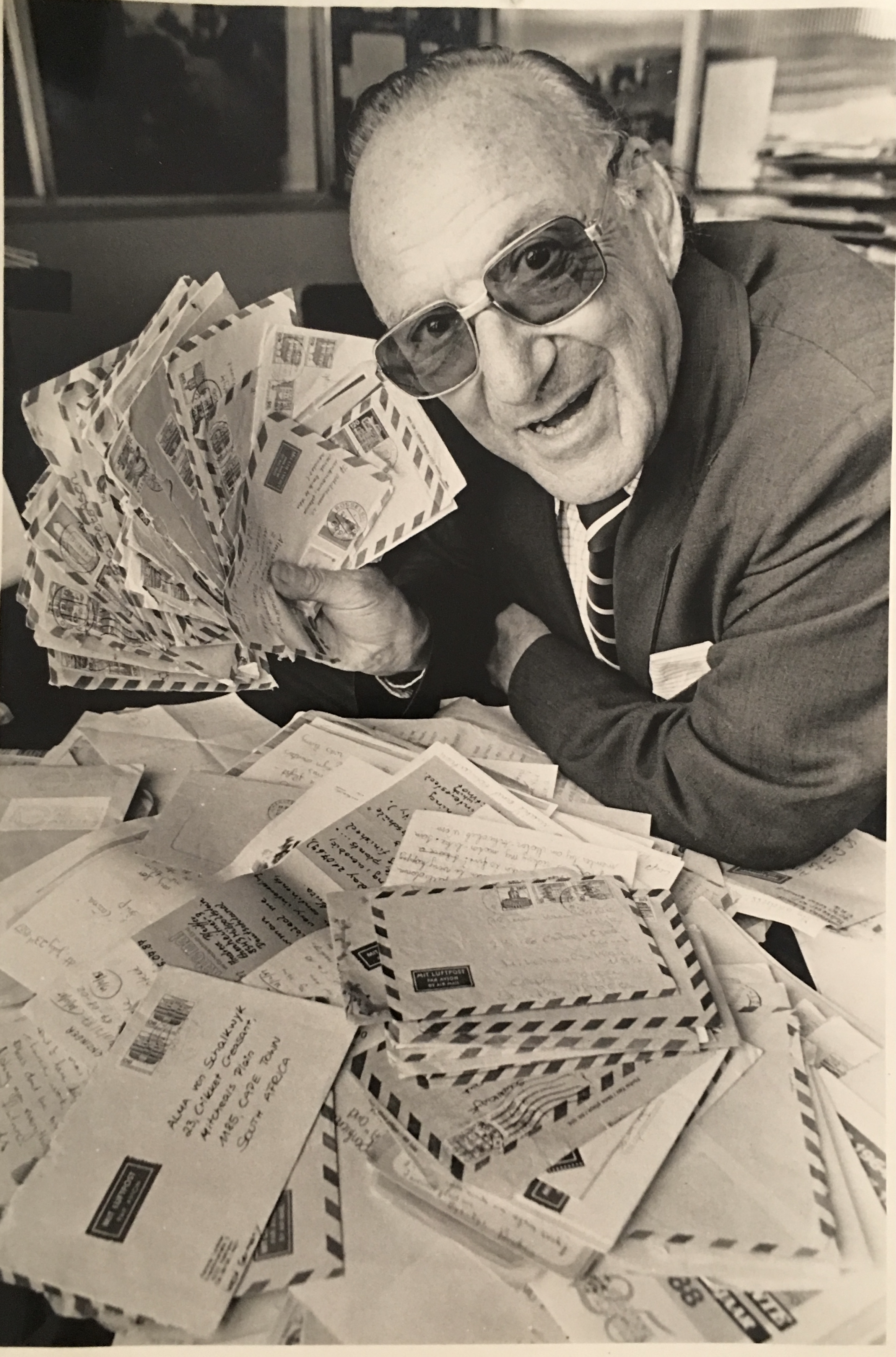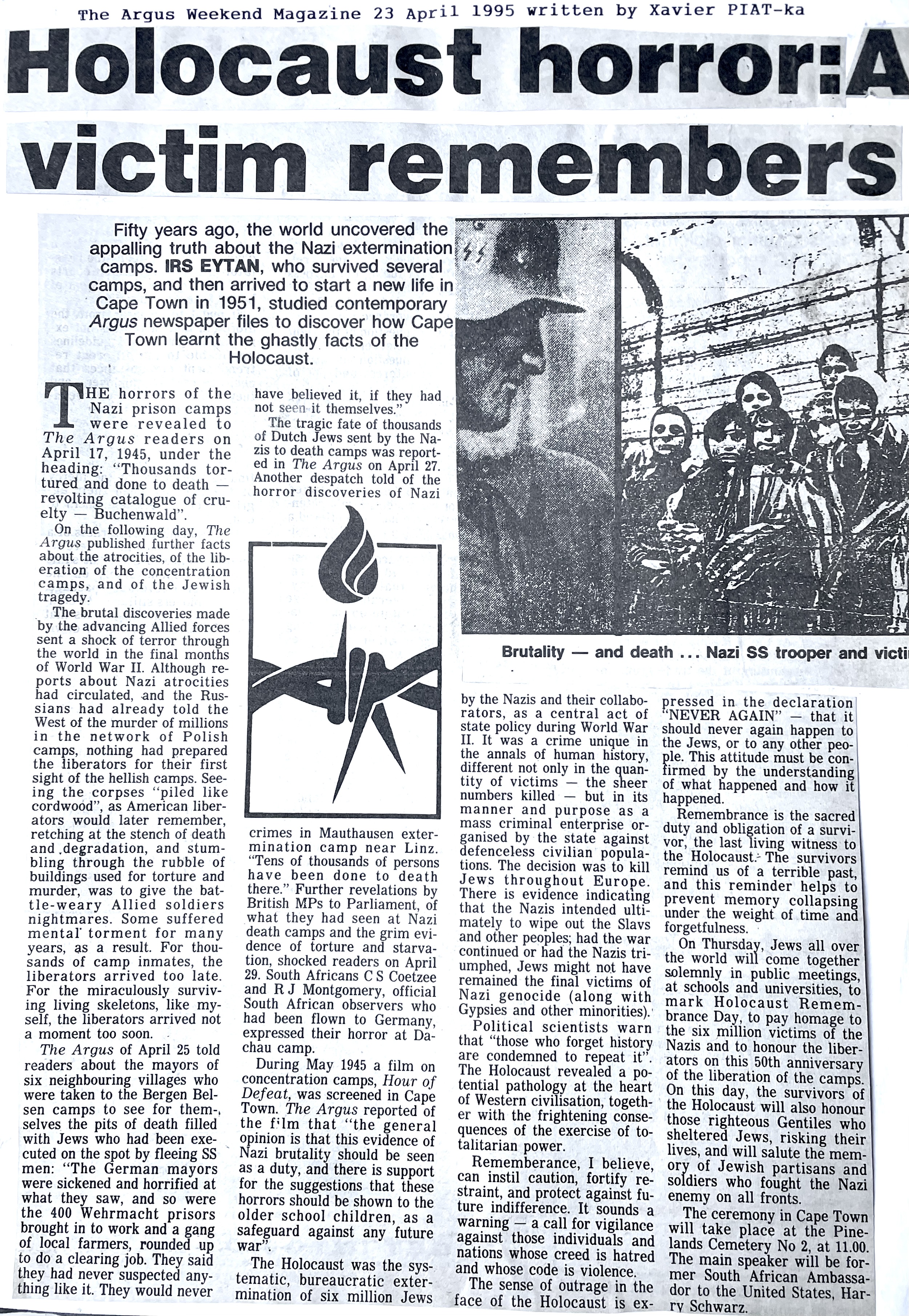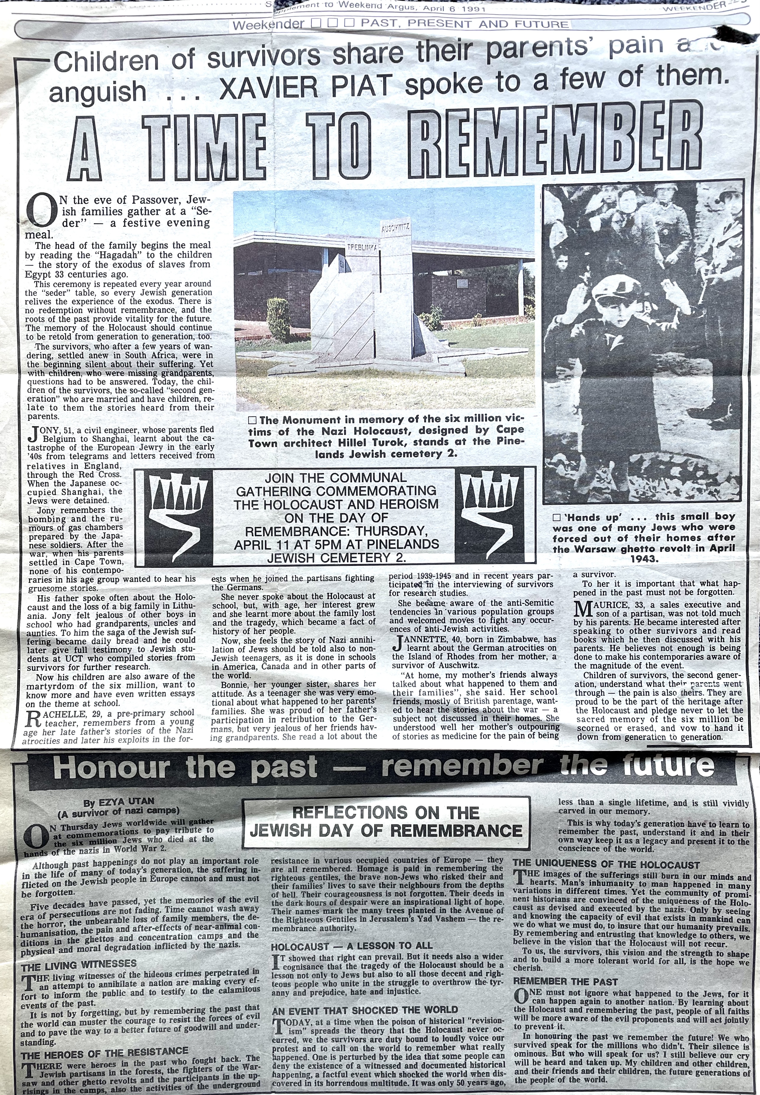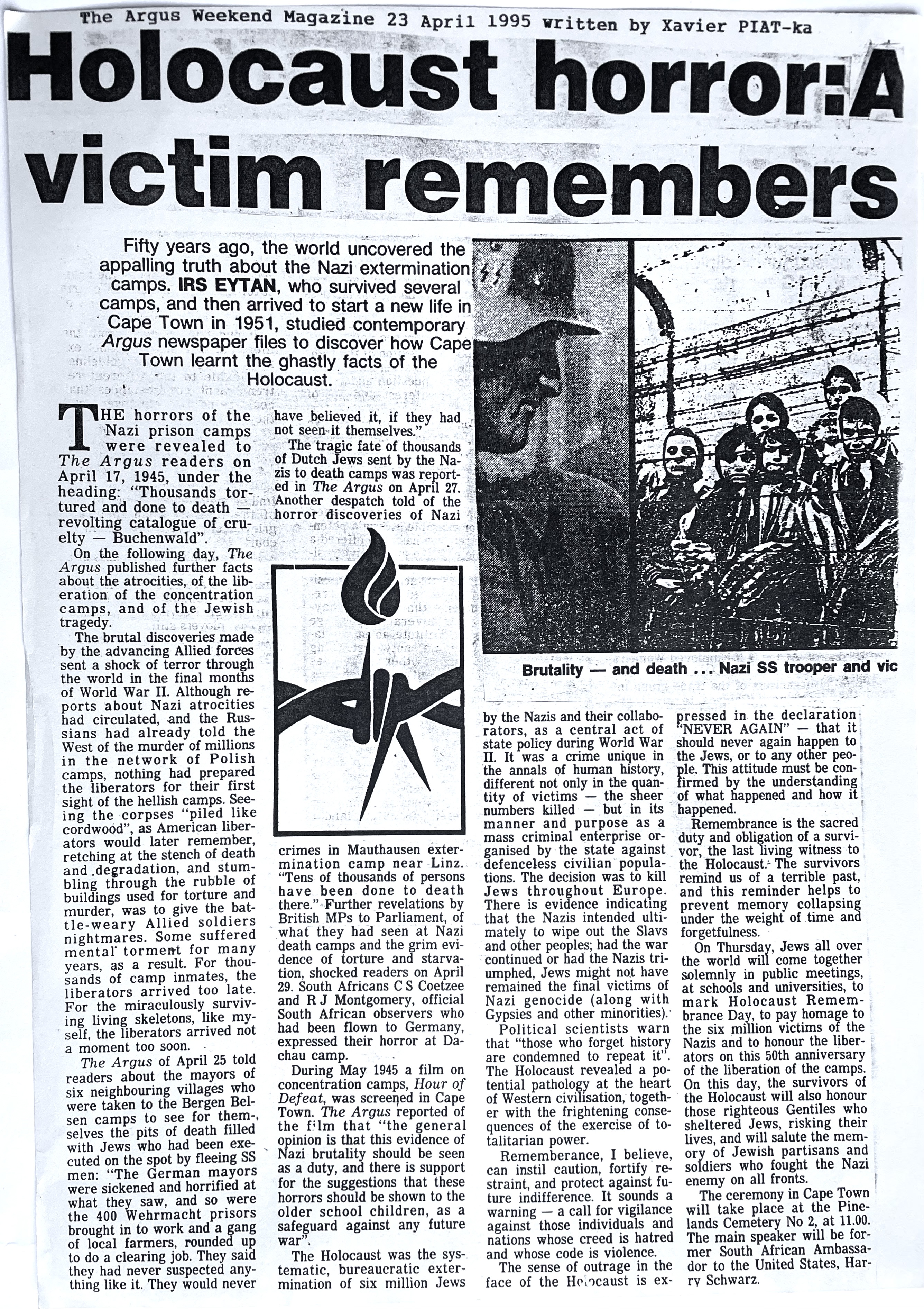 In keeping his promise to be of service to his friends and community he quickly became known and respected for his journalism through weekly publications of his philatelic “Stamp Column” and other regular articles published in the South African local newspapers, as well as his theatre and film reviews. Through his work with “Piat Promotions“, his Advertising Agency, he regularly promoted many local Jewish owned businesses in many publications. He was also managing editor of the “South African Jewish Times” newspaper. He became a beloved private coach to prospective stamp collectors of all ages. He was involved in founding the award winning and internationally recognised “Cape Society for Palestine and Israel Philately” (CASPIP) organisation and was the editor of its monthly newspaper. For many years, Xavier wrote the popular weekly columns about stamps in the daily newspapers. He also founded the Africa Friendship Club, a pen-pal organization that united people from all over the world who would share stories about their countries and exchange stamps. Xavier spent many years as an active member and secretary of Cape Town’s Bnai Brith Bar Kochba lodge and as editor of its quarterly news bulletin, travelling to world congresses and later becoming National Vice President of the organization. As one of the founders, and a life-long devoted member of the She’erith Hapletah – a group where Holocaust survivors regularly came together to share their stories, get support and more, formed in 1952, – Xavier and his wife hosted many of these gatherings and educational events in their home. His suggestion to erect a Holocaust memorial monument in the Cape Town Jewish cemetery, and his fundraising efforts resulted in the installation of such in 1990. Realizing the importance of recording history so no one forgets the holocaust, Xavier conceived the idea to record the holocaust testimonials of the local survivors and his perseverance on this project, with the help of Myra Osrin, resulted in the printing and release of the book “IN SACRED MEMORY”, edited by Gwynne Schrire. in 1995. Xavier was an integral contributing part of creating, and was an honorable member of, the internationally highly respected Cape Town Holocaust and Genocide Centre opened just a few years before he passed away in 1998. For many years, around The Day of Remembrance (Yom Ha Shoah), Xavier wrote and published articles about the Holocaust in the local newspapers, to keep the memories alive and the lessons of evil remembered.