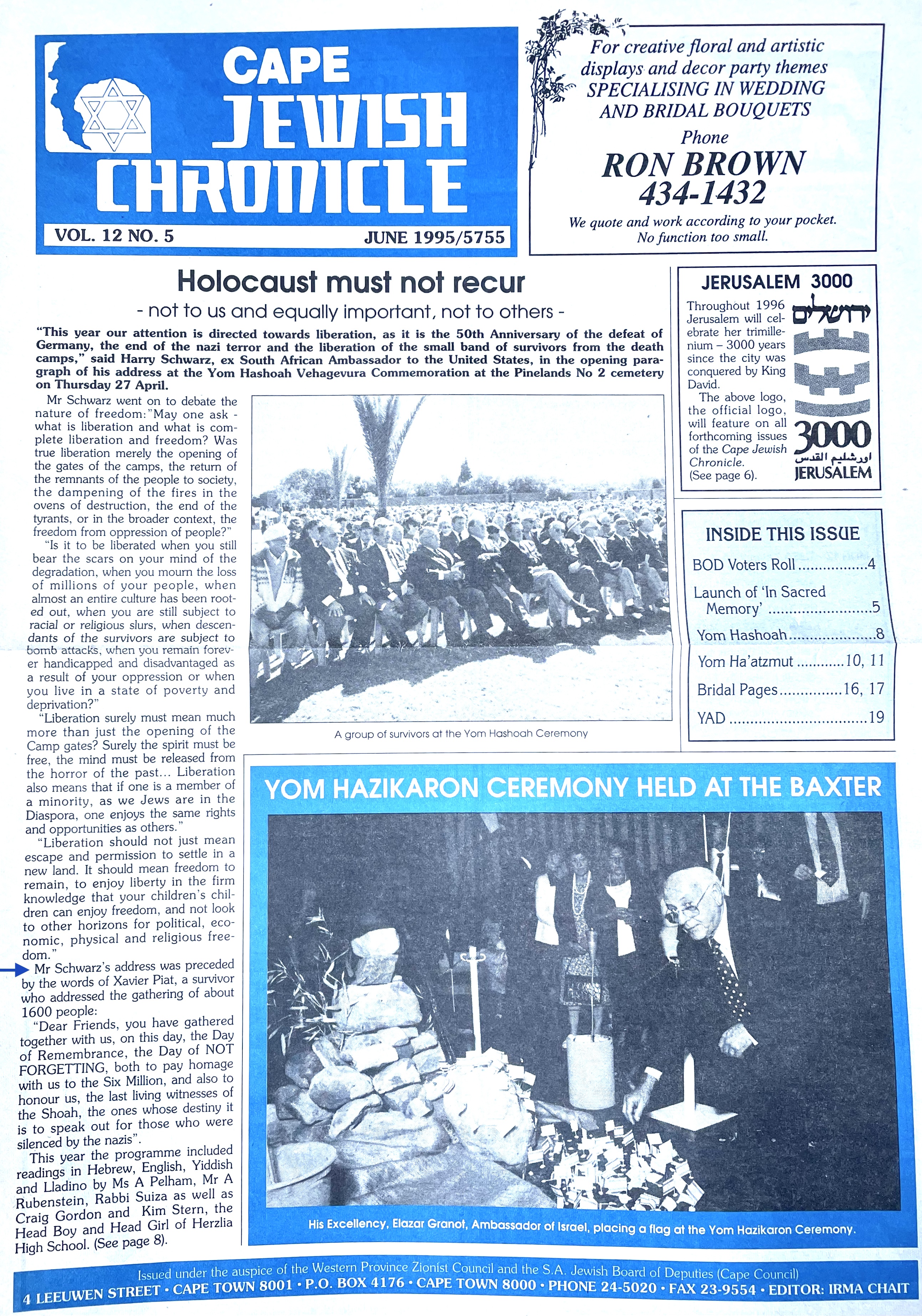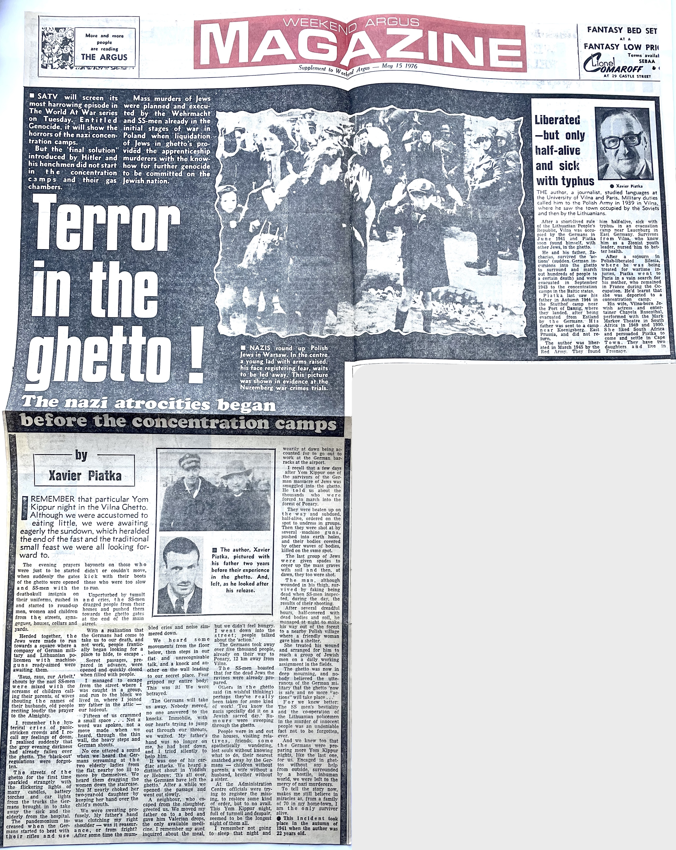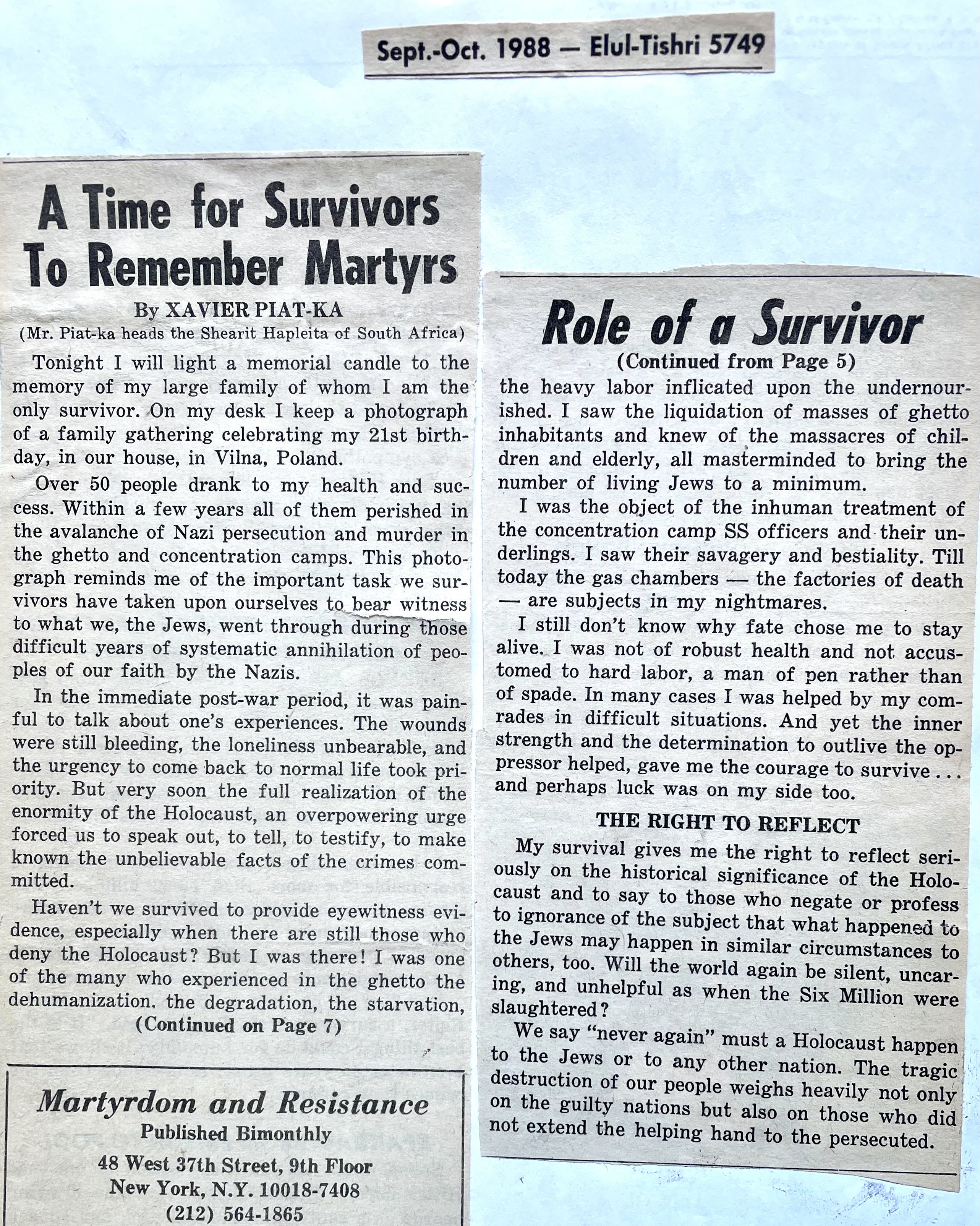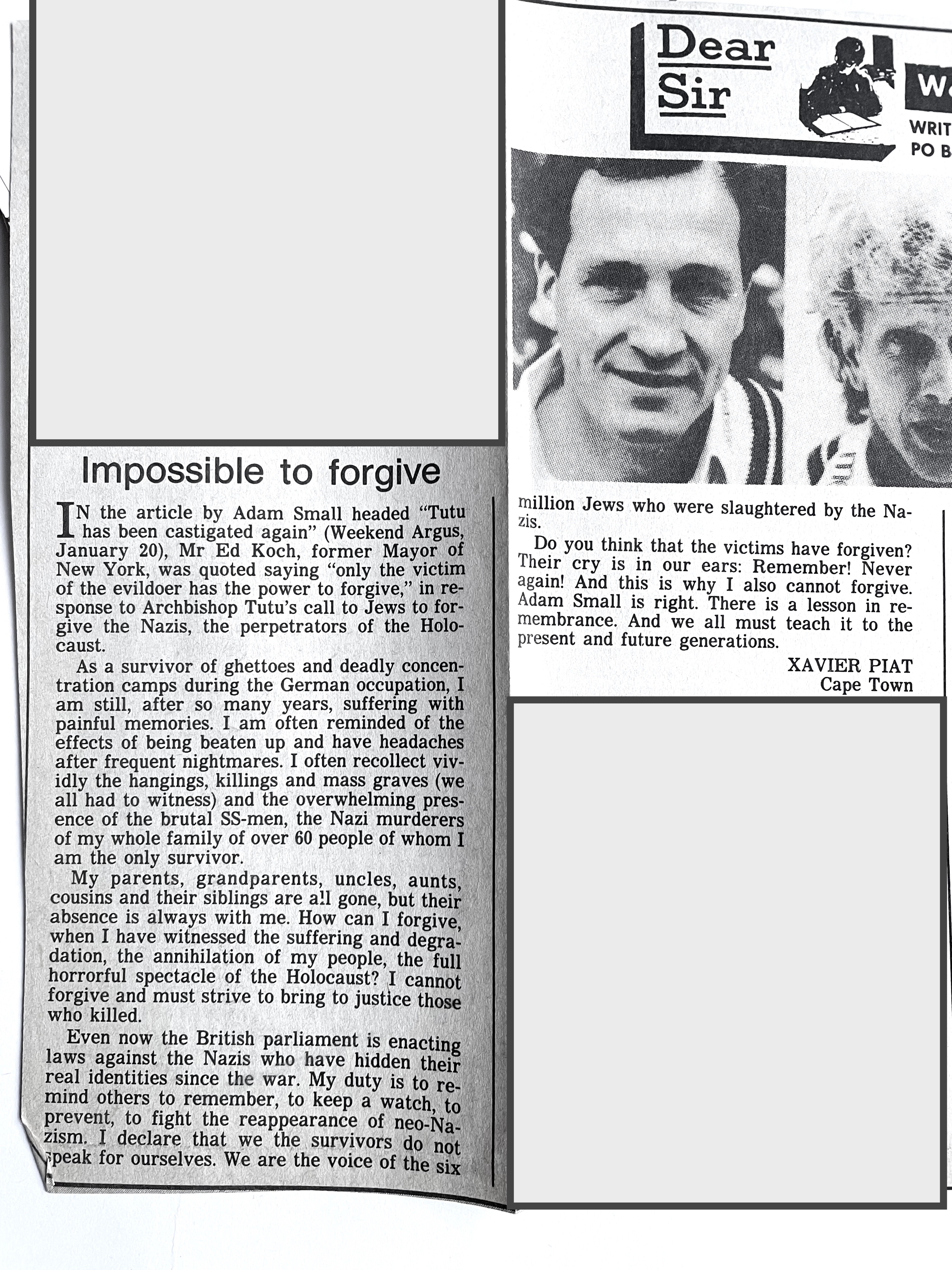 In keeping his promise to be of service to his friends and community he quickly became known and respected for his journalism through weekly publications of his philatelic “Stamp Column” and other regular articles published in the South African local newspapers, as well as his theatre and film reviews. Through his work with “Piat Promotions“, his Advertising Agency, he regularly promoted many local Jewish owned businesses in many publications. He was also managing editor of the “South African Jewish Times” newspaper. He became a beloved private coach to prospective stamp collectors of all ages. He was involved in founding the award winning and internationally recognised “Cape Society for Palestine and Israel Philately” (CASPIP) organisation and was the editor of its monthly newspaper. For many years, Xavier wrote the popular weekly columns about stamps in the daily newspapers. He also founded the Africa Friendship Club, a pen-pal organization that united people from all over the world who would share stories about their countries and exchange stamps. Xavier spent many years as an active member and secretary of Cape Town’s Bnai Brith Bar Kochba lodge and as editor of its quarterly news bulletin, travelling to world congresses and later becoming National Vice President of the organization. As one of the founders, and a life-long devoted member of the She’erith Hapletah – a group where Holocaust survivors regularly came together to share their stories, get support and more, formed in 1952, – Xavier and his wife hosted many of these gatherings and educational events in their home. His suggestion to erect a Holocaust memorial monument in the Cape Town Jewish cemetery, and his fundraising efforts resulted in the installation of such in 1990. Realizing the importance of recording history so no one forgets the holocaust, Xavier conceived the idea to record the holocaust testimonials of the local survivors and his perseverance on this project, with the help of Myra Osrin, resulted in the printing and release of the book “IN SACRED MEMORY”, edited by Gwynne Schrire. in 1995. Xavier was an integral contributing part of creating, and was an honorable member of, the internationally highly respected Cape Town Holocaust and Genocide Centre opened just a few years before he passed away in 1998. For many years, around The Day of Remembrance (Yom Ha Shoah), Xavier wrote and published articles about the Holocaust in the local newspapers, to keep the memories alive and the lessons of evil remembered.