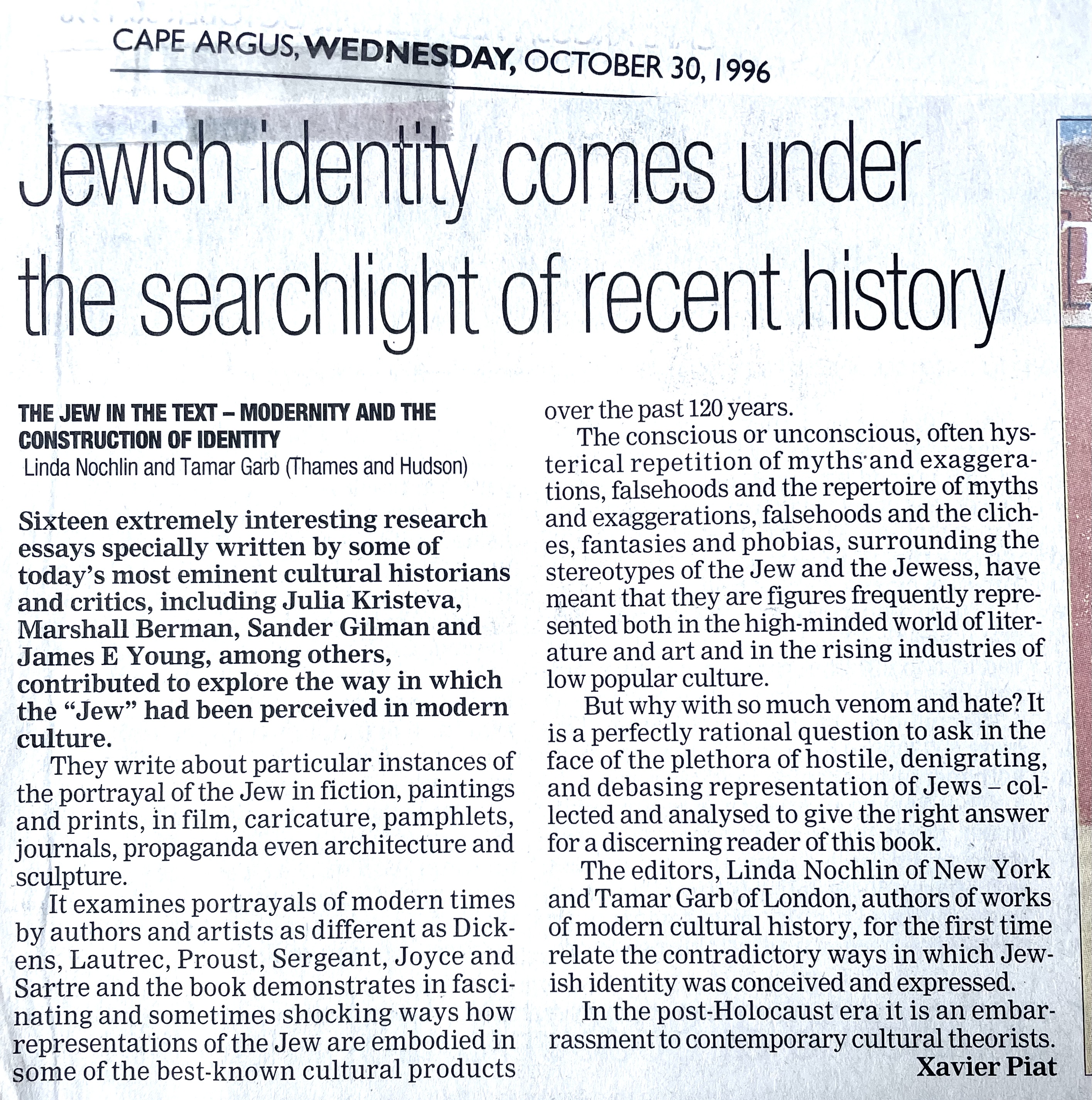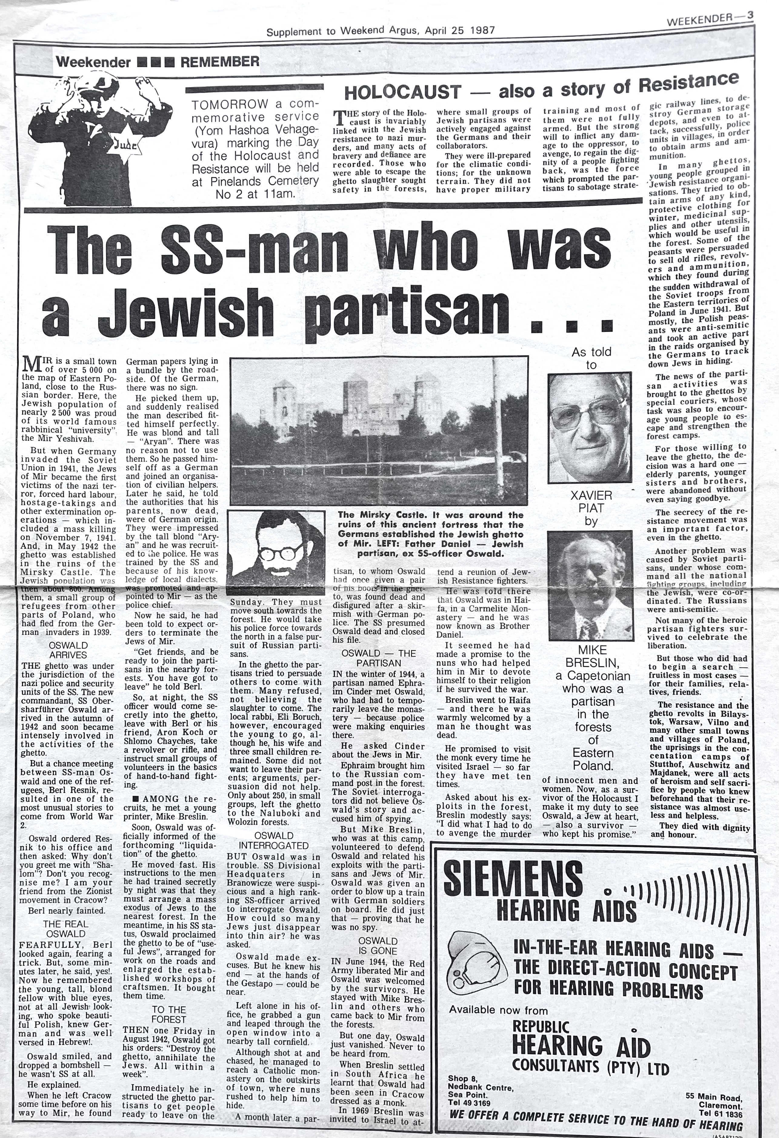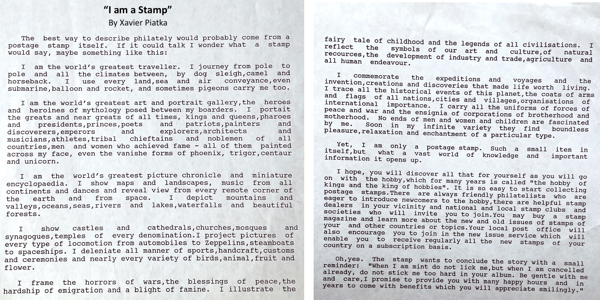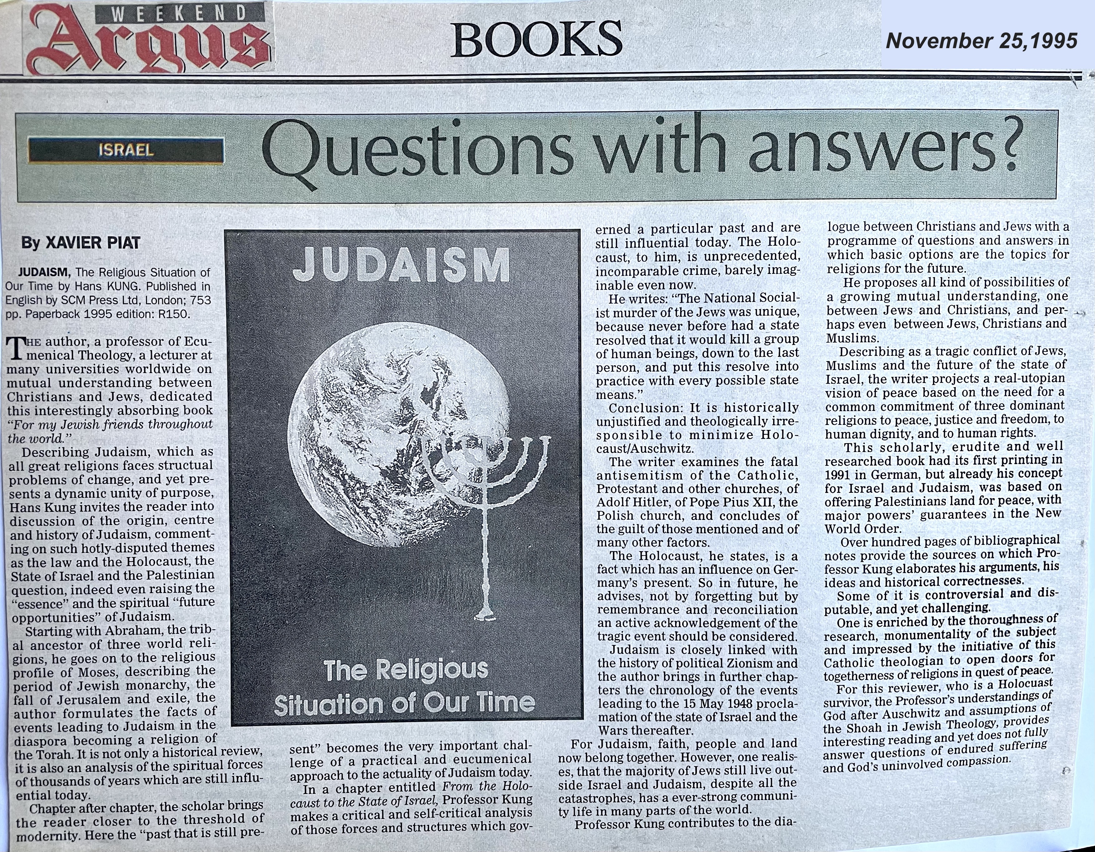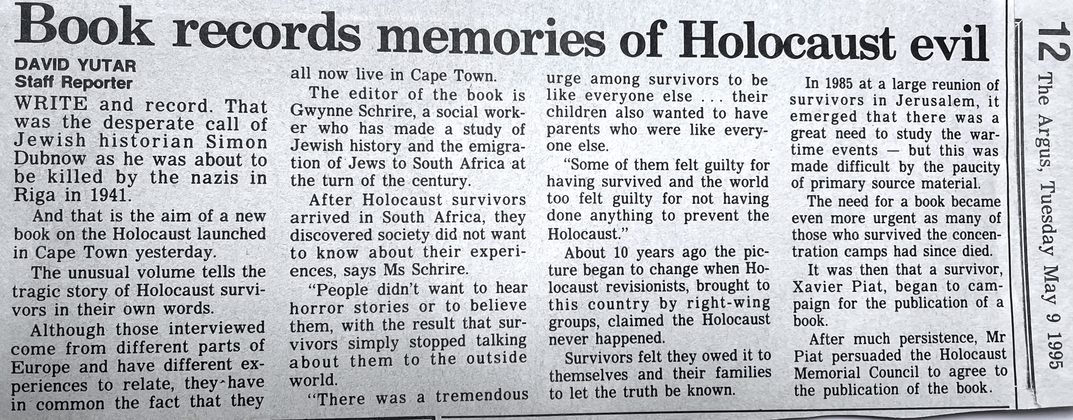 In keeping his promise to be of service to his friends and community he quickly became known and respected for his journalism through weekly publications of his philatelic “Stamp Column” and other regular articles published in the South African local newspapers, as well as his theatre and film reviews. Through his work with “Piat Promotions“, his Advertising Agency, he regularly promoted many local Jewish owned businesses in many publications. He was also managing editor of the “South African Jewish Times” newspaper. He became a beloved private coach to prospective stamp collectors of all ages. He was involved in founding the award winning and internationally recognised “Cape Society for Palestine and Israel Philately” (CASPIP) organisation and was the editor of its monthly newspaper. For many years, Xavier wrote the popular weekly columns about stamps in the daily newspapers. He also founded the Africa Friendship Club, a pen-pal organization that united people from all over the world who would share stories about their countries and exchange stamps. Xavier spent many years as an active member and secretary of Cape Town’s Bnai Brith Bar Kochba lodge and as editor of its quarterly news bulletin, travelling to world congresses and later becoming National Vice President of the organization. As one of the founders, and a life-long devoted member of the She’erith Hapletah – a group where Holocaust survivors regularly came together to share their stories, get support and more, formed in 1952, – Xavier and his wife hosted many of these gatherings and educational events in their home. His suggestion to erect a Holocaust memorial monument in the Cape Town Jewish cemetery, and his fundraising efforts resulted in the installation of such in 1990. Realizing the importance of recording history so no one forgets the holocaust, Xavier conceived the idea to record the holocaust testimonials of the local survivors and his perseverance on this project, with the help of Myra Osrin, resulted in the printing and release of the book “IN SACRED MEMORY”, edited by Gwynne Schrire. in 1995. Xavier was an integral contributing part of creating, and was an honorable member of, the internationally highly respected Cape Town Holocaust and Genocide Centre opened just a few years before he passed away in 1998. For many years, around The Day of Remembrance (Yom Ha Shoah), Xavier wrote and published articles about the Holocaust in the local newspapers, to keep the memories alive and the lessons of evil remembered.