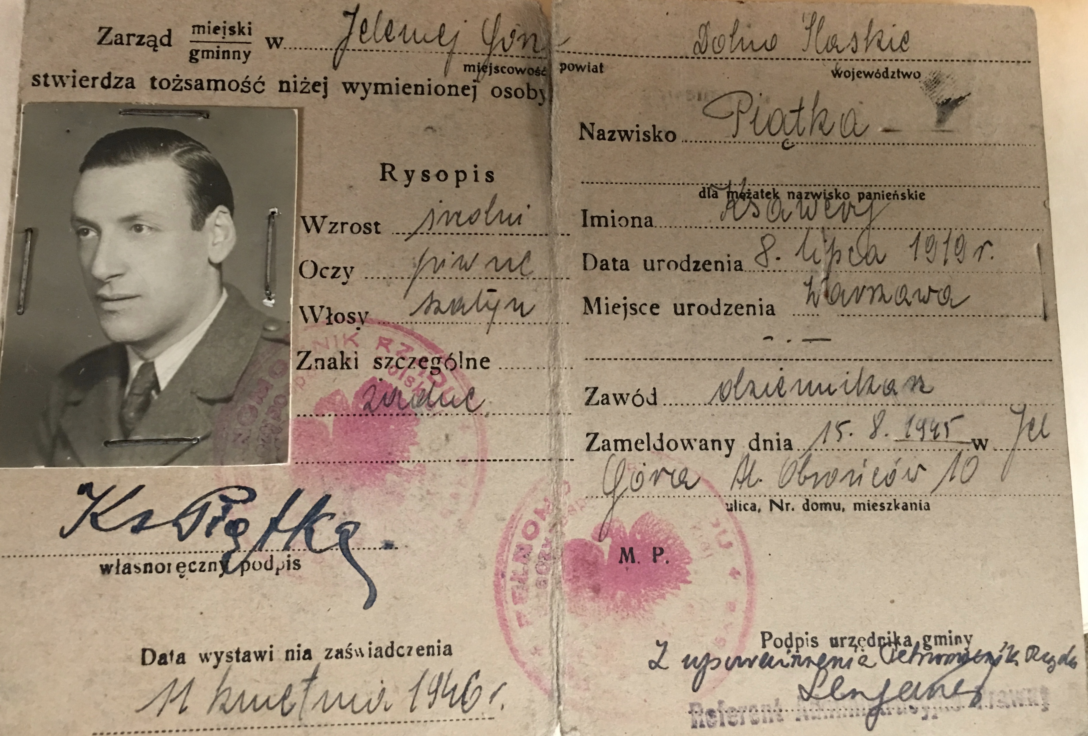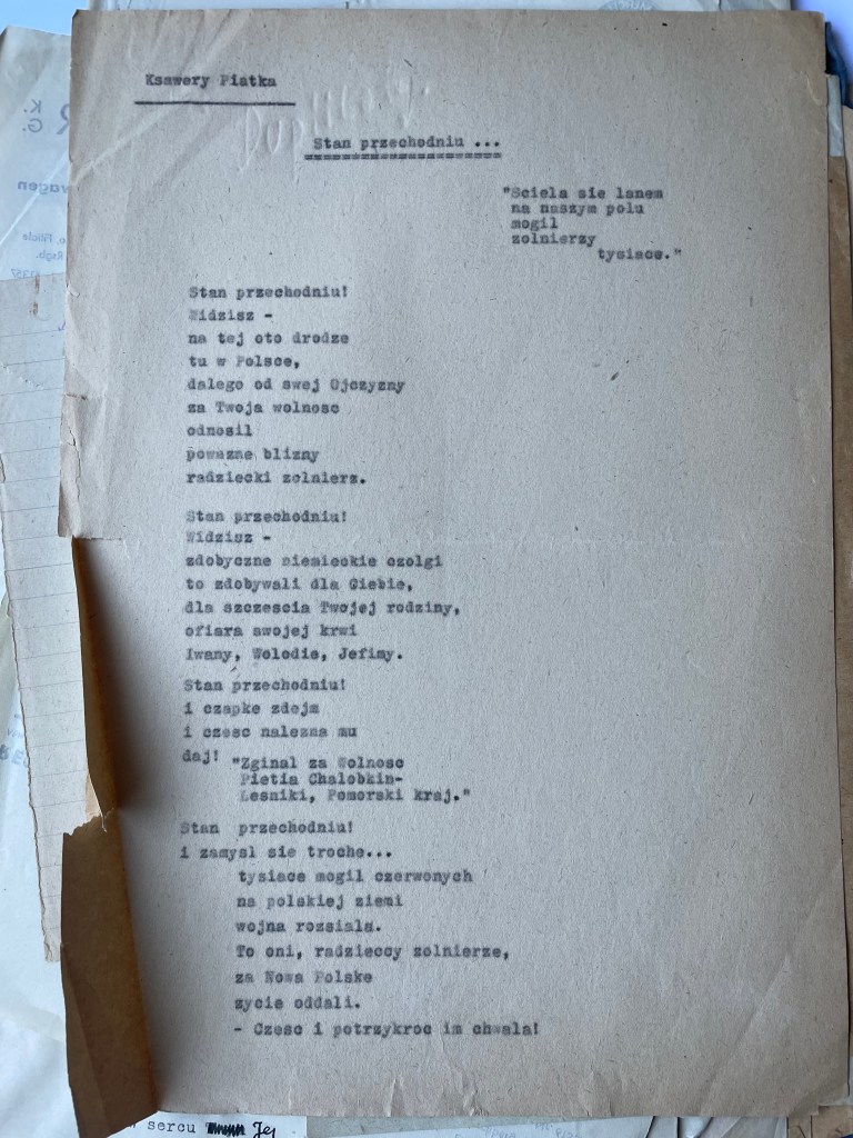 While still in Lembork, Xavier had befriended a good Jewish Russian officer who helped him secure a job with the new Polish administration of Lembork, where Xavier now helped with the registration of refugees and incoming Poles, who wanted to get houses from German families. He helped many refugees by issuing new papers for them, falsifying their “birth place” towns so to avoid conscription into the Russian army.