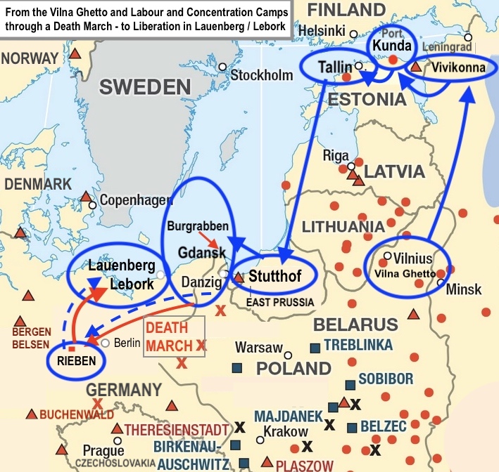 Four days before Port Kunda would be liberated, new SS men in uniforms arrived, ordered the prisoners to take food for two days, marched them toward the railway station and packed them into the train trucks which brought them into Tallin, the capital of Estonia. Within two days, Xavier and his fellow prisoners had then been put on a big boat and shipped off to Danzig. This boat was commissioned to bring all the Jewish labour forces to the SS-extermination death camp, Stutthof, in East Prussia. On the boat, Xavier reunited with his father once again after not seeing him for a year and a half…. Zacharius had just been evacuated from Camp Klooga and placed on this boat heading for Gdansk/Danzig.