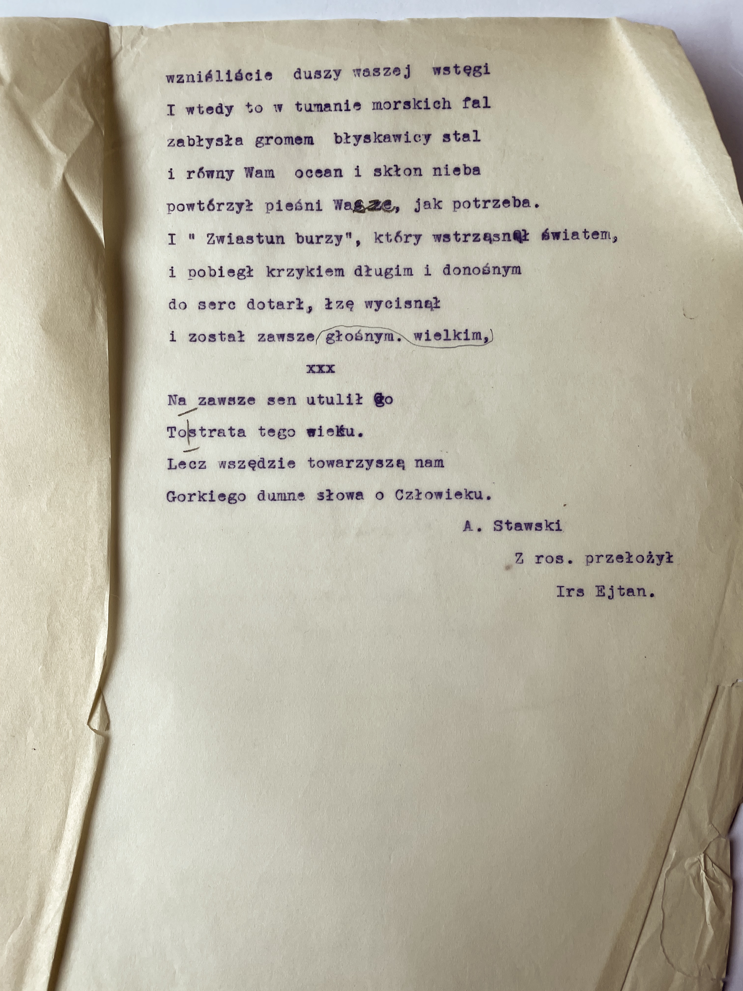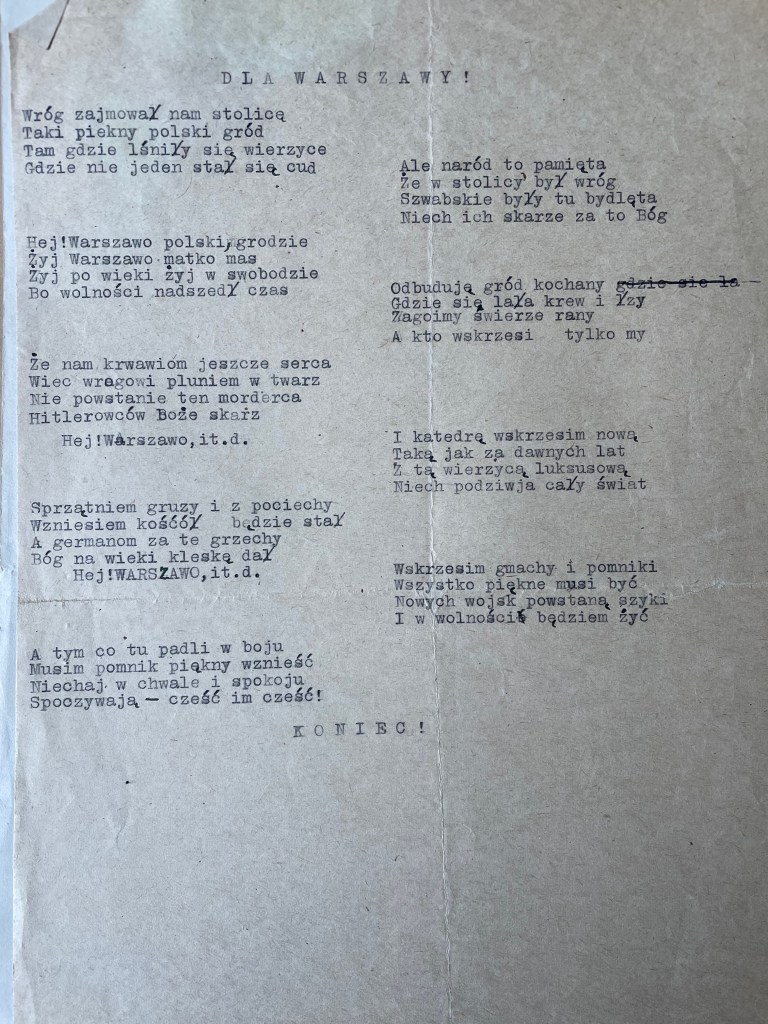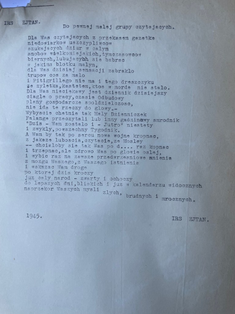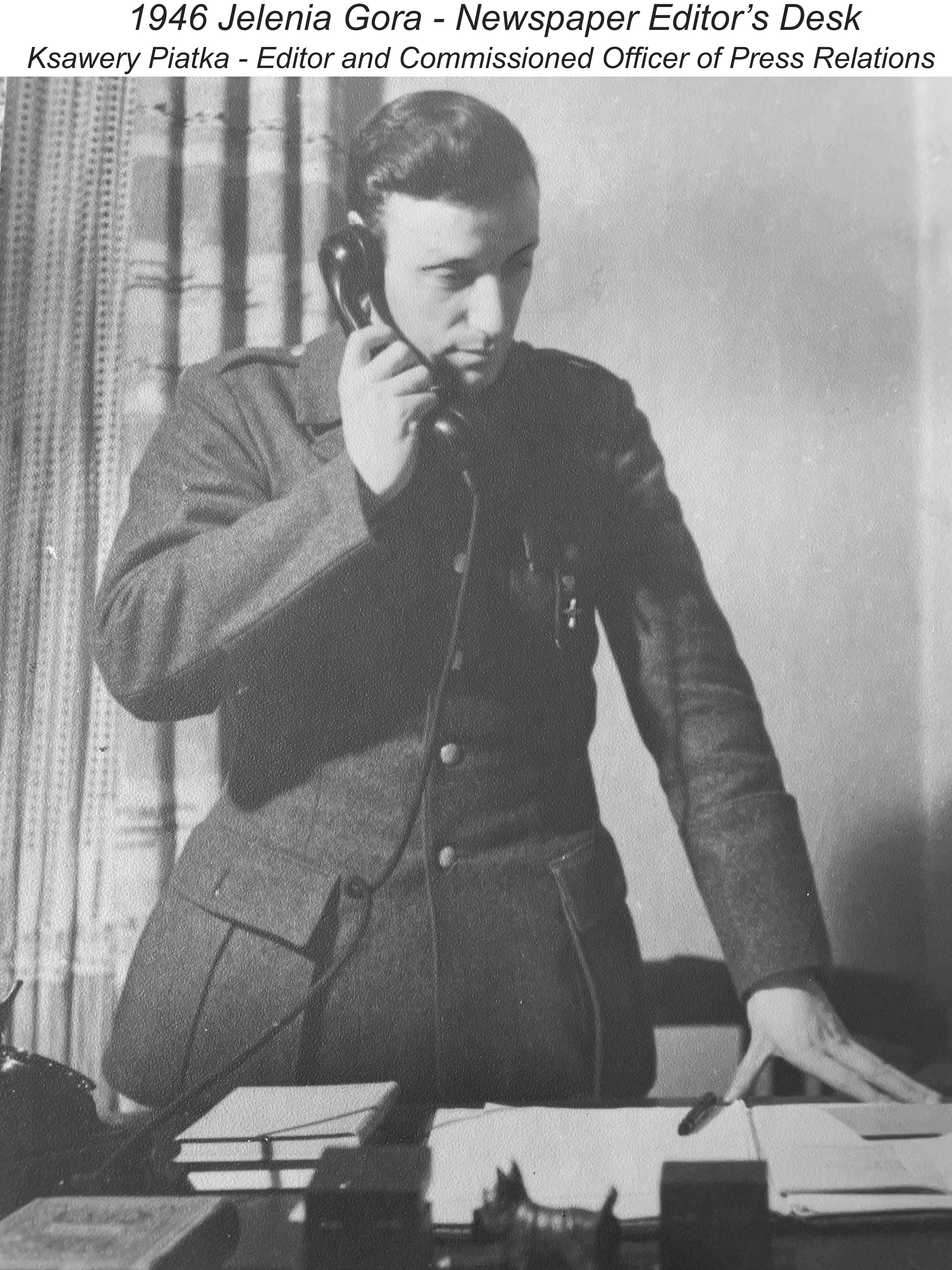 A few months later, Xavier went with Chayela to visit her sister Mary. who had moved with her friend to Lodz. Along the way, they stopped in Bydgoszcz, an old Polish town. A Jewish committee had recently been formed and were announcing over the radio that they were calling for artists, actors and singers to audition for an entertainment – theatre group. While Chayela was auditioning at the radio station, Xavier went for a walk and bumped into his old “Vilna Truth” newspaper editor, Malinowski. Tears and stories were shared and Malinowski arranged to give Xavier back his name, identity, registration papers, and a job as a roving reporter for the “Wolna Polska” (A Free Poland) newspaper published for the Polish population and freely distributed by the Red Army.