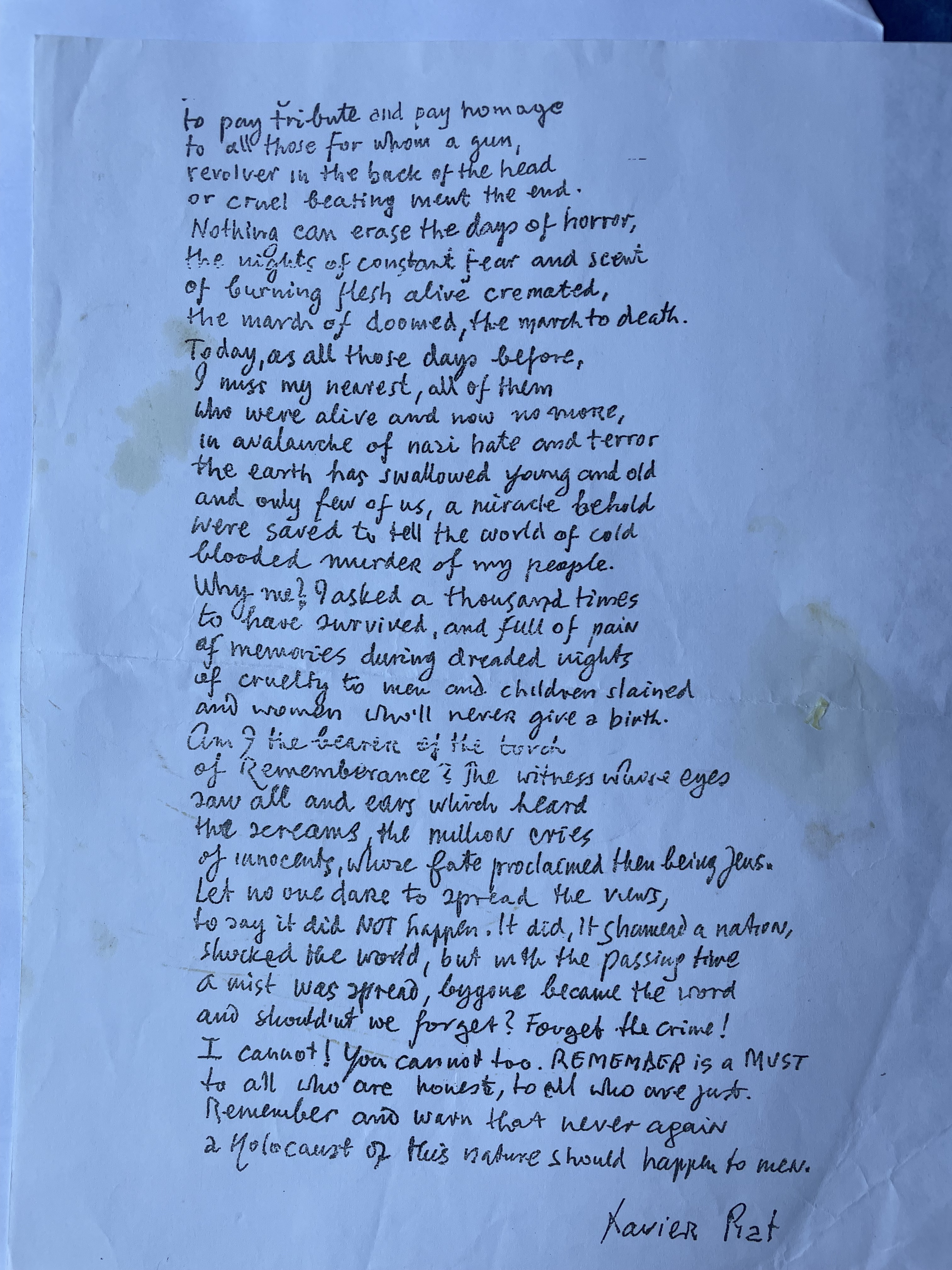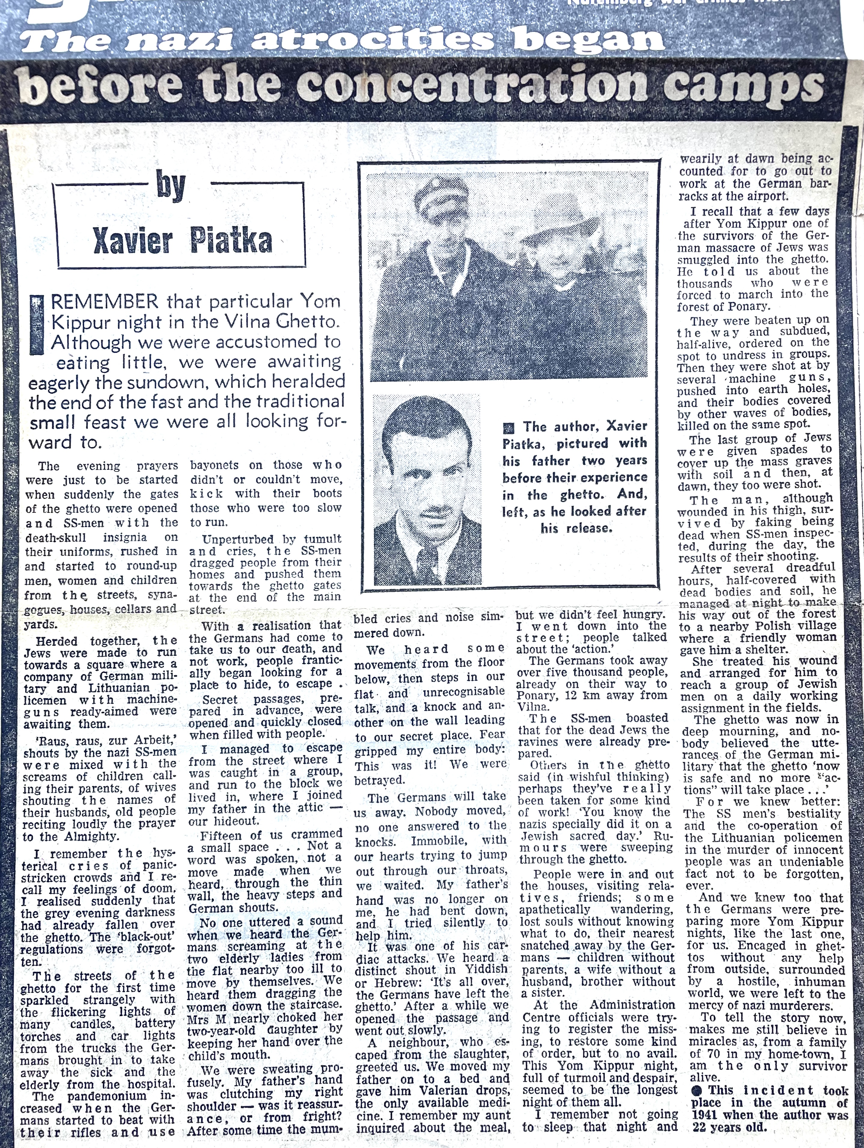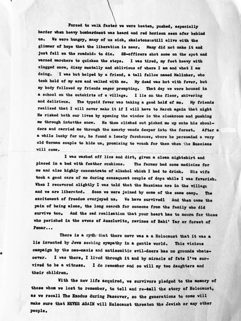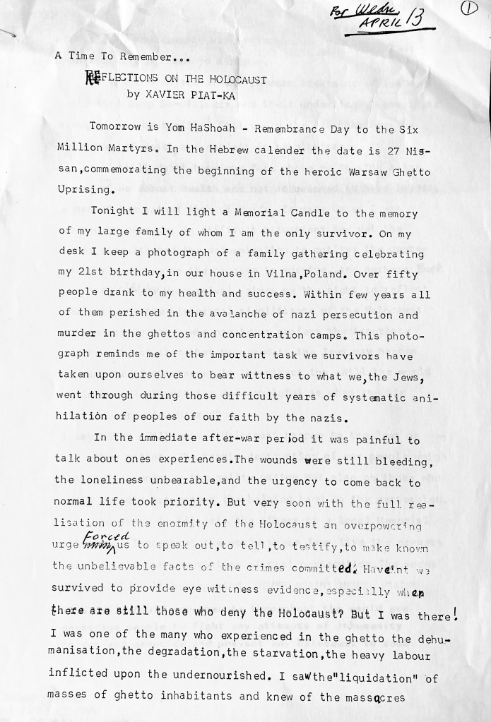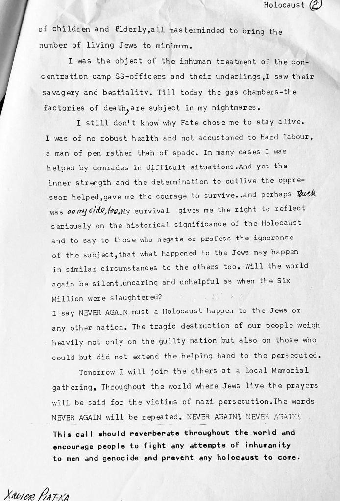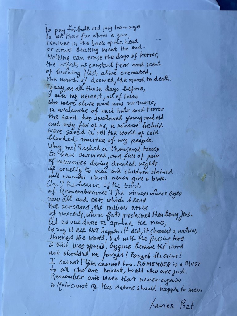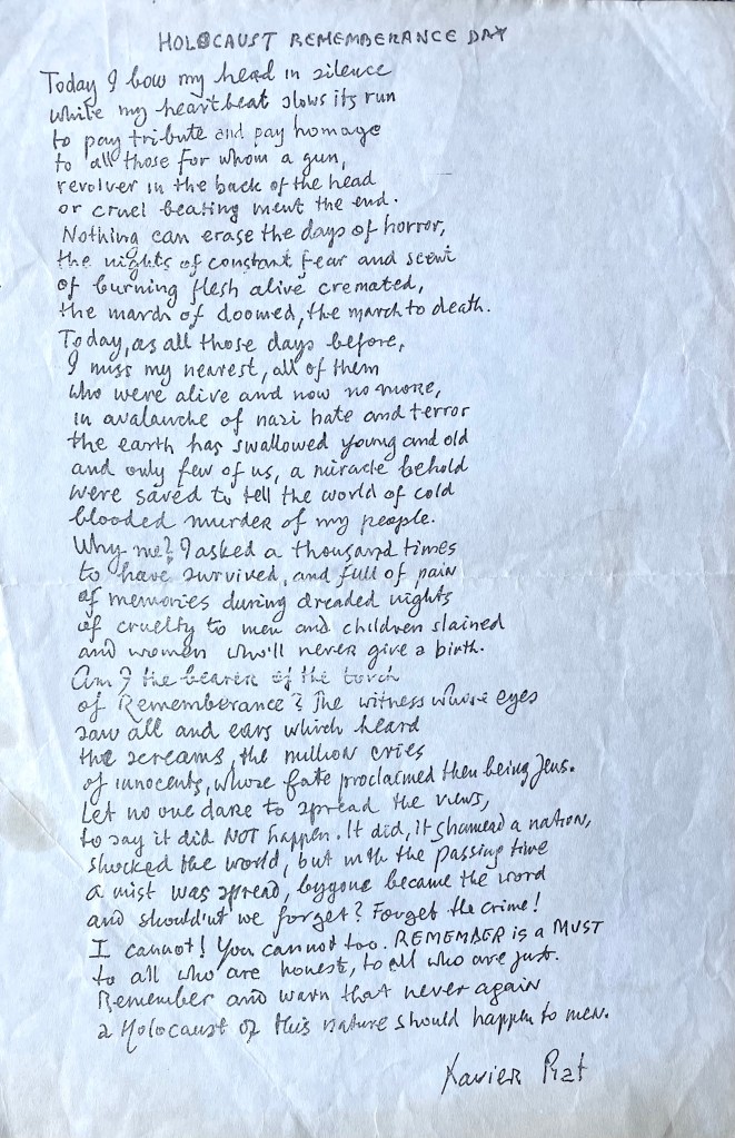 Xavier’s life stories, war recollections, poems and educational articles were published in numerous publications, newspapers, magazines and books including Sir Martin Gilbert‘s book about the Holocaust, “THE DAY THE WAR ENDED“. Xavier can be heard given over six and a half hours of testimony in Stephen Spielberg’s Shoah Foundation film archives. These can be viewed below. Over the years Xavier shared all his memoirs with his children, many of which are included in the book “NO GOODBYES – A Father Daughter Memoir of Love, War and Resurrection”, written by Naava Piatka.