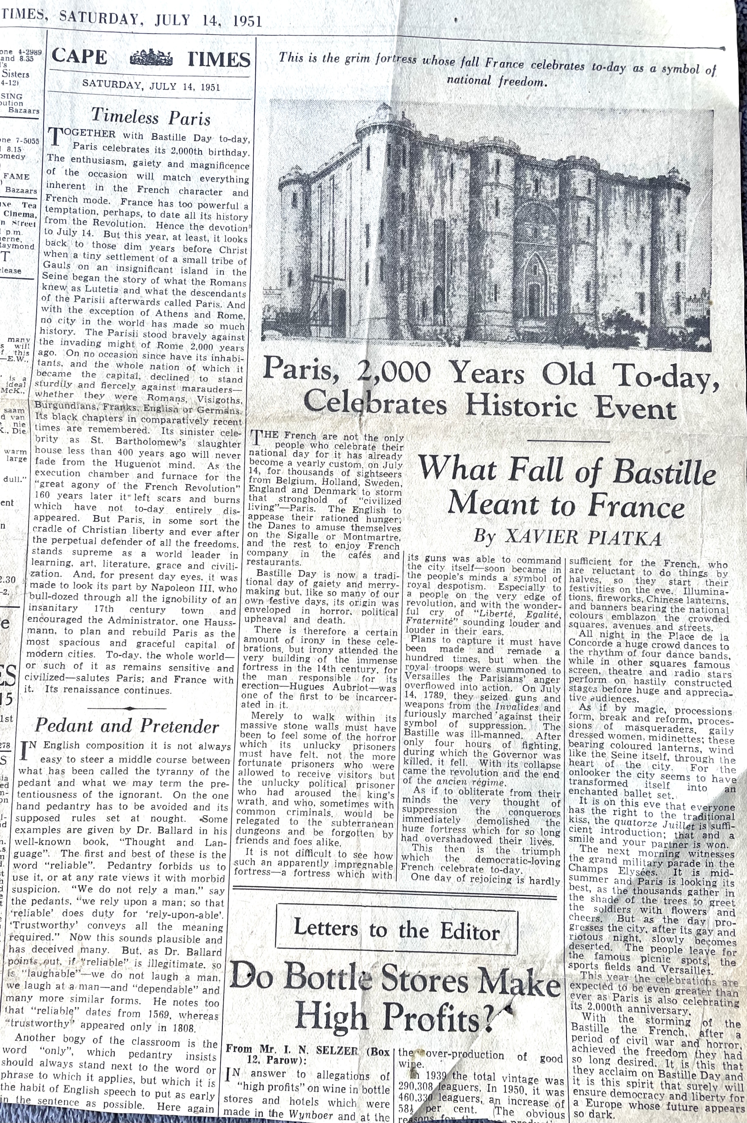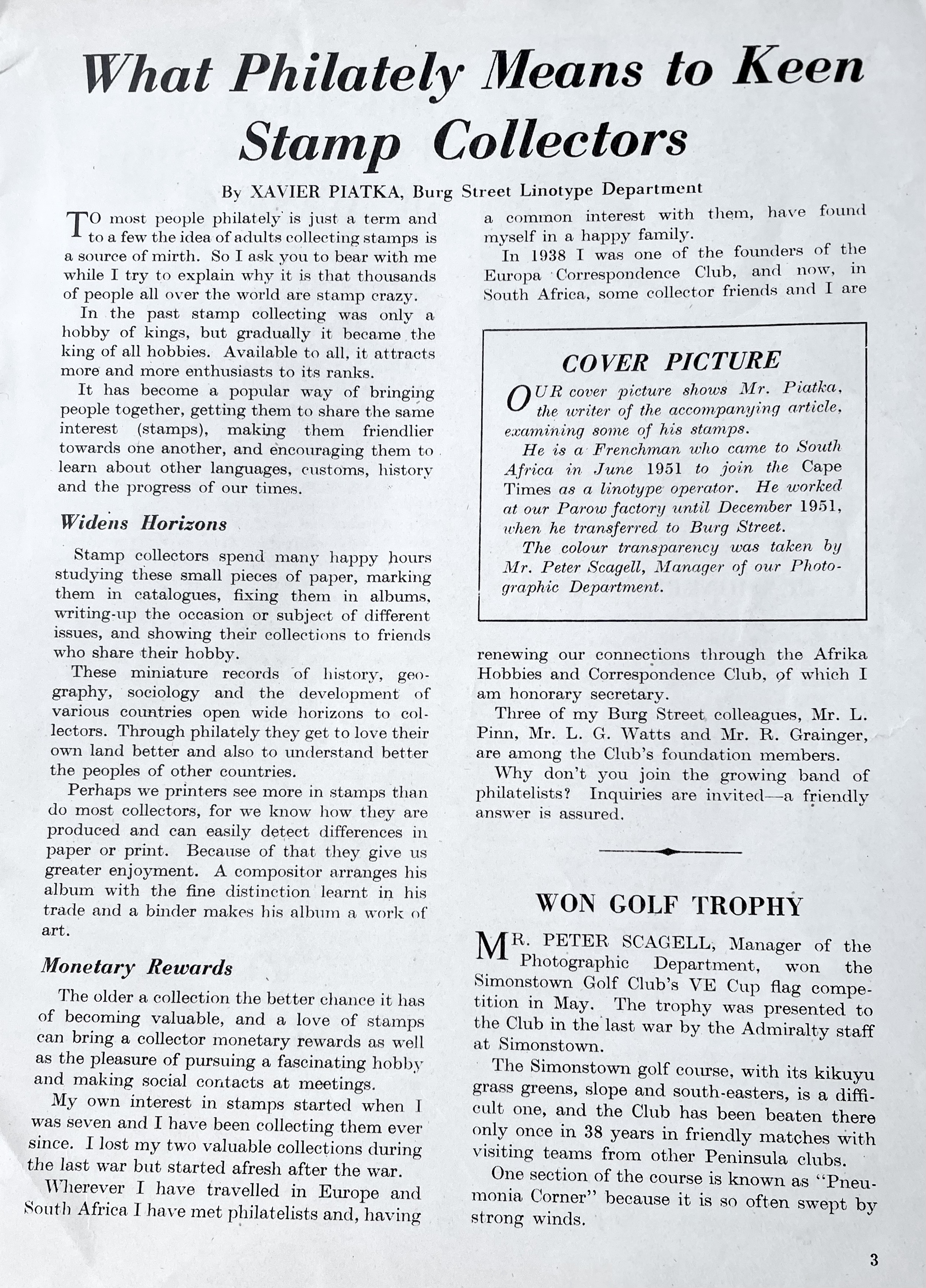 It was hard starting over with nothing, but Xavier was not afraid of hard work. During the days, he worked as a salesman for a printing shop in Parow, Premier Printing, owned by Israel Krupenia, a Vilna Landsman. He was also entering names and phone numbers for a Telephone Directory, but he needed more stimulation and more money. At night he worked as a linotype operator at the local Afrikaans newspaper, and on Saturdays from 5am – 2pm, did bookkeeping for a butcher shop in District Six. In the extra hours, he did fish deliveries on weekends and was sometime a tour guide for the Russian whalers docking in port.