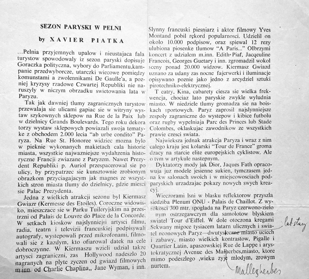 Once in Paris, Xavier was able to remain there legitimately with the help of an old school friend from Vilna he met at the Polish Embassy. Pavel Krubitsch, helped secure a job for Xavier as a cultural reporter for the Polish Daily publication, “Gazeta Polska” which was sponsored by the government, printed by the Imprimerie Richards in Bellevue, and owned by a Jewish immigrant from Lodz.