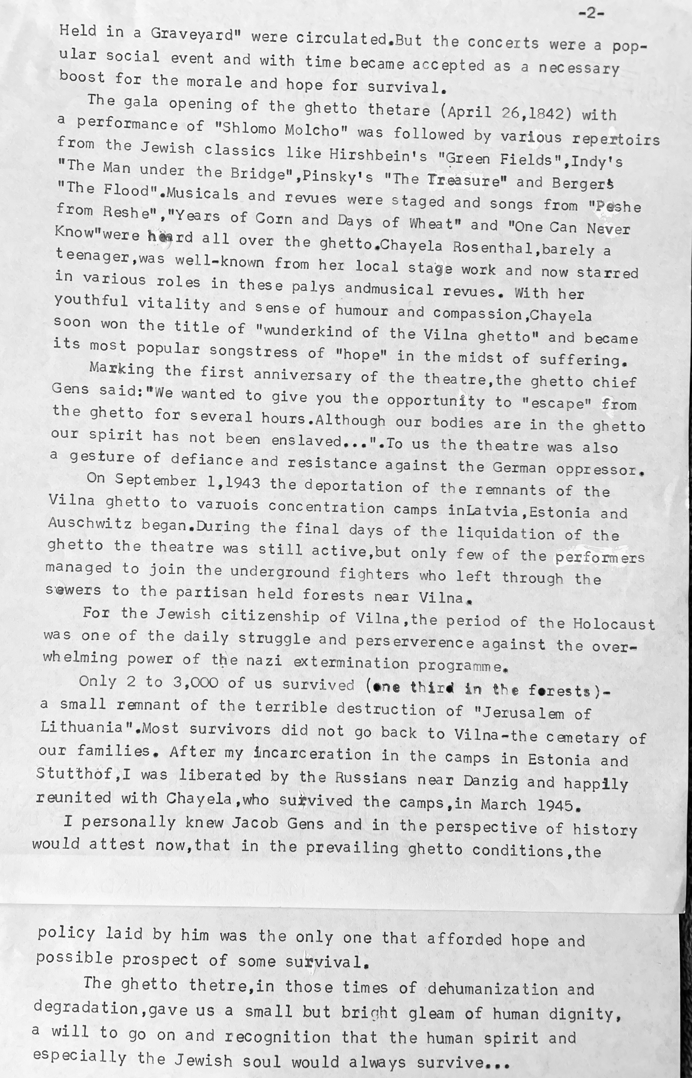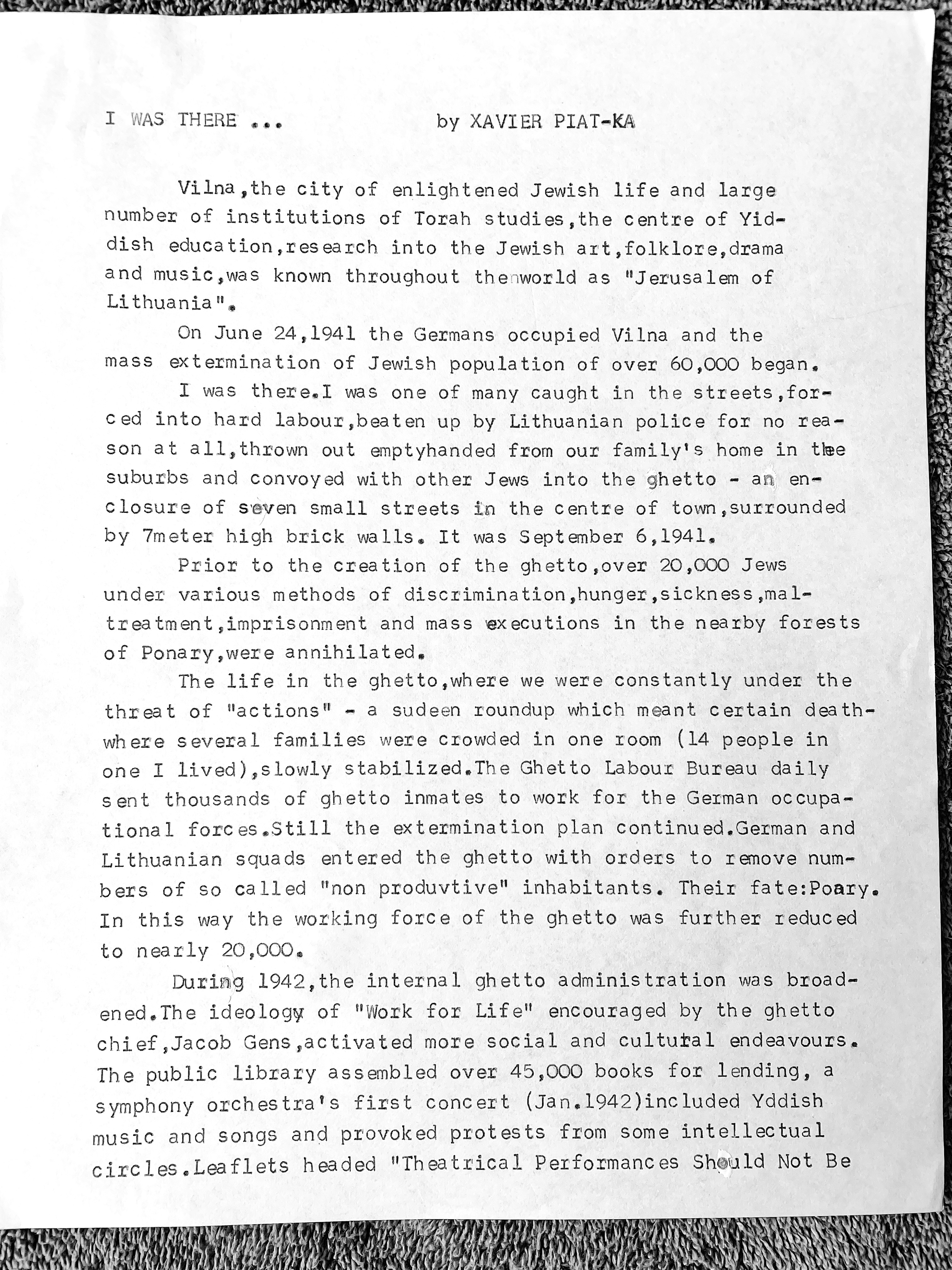 Zacharias survived the two years in the Vilna Ghetto that included escaping death during more aktions. Xavier also enjoyed reciting poems on stage at a few of the early entertainment evenings organized as part of the monthly meetings where leaders would update the people on work and other schedules and ghetto ongoings.