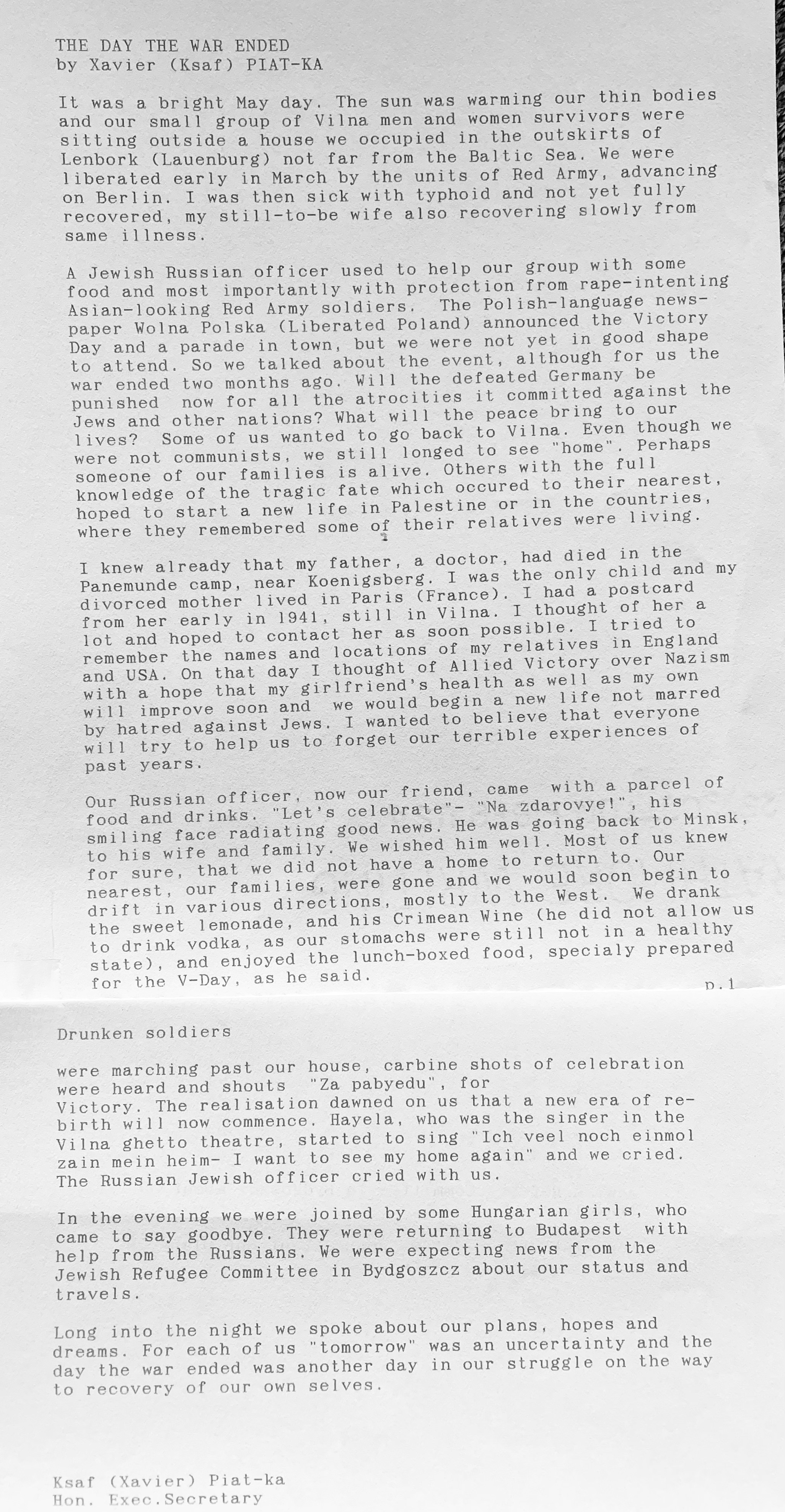Carrying Xavier on his shoulder, Malenker ran through the forest till he reached an old farmhouse. He barged in through the door, and ordered the old frightened German couple to find some strong alcohol and a bed for Xavier. With the schnaps, he washed down Xavier’s body to rid him of lice. A few days later Xavier awoke in a warm comfortable bed, like in a dream. It was then that Malenker told him that on 8 March, the Red Army had entered the camp they escaped from, to find most dead, but upon learning they were Jews, killed them all off too. Malenker had saved his life! Malenker also arranged for a horse and carriage to bring Xavier to a nearby town of Lembork to see a Doctor, where they learned that the Germans had finally been defeated. Along the way, they met some former camp inmates and decided to band together going forward for a while. Building their strength and finding lost family and friends became a priority as they celebrated ‘victory’ and freedom. Liberation for Xavier was dated by him as 9th March, 1945.