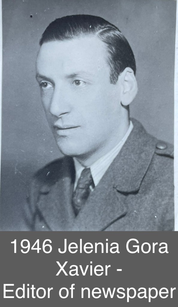 Xavier also worked in Legnica and in the Autumn of 1945, was transferred to Hirschberg, Jelenia Gora – a beautiful tourist destination town at the foot of Snieszka Mountain, near Cieplice (meaning Warmbath), which had a spa/health sanatorium, where he was treated with hot mud baths and physiotherapy for his painful back. Xavier soon became editor of the local communist newspaper there, Trybuna Dolnoslaska. He could finally afford to buy a three roomed apartment, a car, a piano, radio, heaters, electric kitchen appliances, Encyclopedia Brittanica and could afford a housemaid for cleaning.